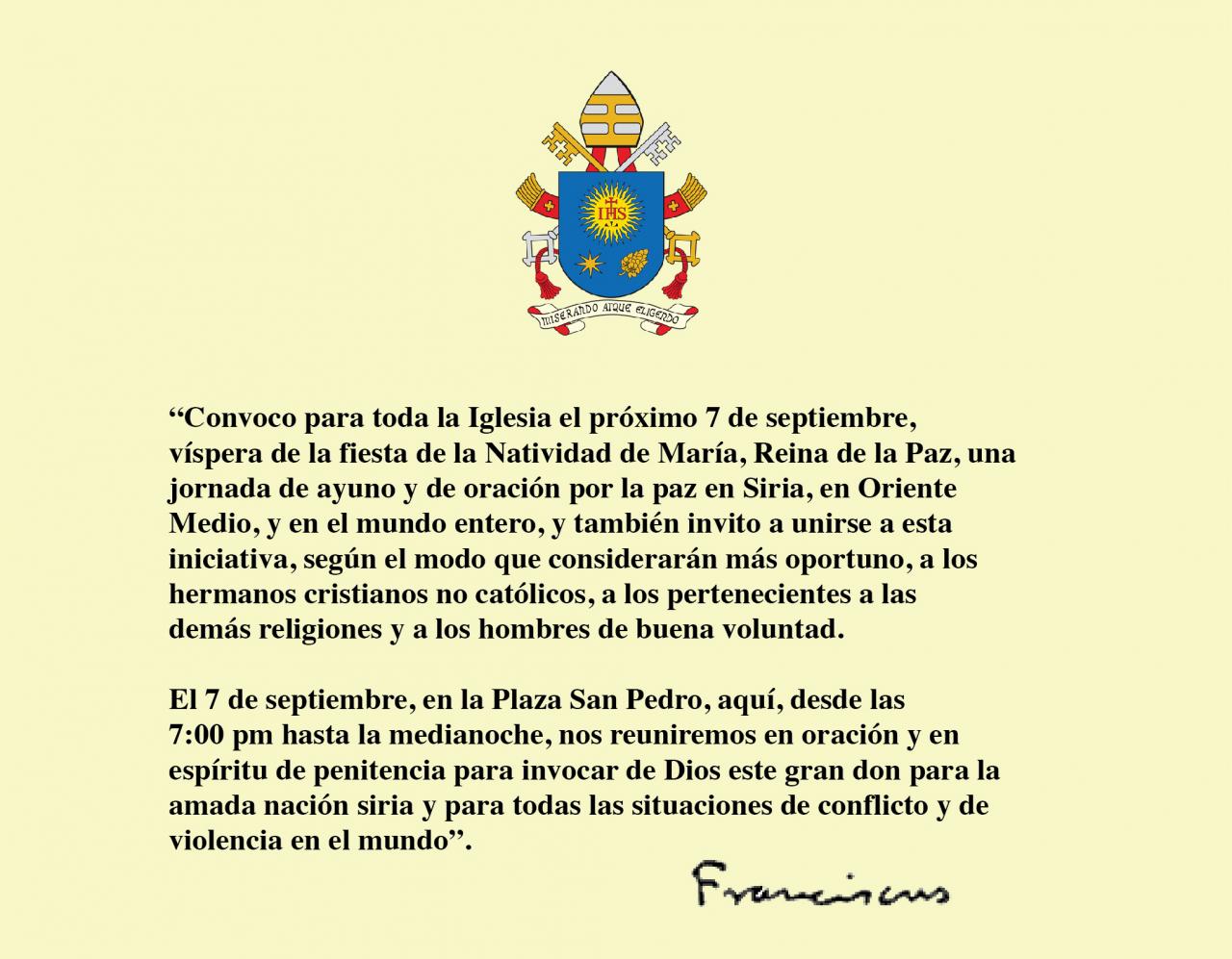 “Ayúdanos a orar por Siria” By celimer_torres@pucpr.edu | September 5, 2014 Se incluye mensaje del Santo Papa Francisco en relación con una jornada de ayuno y oración por la paz. Posted in General ← Se apoderan de FranciaCuentos y otras Menudencias →