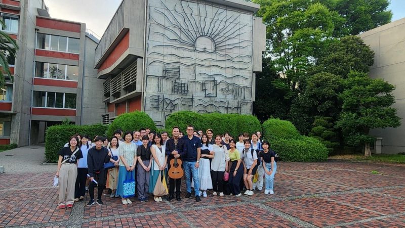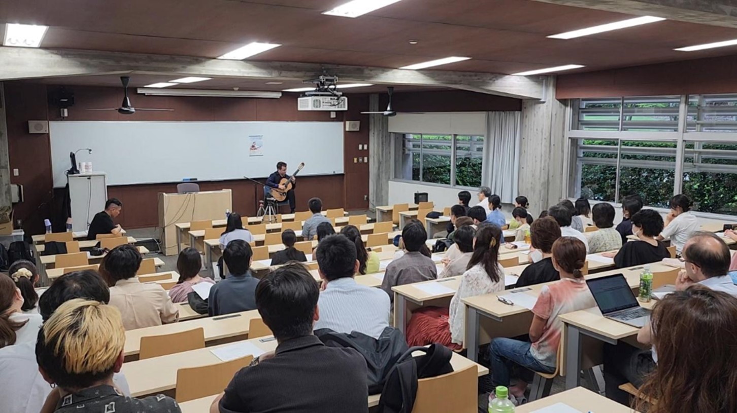 El Dr. Ruiz ofreció un recital de guitarra sola en Nanzan University, donde interpretó piezas de destacados compositores latinoamericanos como Antonio Lauro, Agustín Barrios, Manuel Gregorio Tavares, Miguel Cubano y Juan Francisco Acosta. La presentación en esta universidad fue posible gracias al apoyo del Dr. Takakazu Yamagishi, vicepresidente de Relaciones Internacionales de Nanzan University, y del Dr. Arturo Escandón, director del Centro de Estudios Latinoamericanos de la misma institución. “Ayer tuvimos el recital de guitarra de Hermelindo Ruiz Mestre en Nanzan con piezas originales y del repertorio clásico hispanoamericano. Fue un recital muy emotivo, de texturas y armonías musicales muy variadas. Se nos quedarán para siempre en el corazón ‘Flores, café y tu sonrisa’ y el colofón ‘Estrellita'”, expresó el Dr. Escandón.
