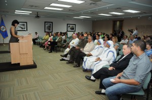 A continuación, el Dr. Vélez Arocho ofreció una conferencia titulada Madre Teresa de Calcuta…una voz de Dios. En su charla, el Presidente mencionó algunas frases que pronunciara la Madre Teresa en ocasión de recibir un doctorado Honoris Causa, de parte de la Universidad el 5 de julio de 1986, fecha desde la cual esta Sala lleva su nombre. El Presidente tuvo la oportunidad de reencontrarse con la Madre Teresa cuando asistió al Congreso de la Familia, en Roma, en 1994. De ese momento retoma las palabras expresadas por la Madre Teresa: “Bendita es la familia que reza unida porque el fruto de la oración es un corazón limpio y un corazón limpio, puede ver a Dios Si nosotros podemos ver a Dios en cada uno de nuestros hermanos, nos resultará más fácil amarnos los unos a los otros”.