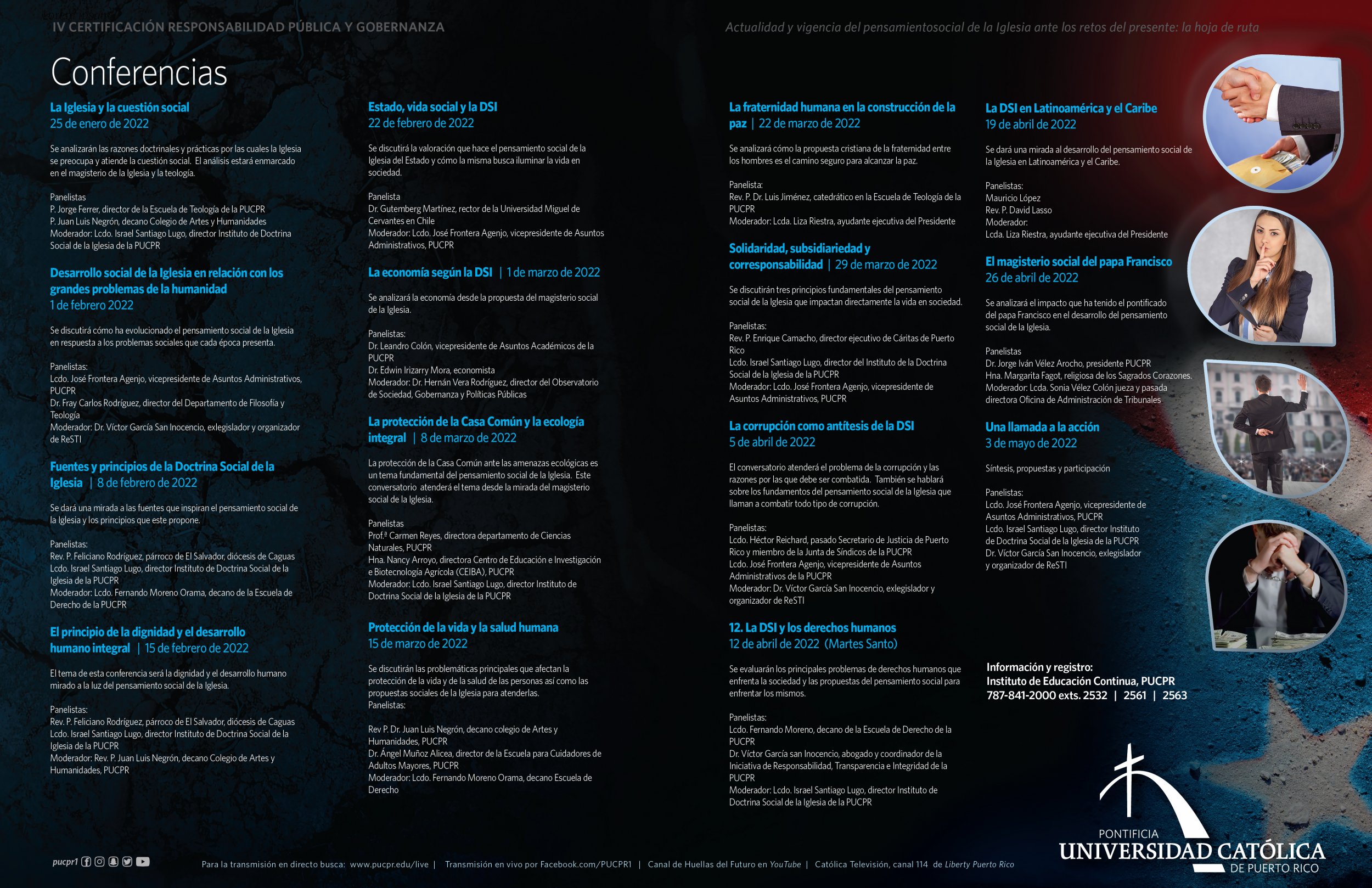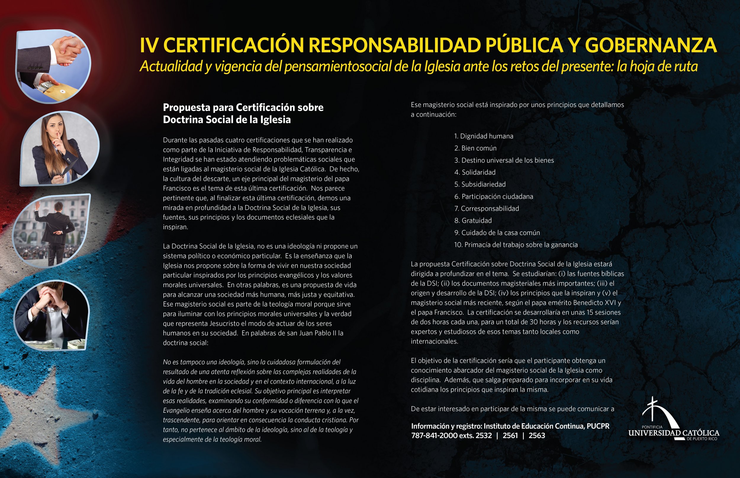 El Instituto de Doctrina Social de la Iglesia (DSI) en conjunto con el proyecto de Responsabilidad social, Transparencia e Integridad de la PUCPR presentaron esta certificación libre de costo que consta de 30 horas contacto.
