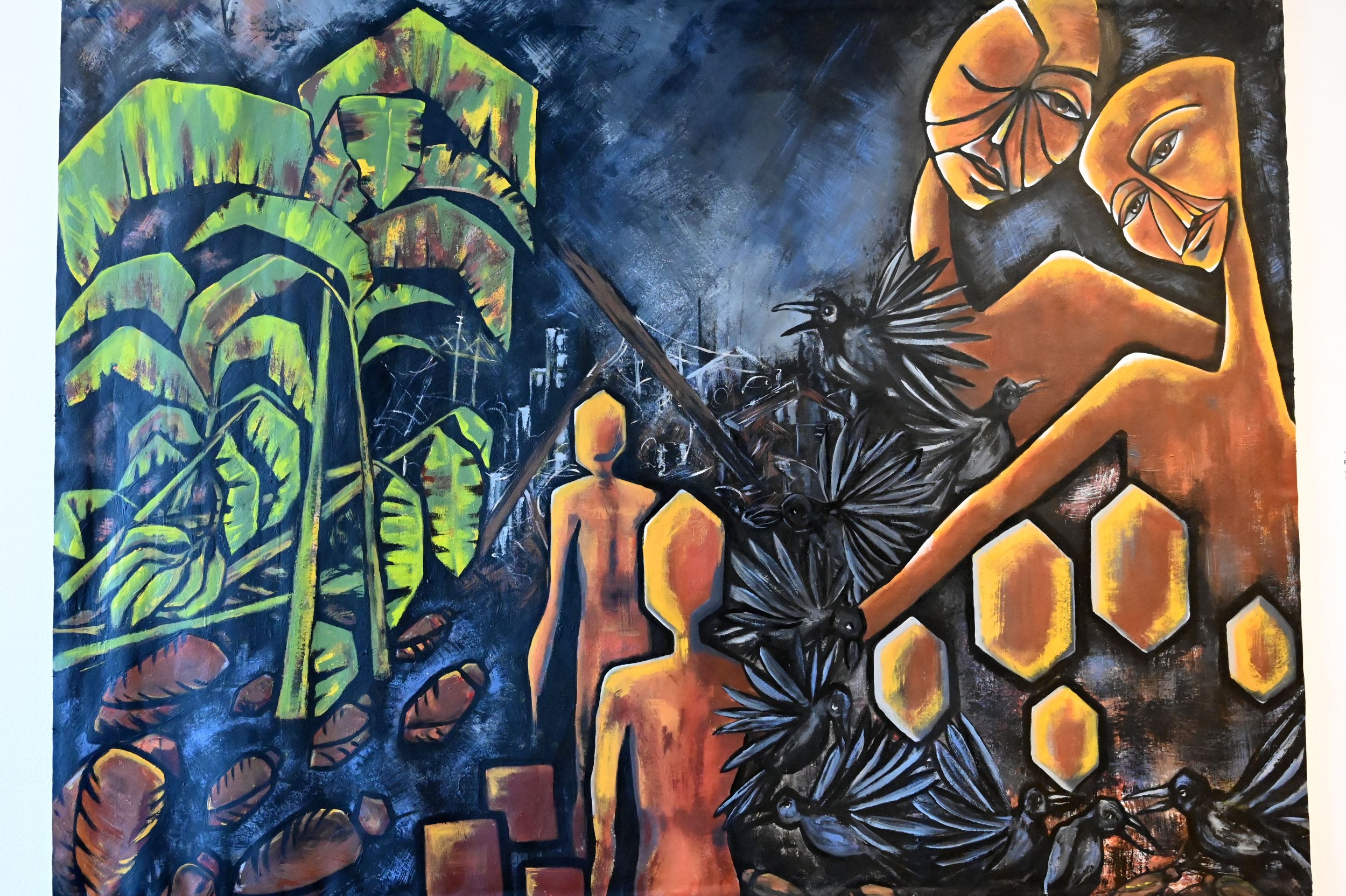 “Las artistas están exhibiendo una serie de 4 pinturas en acrílico sobre pellón que es una tela particular que se usa en el muralismo, 3 de ellas son individuales y 1 es una pintura colectiva. Alerta. Amorfa es el título de la exposición. Alerta por el estatus actual del país en general, pero también de manera especial en el área sur y Amorfa porque no tiene forma, porque aún está cuajándose, porque como país estamos en esa espera que desespera para que el pueblo se despierte. Aquí hay mucho que perder si seguimos silentes y es esa espera de que los lideres civiles, sociales, culturales y gubernamentales se pongan para su número y se rescate el patrimonio cultural, particularmente edificado, pero que también repercute en el estado espiritual, emocional y psicológico del pueblo. Así que un poco es una alerta amorosa para que despertemos del letargo que hemos sufrido a raíz de los huracanes, temblores, tormentas y pandemia” explicó la Prof.ª Burgos.