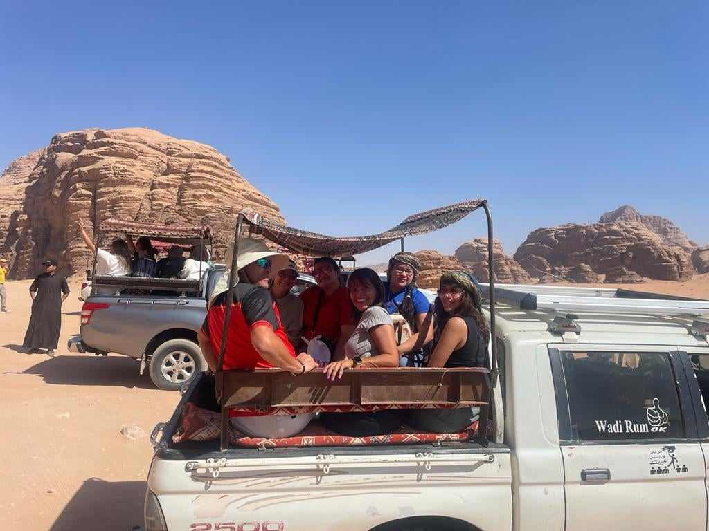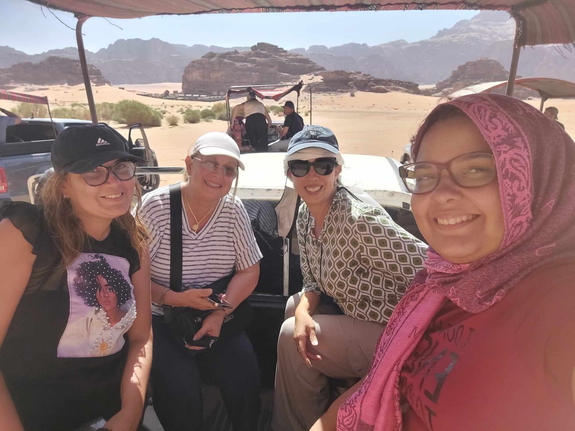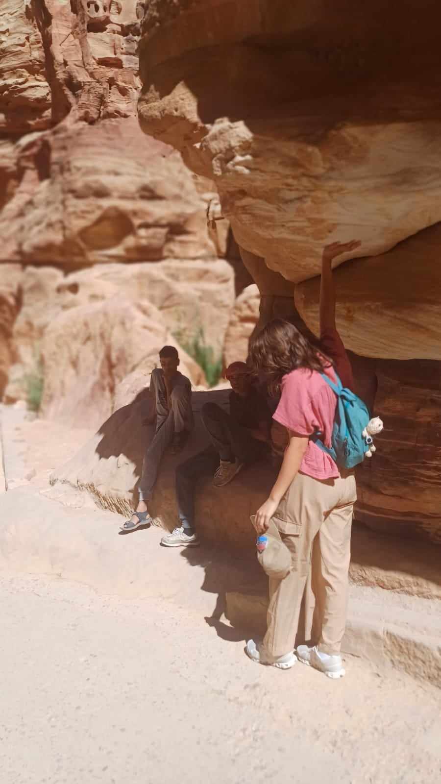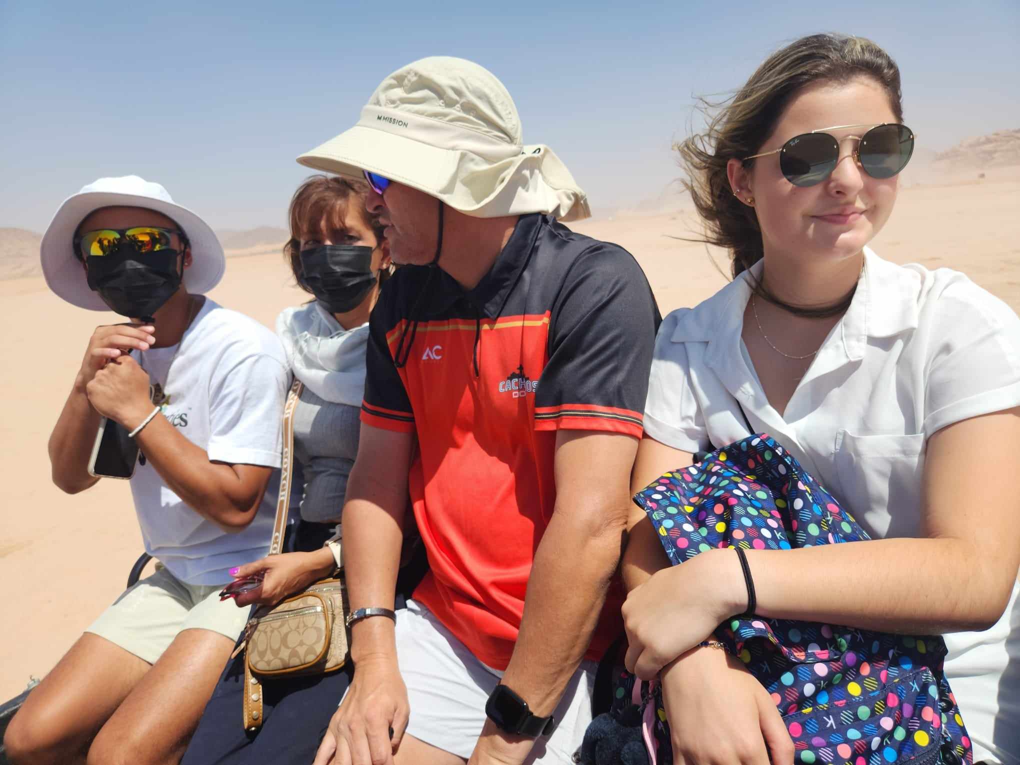 Fue así como llegaron a un espacio nuevo para todos: el desierto. Un escenario de arena, seco,  intenso sol y enfiladas montañas de piedra arenisca sorprendió al grupo. Allí disfrutaron de una excursión 4 X 4, en una sorprendente aventura y almorzaron con los habitantes locales, los beduinos que vivían en su campamento.  Se enamoraron de los dromedarios o camellos  y le siguieron los pasos a la huella de la historia de los nabateos, tribu que se conoce por la evolución de la construcción en piedras y petroglifos.