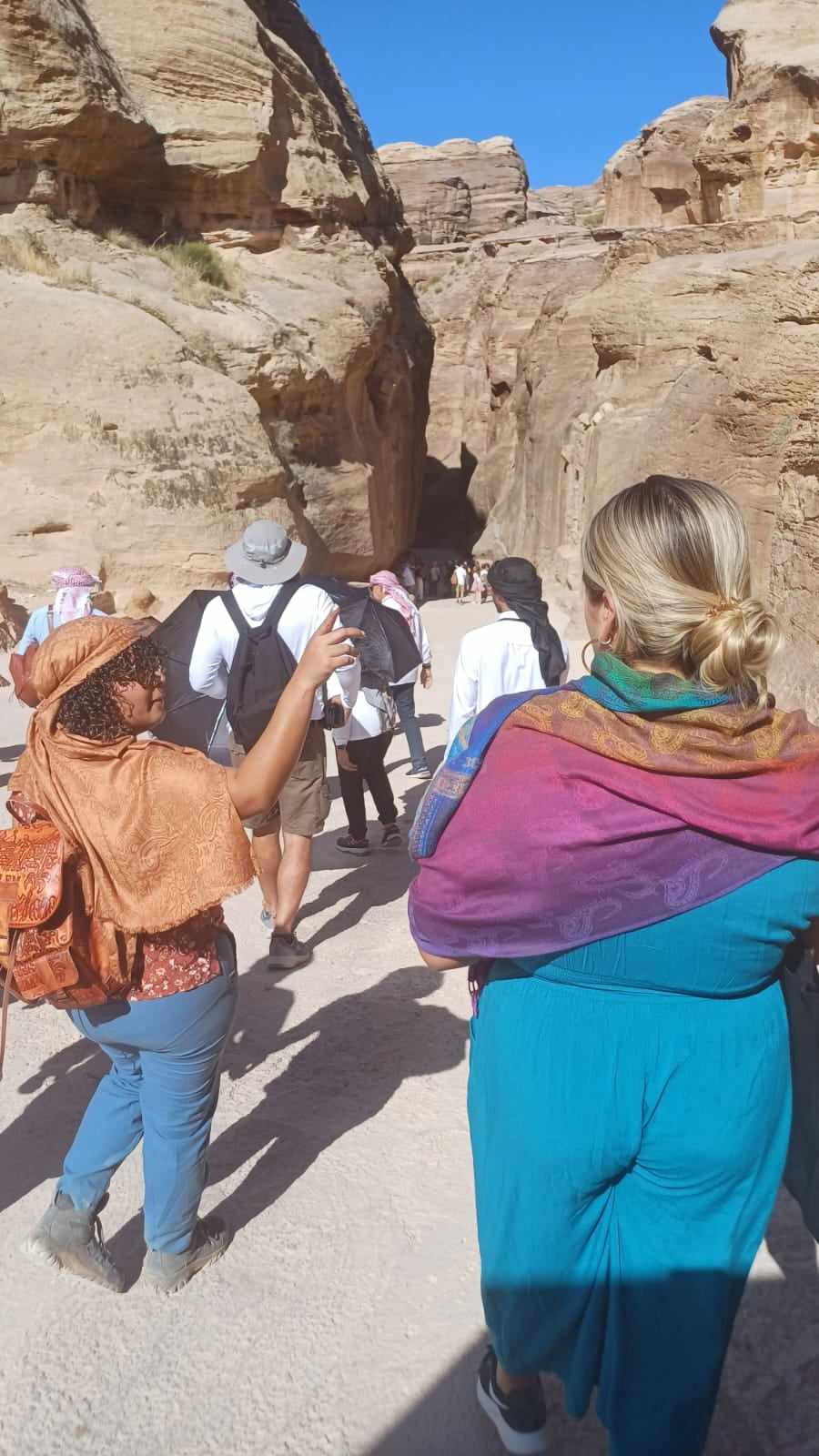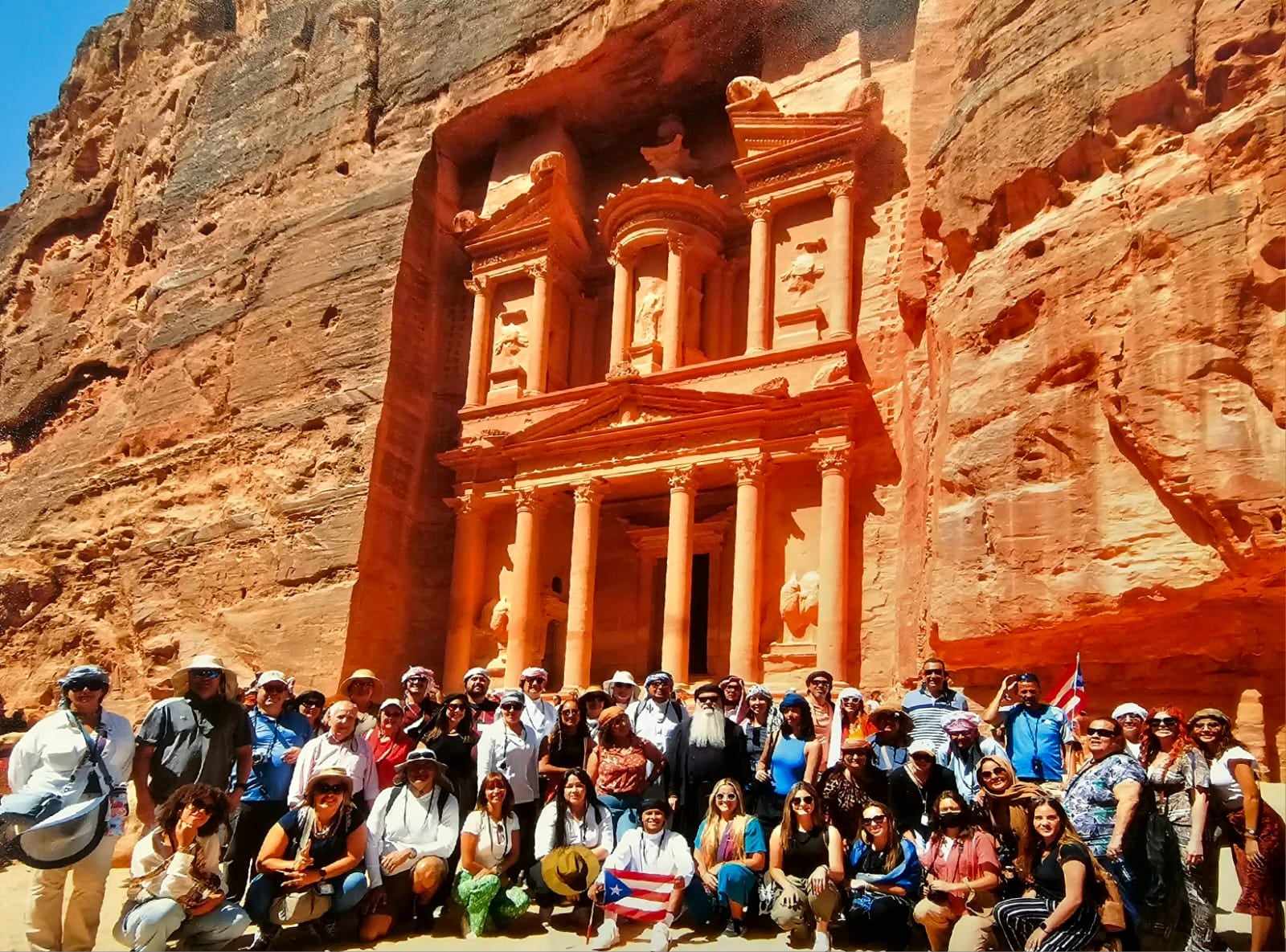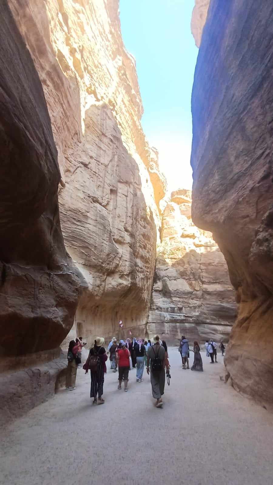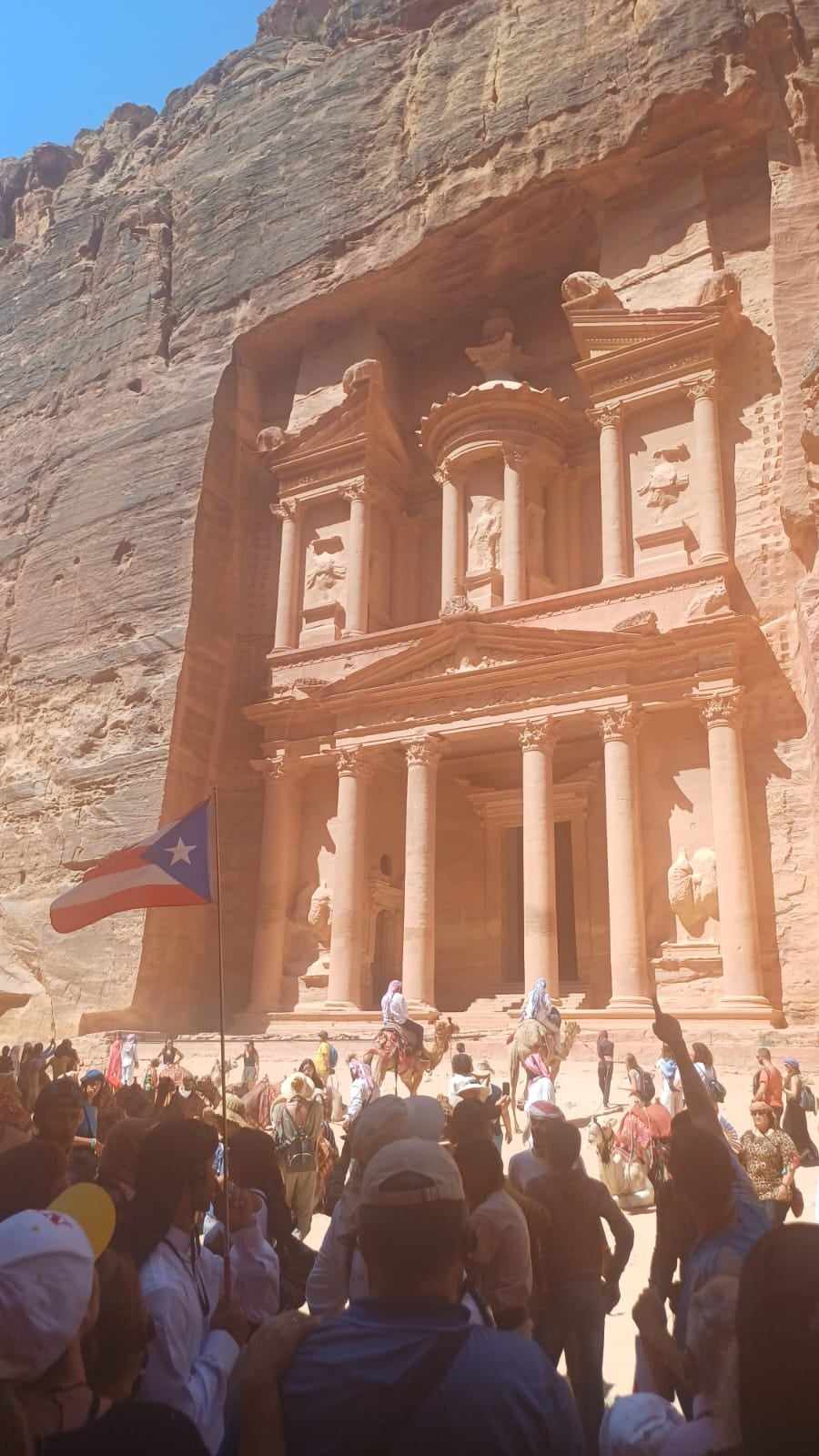 El día culminó en Moti Musa en Petra. Al otro día, llegaron hasta el desfiladero de Siq, un yacimiento impresionante de la época de los nabateos. Desde el inicio del estrecho sendero era inevitable admirar el escenario. Fascinantes rocas arenizas con un auténtico festival de colores naturales que guardan años de historia. Caminaron en medio de este hermoso sendero por cerca de 3 kilómetros. Pero este lugar no deslumbró tanto como la obra que los esperaba al final del trayecto. Quedaron impresionados ante el gran monumento arqueológico, el tesoro de Petra:  tumba y monasterio del rey nabateo Aretas Cueto.