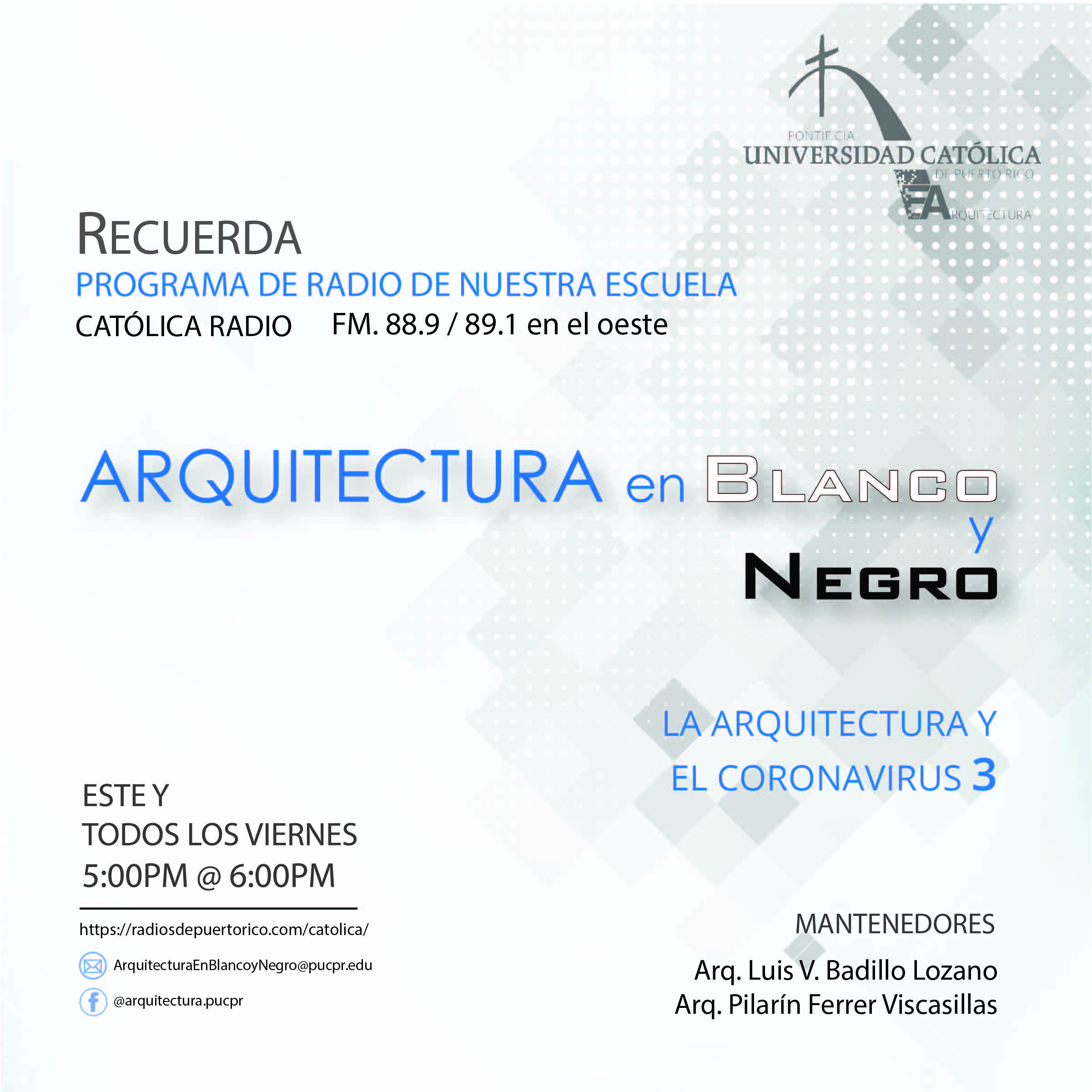 Arquitectura en Blanco y Negro By celimer_torres@pucpr.edu | April 30, 2020 Sintoniza Católica Radio los viernes a las 5:00 p.m. y conoce de urbanismo, infraestructura y diseño Posted in General ← Presente la figura de Rafael Hernández ColónLa Católica ofrece alternativas para sistema de calificaciones →