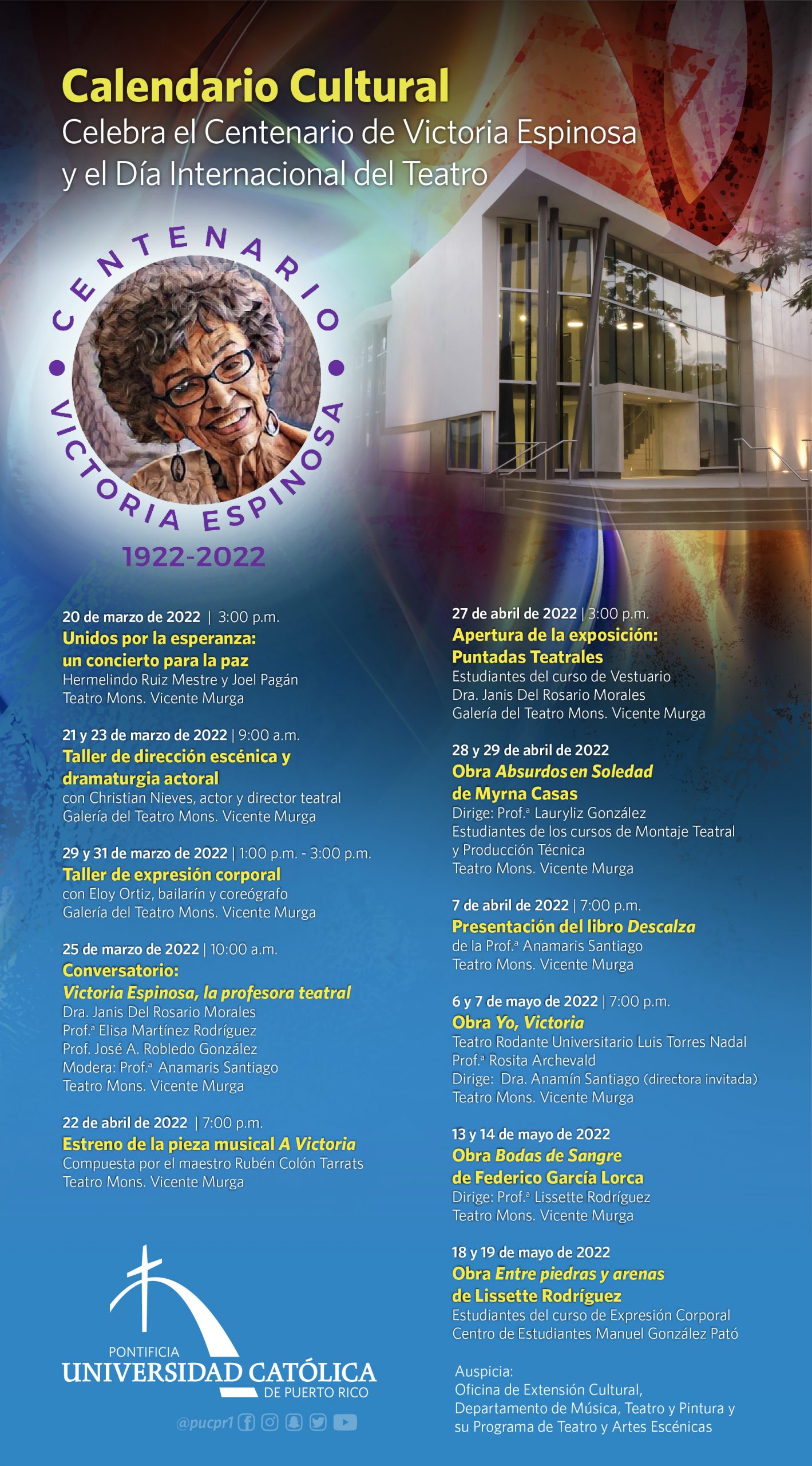 ¡Arranca la agenda cultural! By celimer_torres@pucpr.edu | March 24, 2022 El itinerario de eventos conmemora el Centenario de Victoria Espinosa y el Día Internacional del Teatro. Posted in General ← Conferencia La reparación del duelo a través de los sueños: un acercamiento desde el psicoanálisis¿Te apasiona la música coral? →