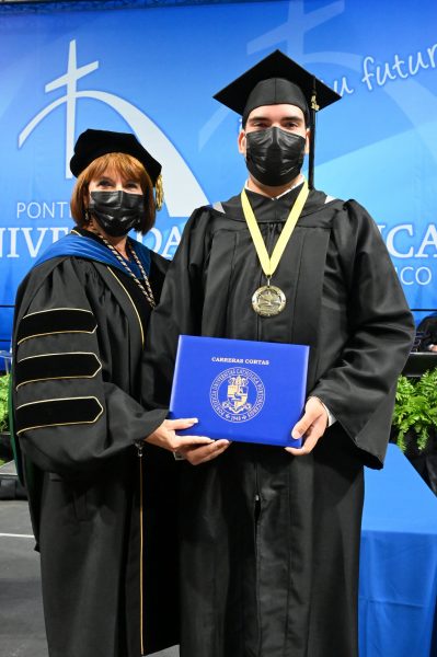 Durante la ceremonia se distinguieron varios estudiantes cuyas historias de superación son inspiradoras. Gabriela González, quien obtuvo una Maestría en Educación en Consejería Profesional, quien es militar, es una de estas historias. “Recibir mi grado de maestría me hace sentir tan orgullosa. Fue un camino largo y fuerte, pero se pudo. Con Dios todo se puede y le doy las gracias a la Pontificia Universidad Católica de Puerto Rico por prepararme para mi próximo paso profesional como terapista clínica” expresó.