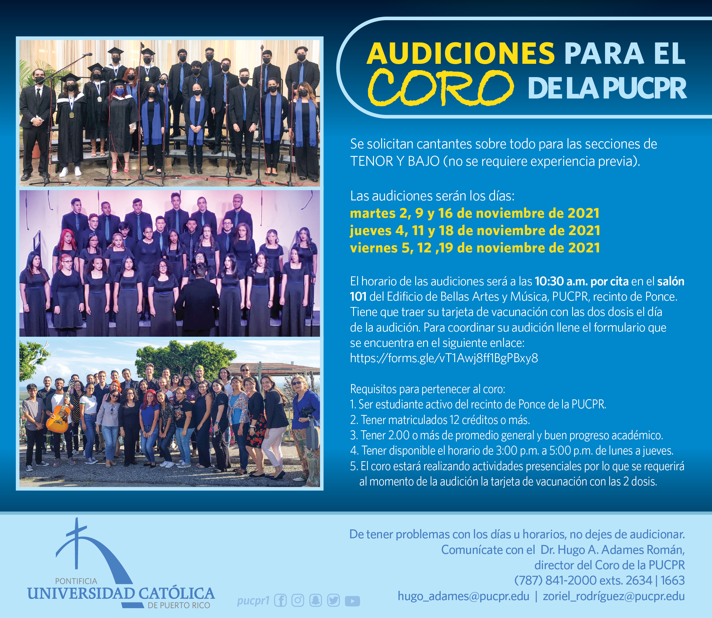 Audiciona para el Coro By celimer_torres@pucpr.edu | November 4, 2021 Demuestra tu talento y forma parte de la agupación. Posted in General ← ¡Celebran en grande los Pioneros!El racismo como eje central del próximo conversatorio de la III Certificación en Responsabilidad Pública y Gobernanza. →