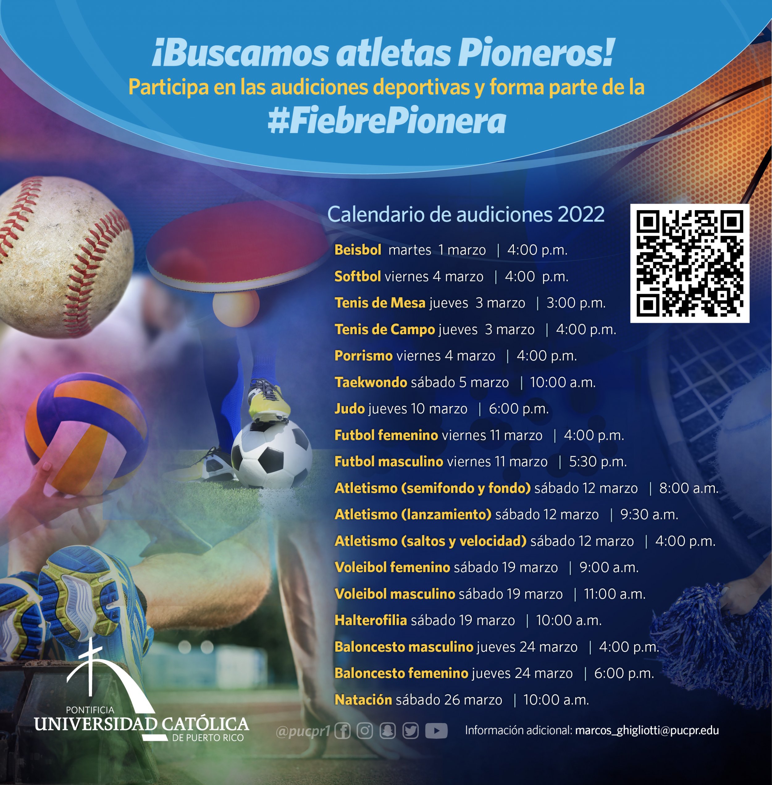 ¡Buscamos atletas Pioneros! By celimer_torres@pucpr.edu | February 24, 2022 Participa en las audiciones deportivas y forma parte de la #FiebrePionera Posted in General ← Estado, vida social y la Doctrina Social de la Iglesia Open House Programa Tecnología Cardiovascular No Invasiva →