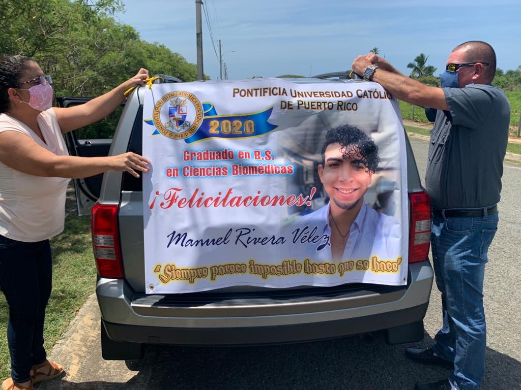 Awilda Ramos, madre orgullosa del Pionero Diangelo Pina Ramos, graduando del colegio de Ciencias de La Católica quiso celebrar los logros de su hijo de forma particular.  La señora Ramos le presentó a la Prof. Jennilka Garriga de Jesús, catedrática del Colegio de Ciencias,  su deseo de reconocer el esfuerzo de su hijo y otros compañeros a través de una ceremonia simbólica y un recorrido por el pueblo de Isabela. “La madre  de Diangelo Pina Ramos se mostró muy agradecida por los valores y el cariño que su hijo ha recibido de la Universidad. Me extendió una invitación a su casa para celebrar con su familia y amigos una bendición a los graduandos del Colegio de Ciencias de la PUCPR y darles una pequeña ceremonia simbólica que destacara el gran esfuerzo que han tenido que enfrentar estos estudiantes para culminar su grado. Sin dudarlo acepté inmediatamente, porque para mí no hay placer más grande que ver encaminados a estos jóvenes quienes a pesar de estar comenzando en la vida adulta, tienen muy bien establecidas sus metas” explicó la profesora.