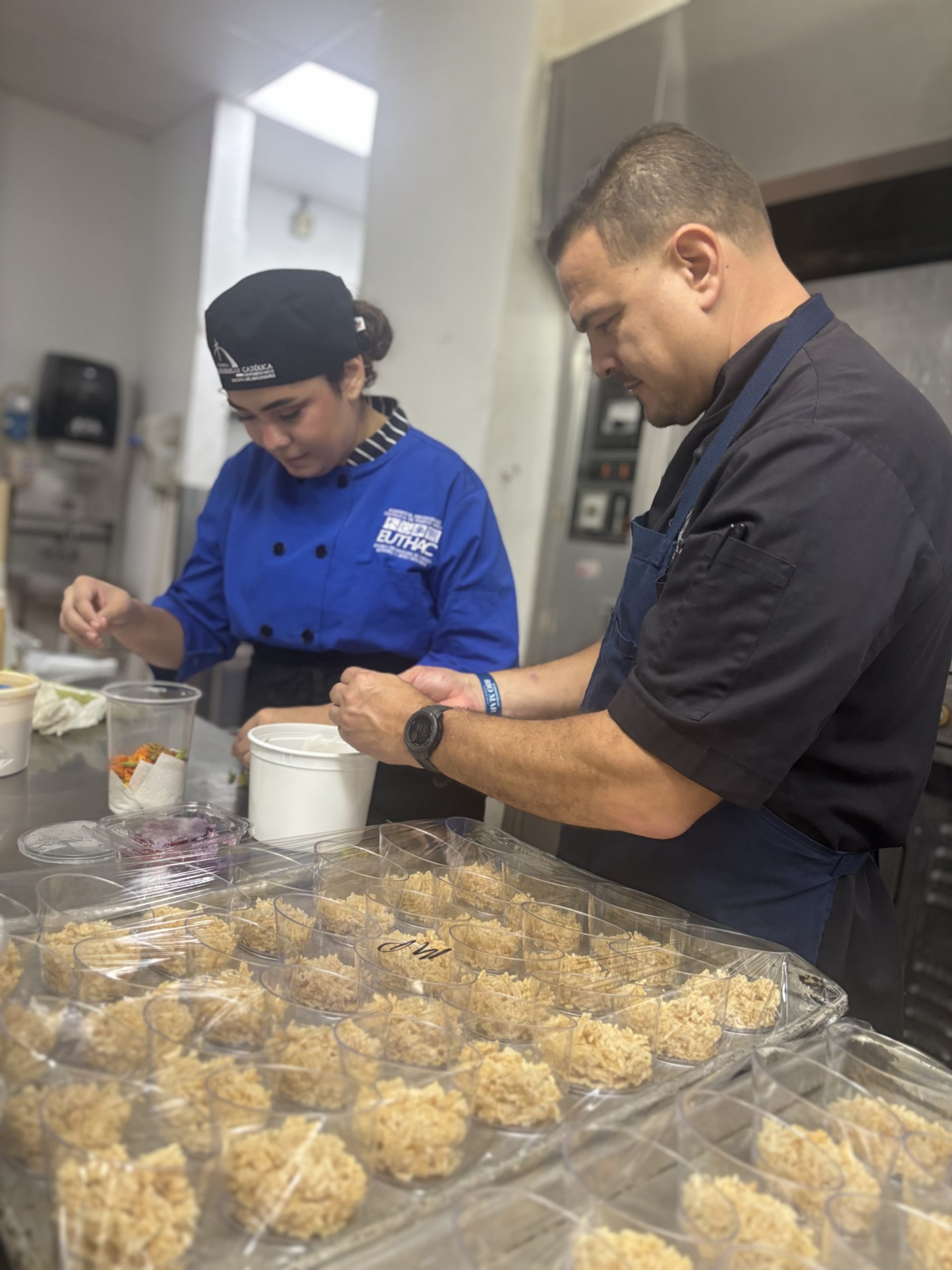 Con su uniforme de chef que resalta el logo de EUTHAC y de La Católica, preparaba cuidadosamente un plato de la mano de uno de los conocidos expertos culinarios, Mario Pagán.