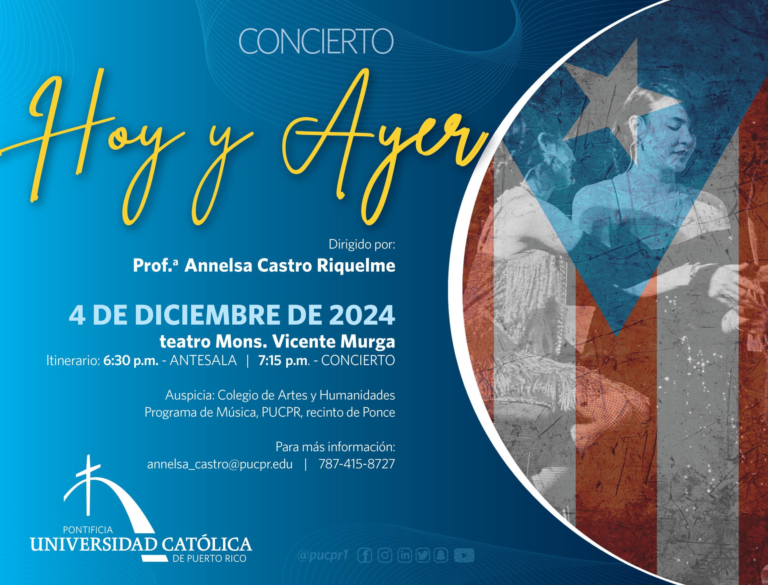Concierto “Hoy y ayer” By celimer_torres@pucpr.edu | November 1, 2024 El recital es presentado por el Colegio de Artes y Humanidades y el Programa de Música Posted in General ← Ensayos básicos para la gestión pública iberoamericanaCelebremos nuestra puertorriqueñidad →