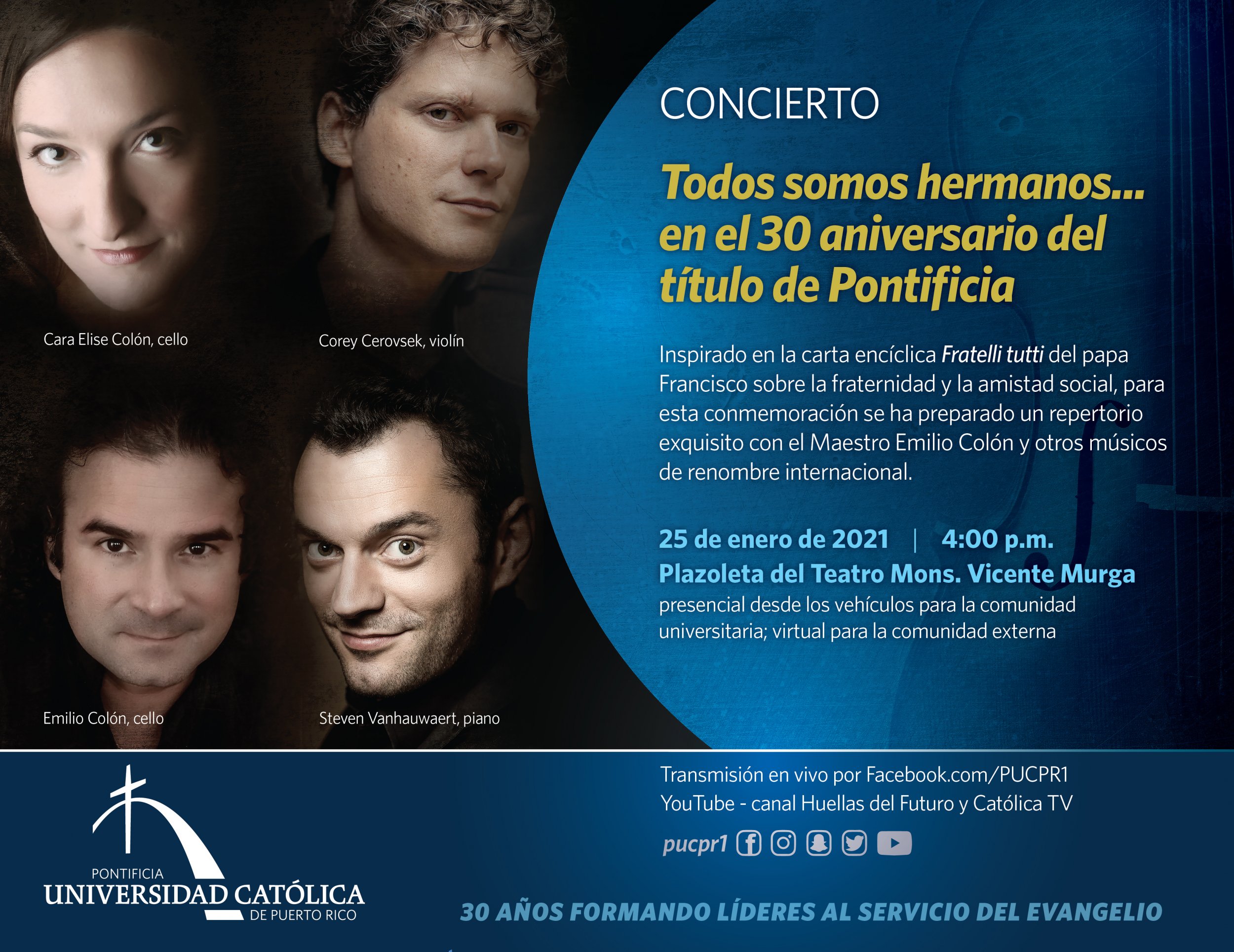 Concierto Todos somos hermanos…en el 30 aniversario del título de Pontificia By celimer_torres@pucpr.edu | January 21, 2021 El evento está inspirado en el llamado de papa Francisco a la fraternidad y la amistad social. Posted in General ← Misa de Acción de Gracias por la concesión del título de Pontificia e Inicio de CursoLa música que nos une: unión fraterno musical para celebrar 30 años del título de Pontificia →