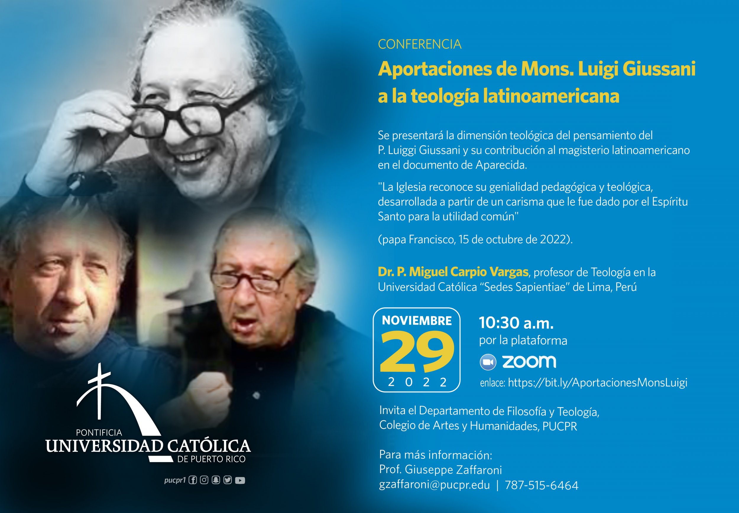 Conferencia Aportaciones de Mons. Luigi Giussani a la teología latinoamericana By celimer_torres@pucpr.edu | November 21, 2022 El sacerdote es reconocido por su aportación al documento de Aparecida. Registro al evento a través de ZOOM Posted in General ← ¡Los Pioneros corren y compiten sanamente en la carrera de Acción de Gracias!Conversatorio Futuro Energético →
