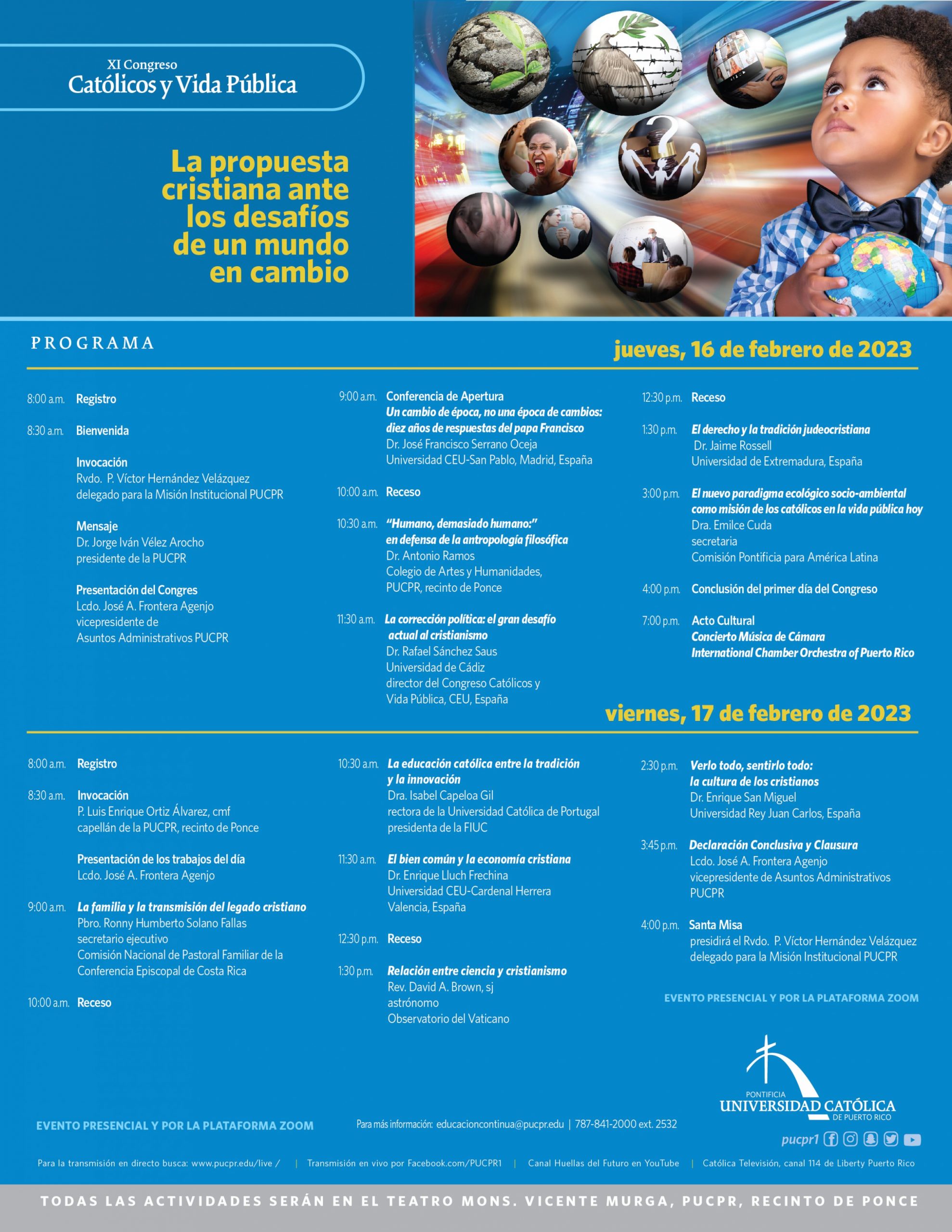 ¡Conoce los ponentes y las conferencias del XI Congreso Católicos y Vida Pública! By celimer_torres@pucpr.edu | January 26, 2023 Personalidades internacionales expondrán sobre el rol del cristianismo en la vida contemporánea. Registro virtual (por ZOOM) XI Congreso Católicos y Vida Pública Registro presencial XI Congreso Católicos y Vida Pública Posted in General ← ¿Ya tienes la vacuna bivalente?“La propuesta de futuro tiene que estar cimentada en nuestra identidad y misión” →