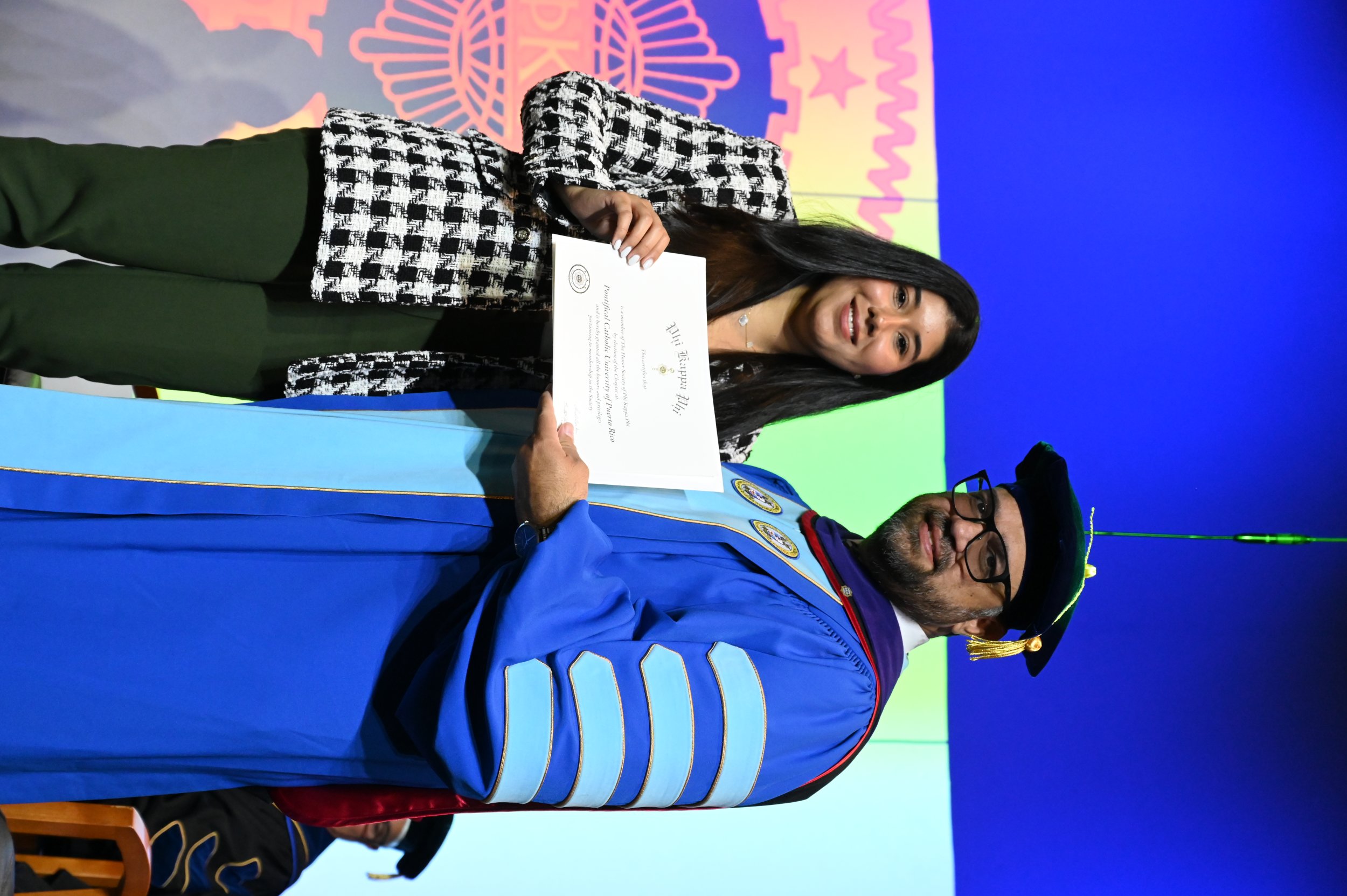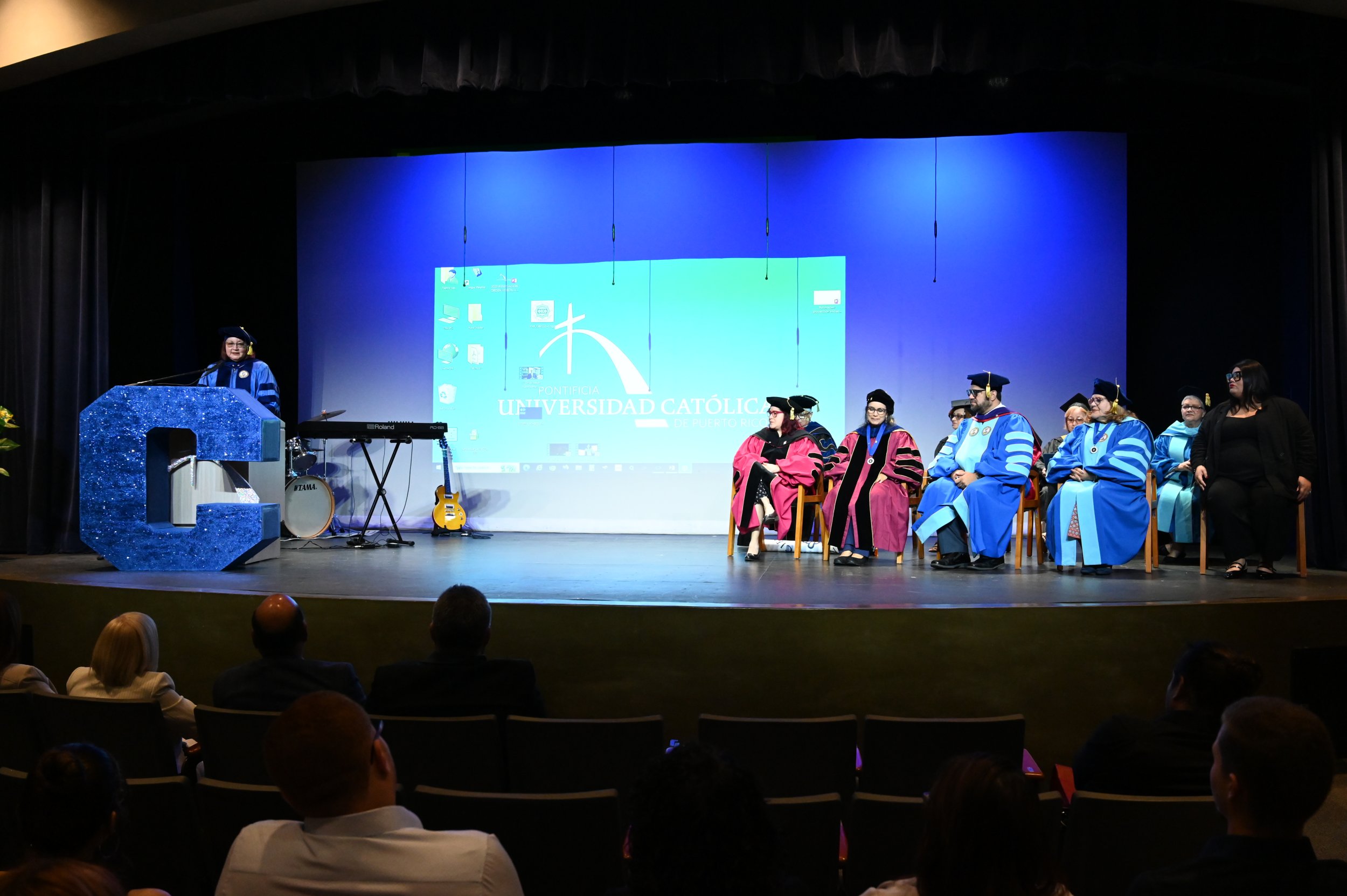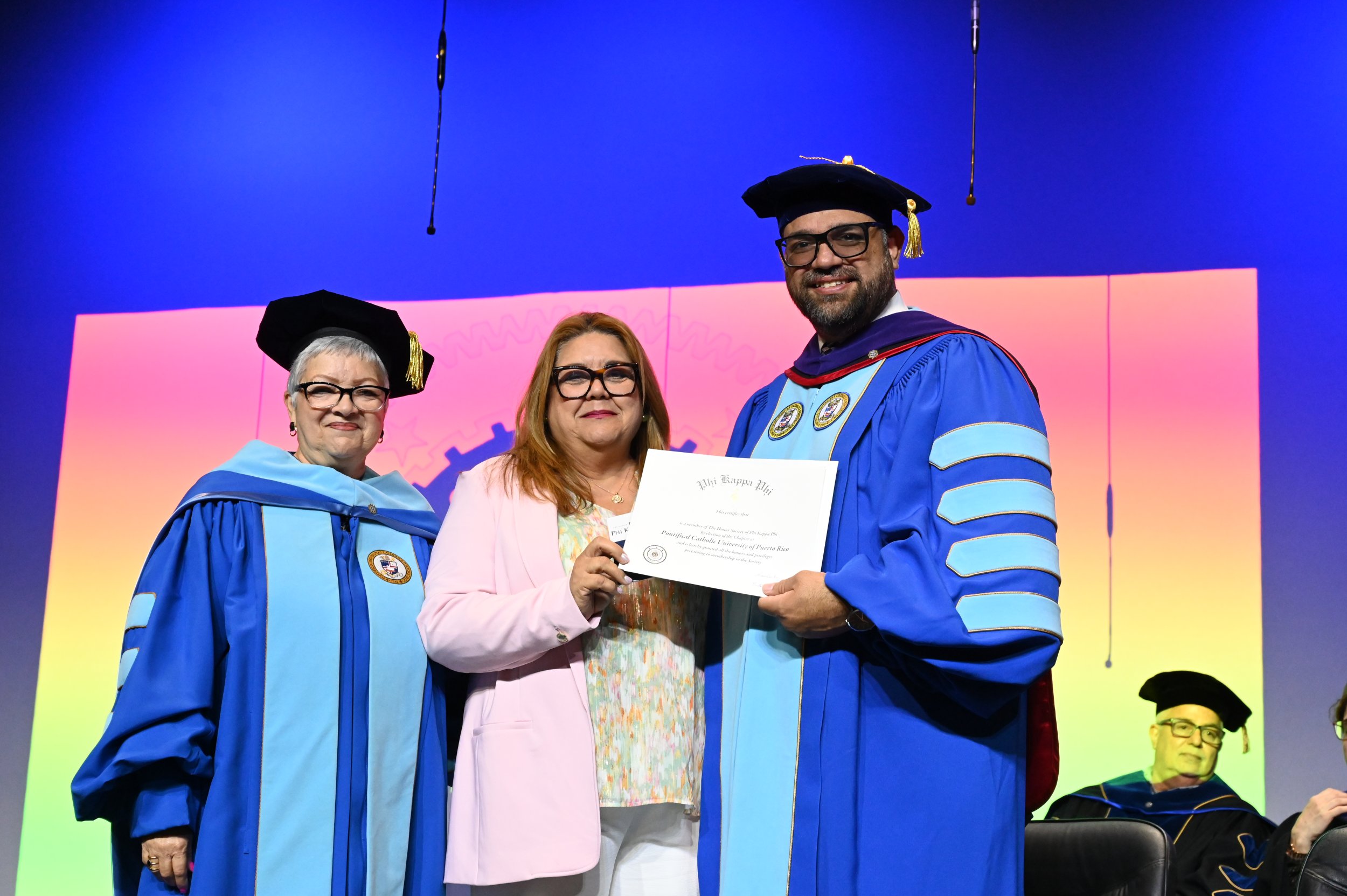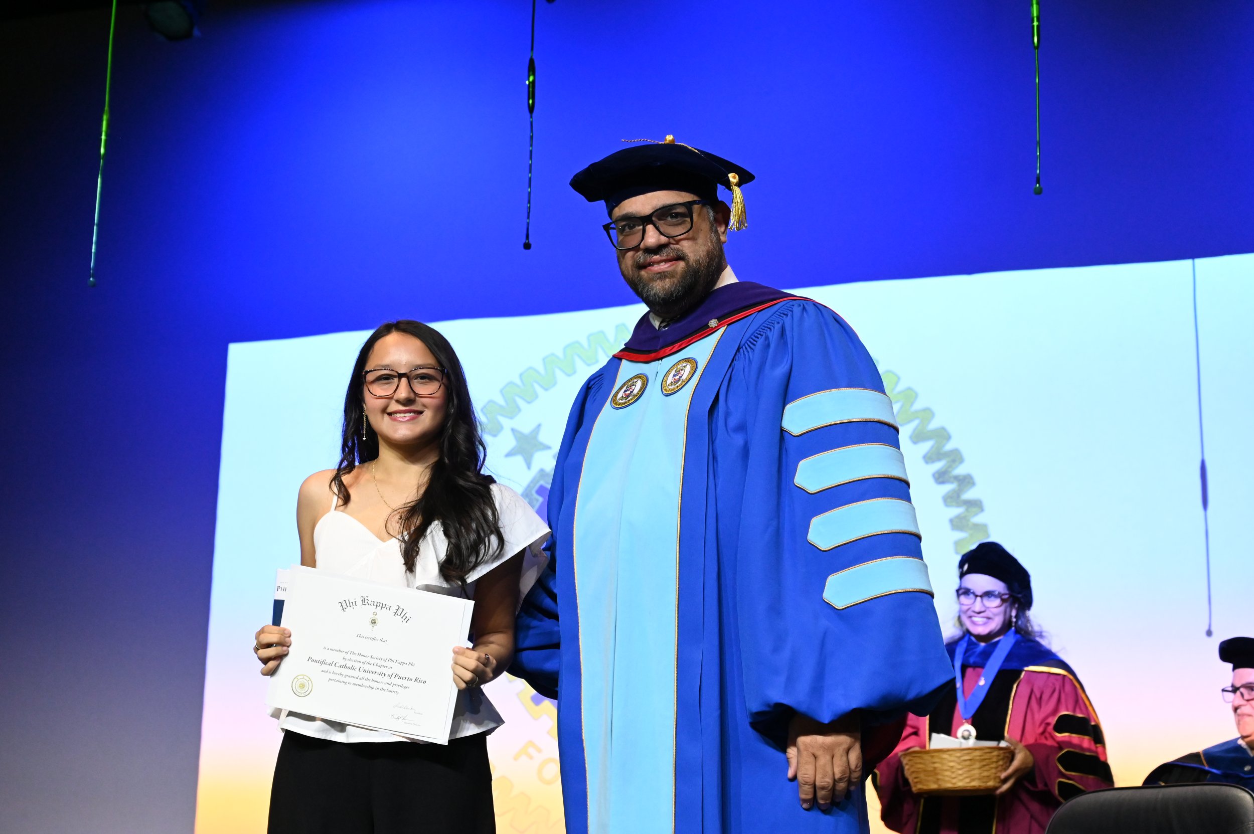 “Celebramos la iniciación de los nuevos miembros de la sociedad de honor Phi Kappa Phi que es la sociedad de honor más estricta y de más alto calibre a nivel mundial. En esta edición tuvimos aproximadamente 40 miembros dentro del estudiantado, tanto de bachillerato como a nivel graduado, la facultad y el staff.  En cuanto a la comunidad universitaria, esto representa menos del 2% de la comunidad entre la facultad, los empleados y los estudiantes que puedan cualificar para esa invitación a la membresía. Nuestro capítulo es uno de dos capítulos en Puerto Rico y es el único que está activo al momento y que ha sido reconocido desde su comienzo como uno de excelencia y que ha ganado premios todos los años por las actividades que lleva a cabo, por los miembros que pertenecen, etc. Nuestras iniciaciones son de las más grandes a nivel nacional. Todos los años somos de los capítulos más grandes con estas iniciaciones, porque hay unos estándares también bien estrictos para cumplir, pero aún así logramos cumplir con todos ellos” explicó la Dra. Mónica Arroyo, presidenta del capítulo de PKP en la PUCPR.