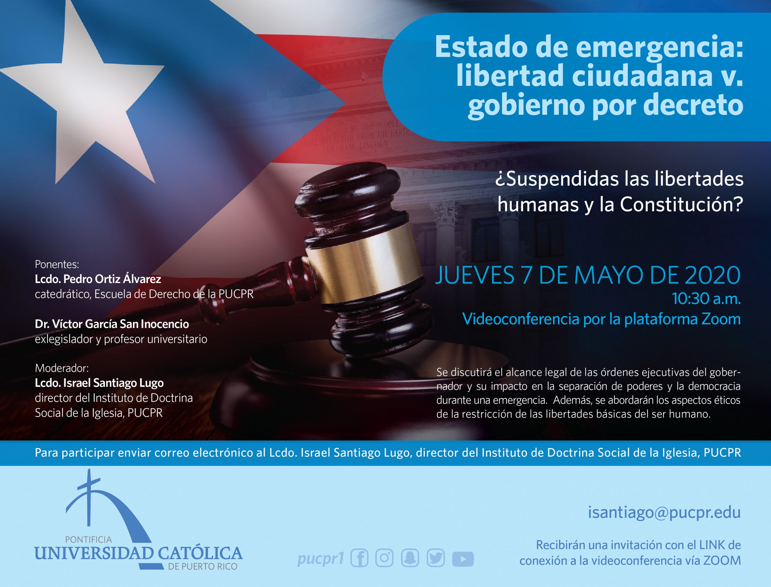 Conversatorio virtual Estado de Emergencia: libertad ciudadana v. gobierno por decreto By celimer_torres@pucpr.edu | May 4, 2020 El evento es presentado por el Instituto de Doctrina Social de la Iglesia. Posted in General ← La Católica ofrece alternativas para sistema de calificacionesTranshumanismo, economía y democracia →