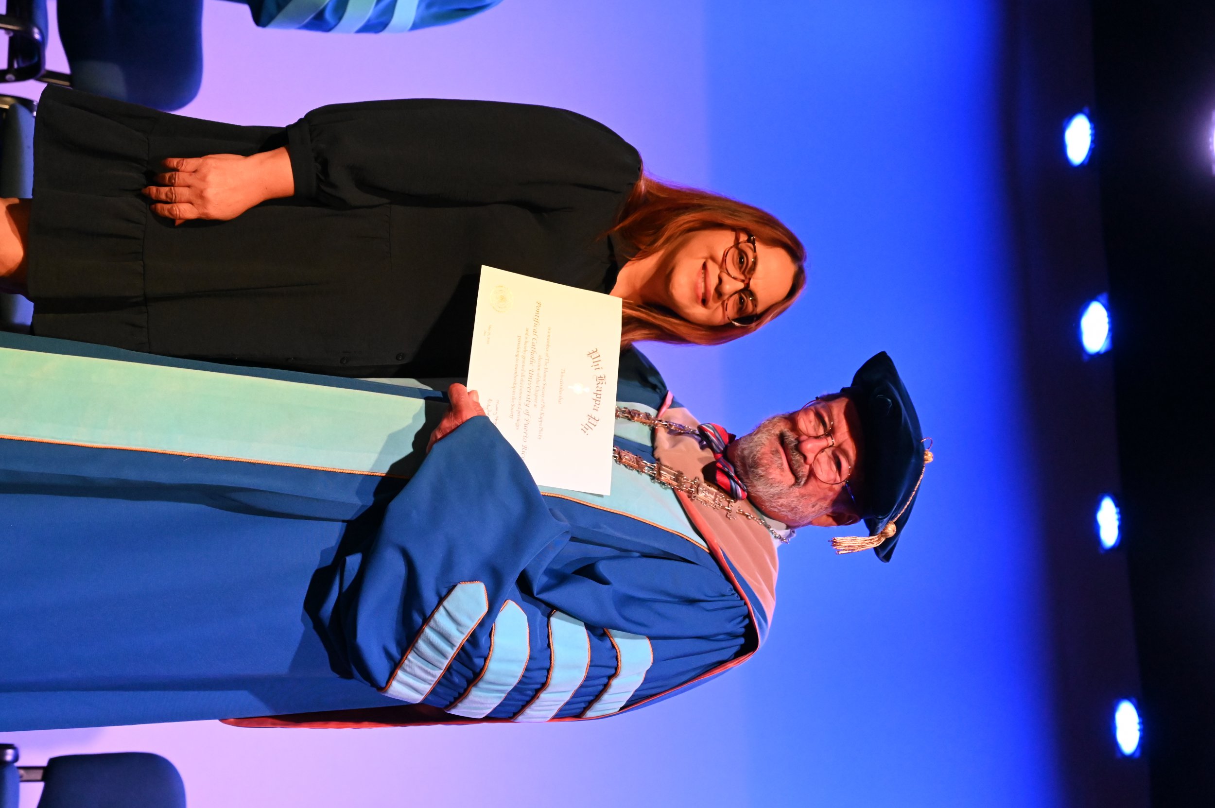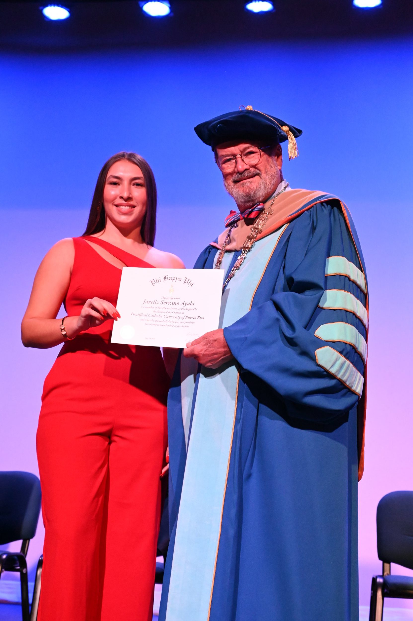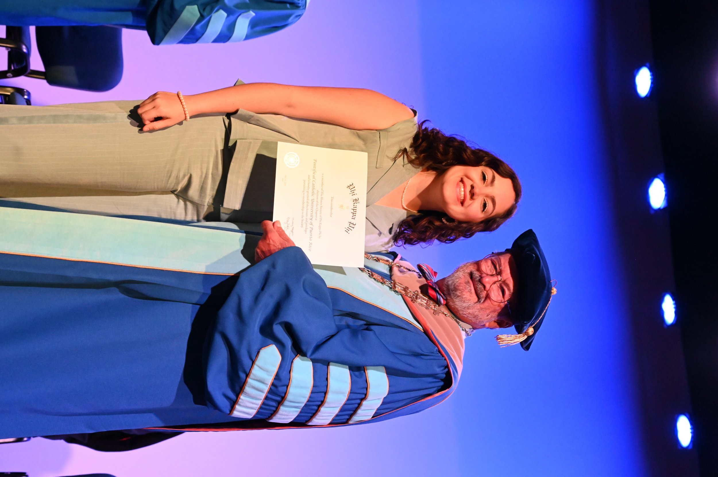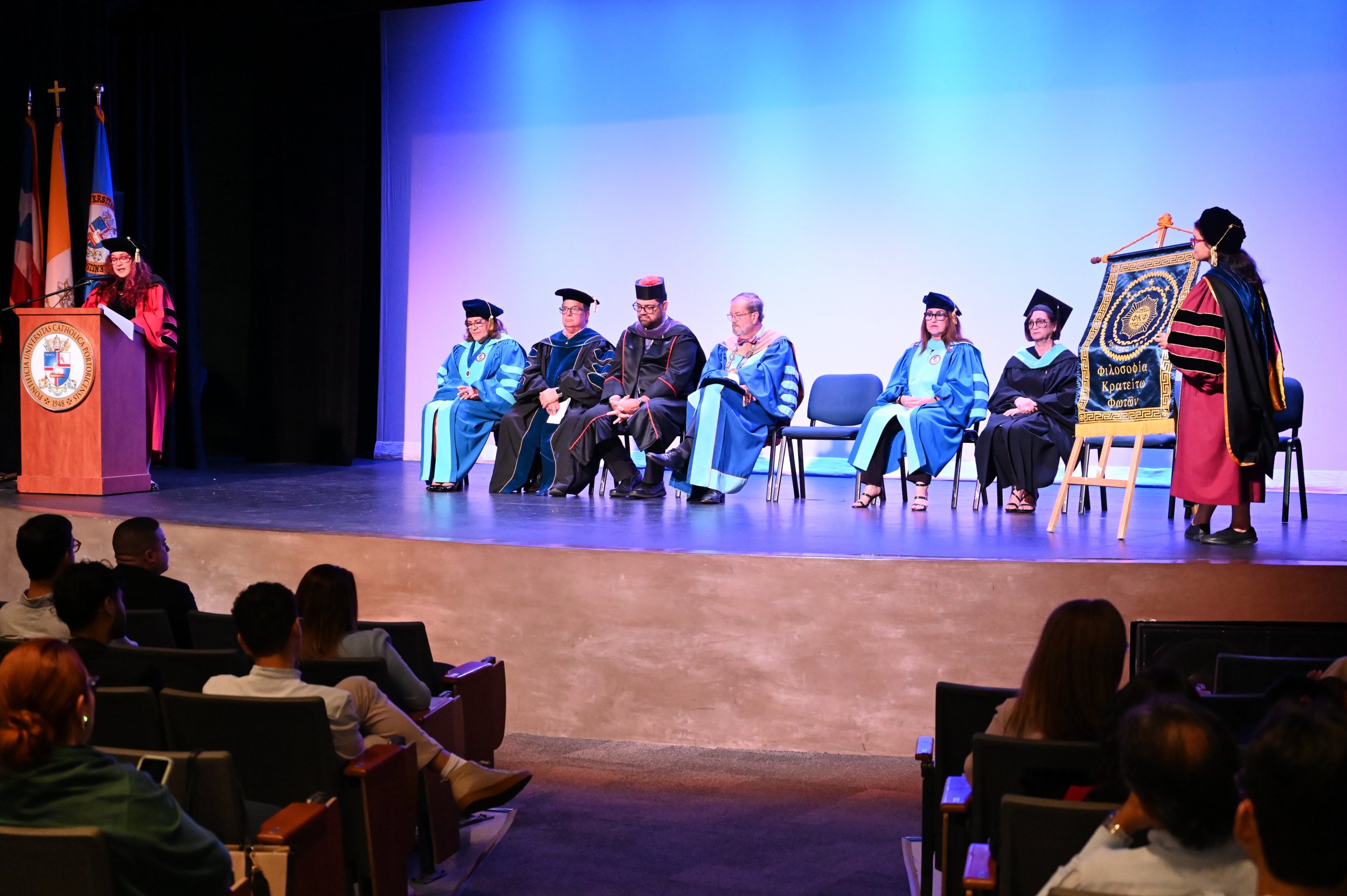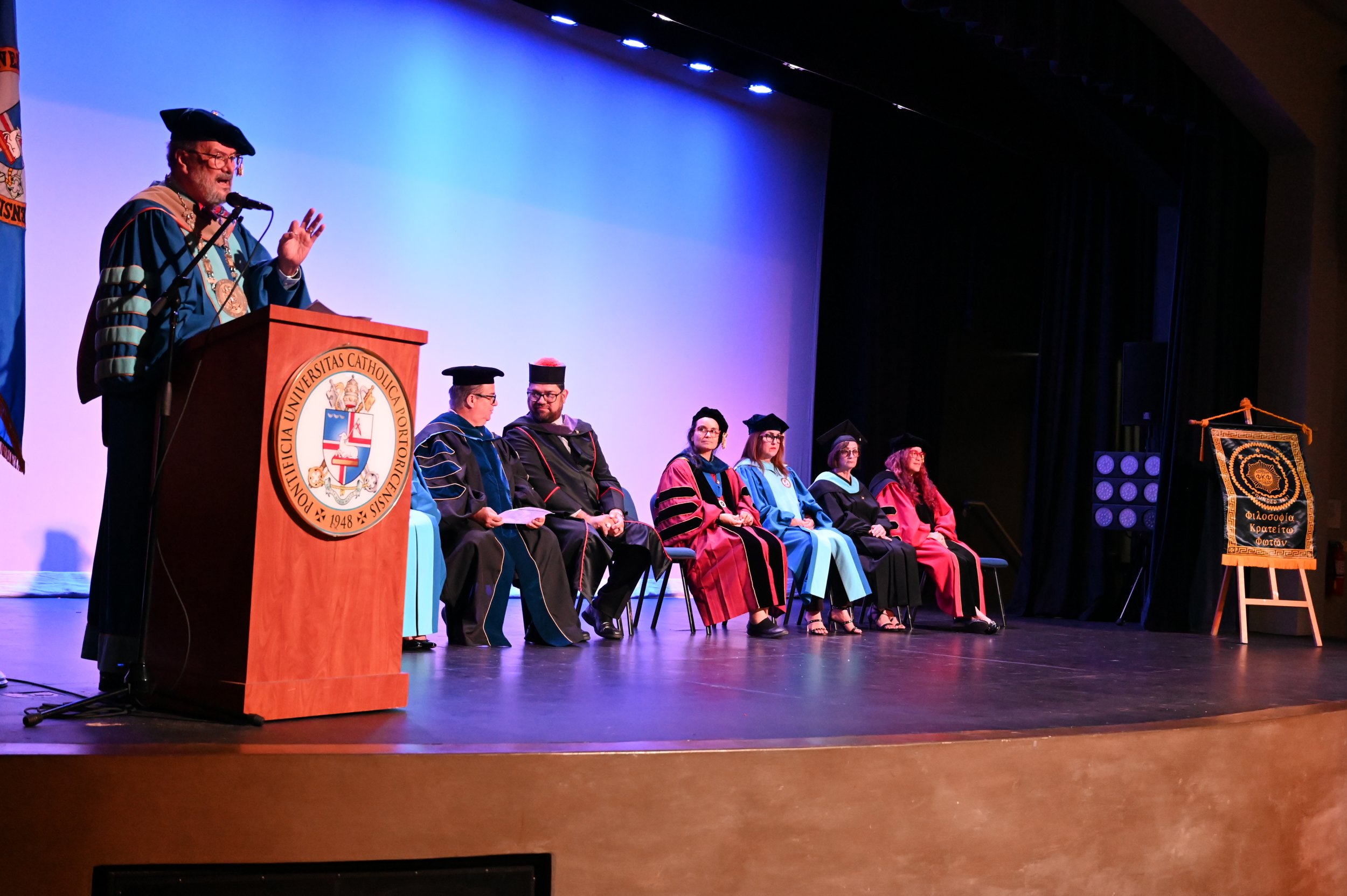 El teatro Mons. Vicente Murga fue la sede para los actos de iniciación de cincuenta nuevos miembros de la Phi Kappa Phi quienes con orgullo aceptaron la invitación a formar parte de esta importante sociedad de honor. “Hay que recordar el lema de Phi Kappa Phi ´Que el amor por la sabiduría rija a la humanidad´. Así que el primer beneficio de formar parte de Phi Kappa es recordar ese lema porque ese lema los va a acompañar el resto de la vida. Múltiples personas muy reconocidas en el mundo han formado parte de esta sociedad. Por lo tanto, se unen a una organización de mucho prestigio desde el punto de vista académico porque es una organización para honrar a los estudiantes, a la facultad y al personal no docente que valoran el que la sabiduría sea lo que rija la humanidad” sostuvo el Dr. Jorge Iván Vélez Arocho, presidente de la PUCPR.