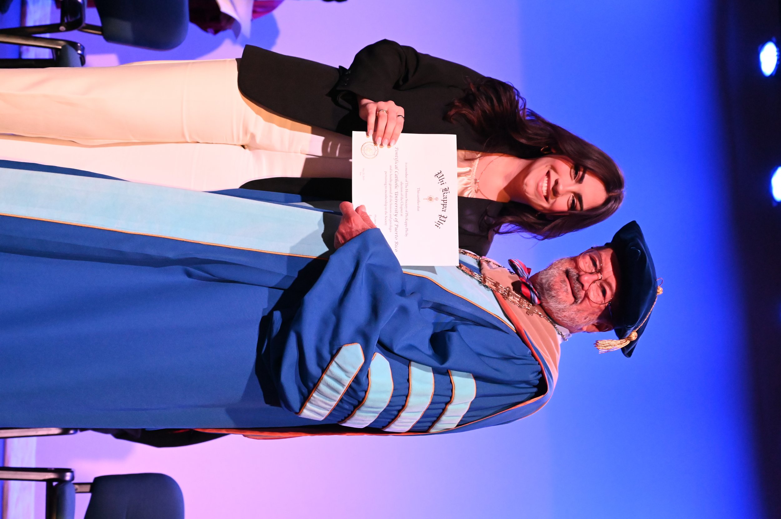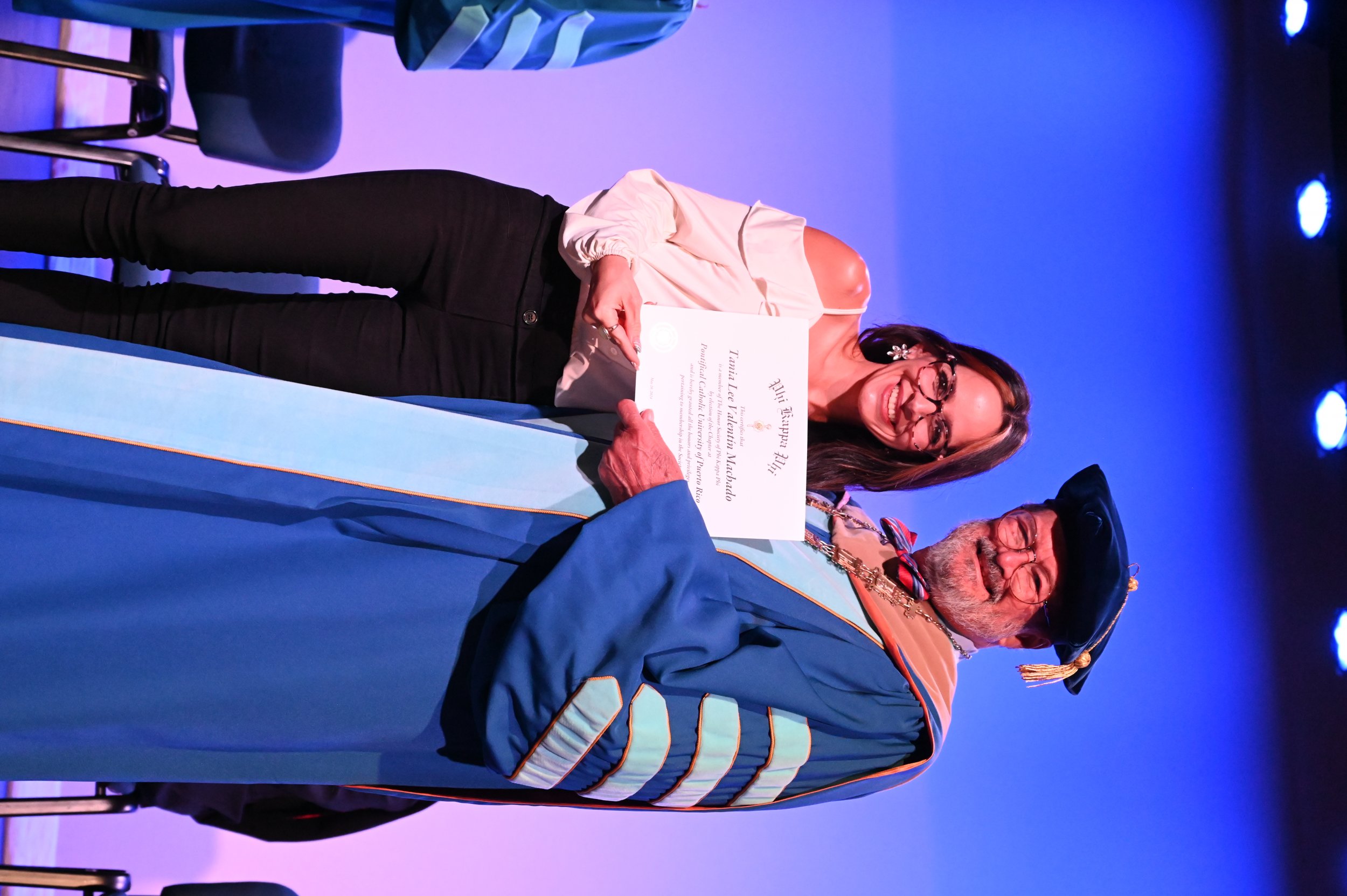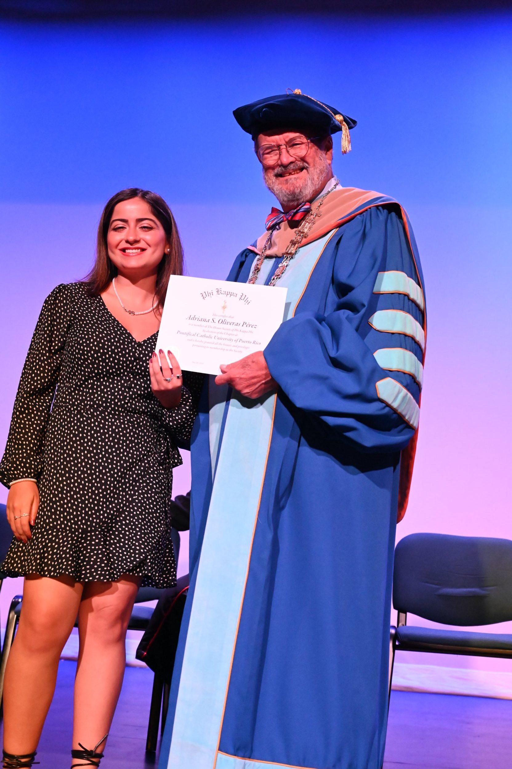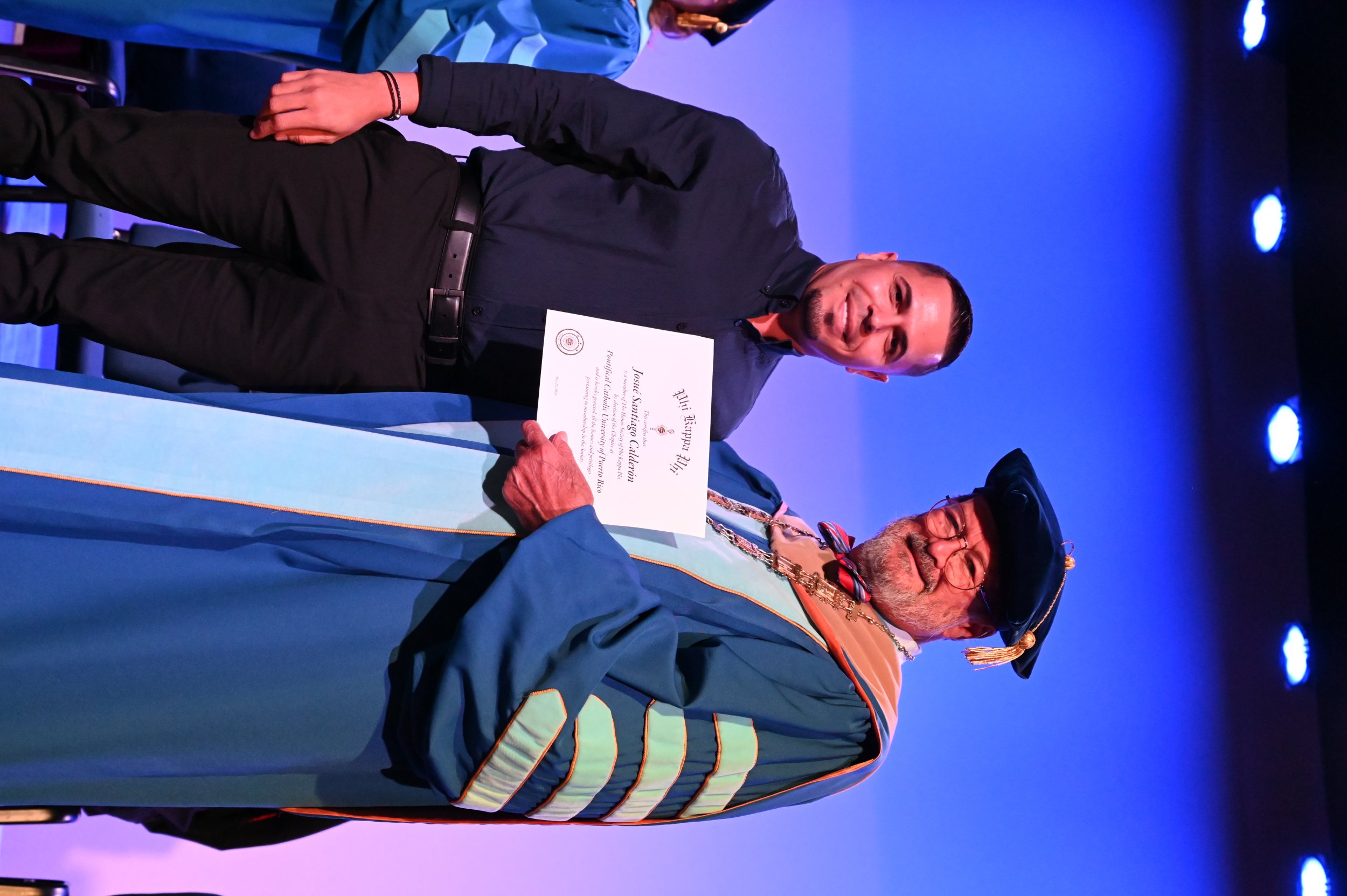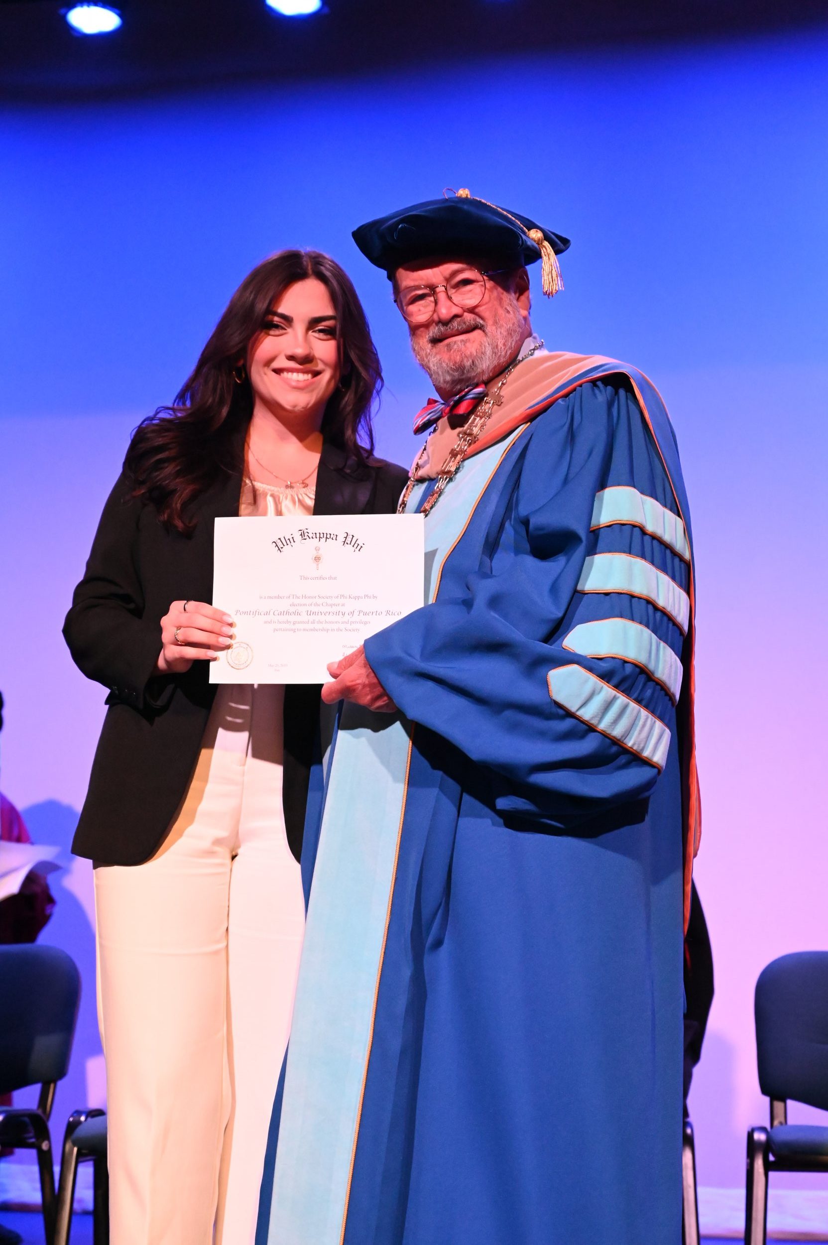El teatro Mons. Vicente Murga fue la sede para los actos de iniciación de cincuenta nuevos miembros de la Phi Kappa Phi quienes con orgullo aceptaron la invitación a formar parte de esta importante sociedad de honor. “Hay que recordar el lema de Phi Kappa Phi ´Que el amor por la sabiduría rija a la humanidad´. Así que el primer beneficio de formar parte de Phi Kappa es recordar ese lema porque ese lema los va a acompañar el resto de la vida. Múltiples personas muy reconocidas en el mundo han formado parte de esta sociedad. Por lo tanto, se unen a una organización de mucho prestigio desde el punto de vista académico porque es una organización para honrar a los estudiantes, a la facultad y al personal no docente que valoran el que la sabiduría sea lo que rija la humanidad” sostuvo el Dr. Jorge Iván Vélez Arocho, presidente de la PUCPR.