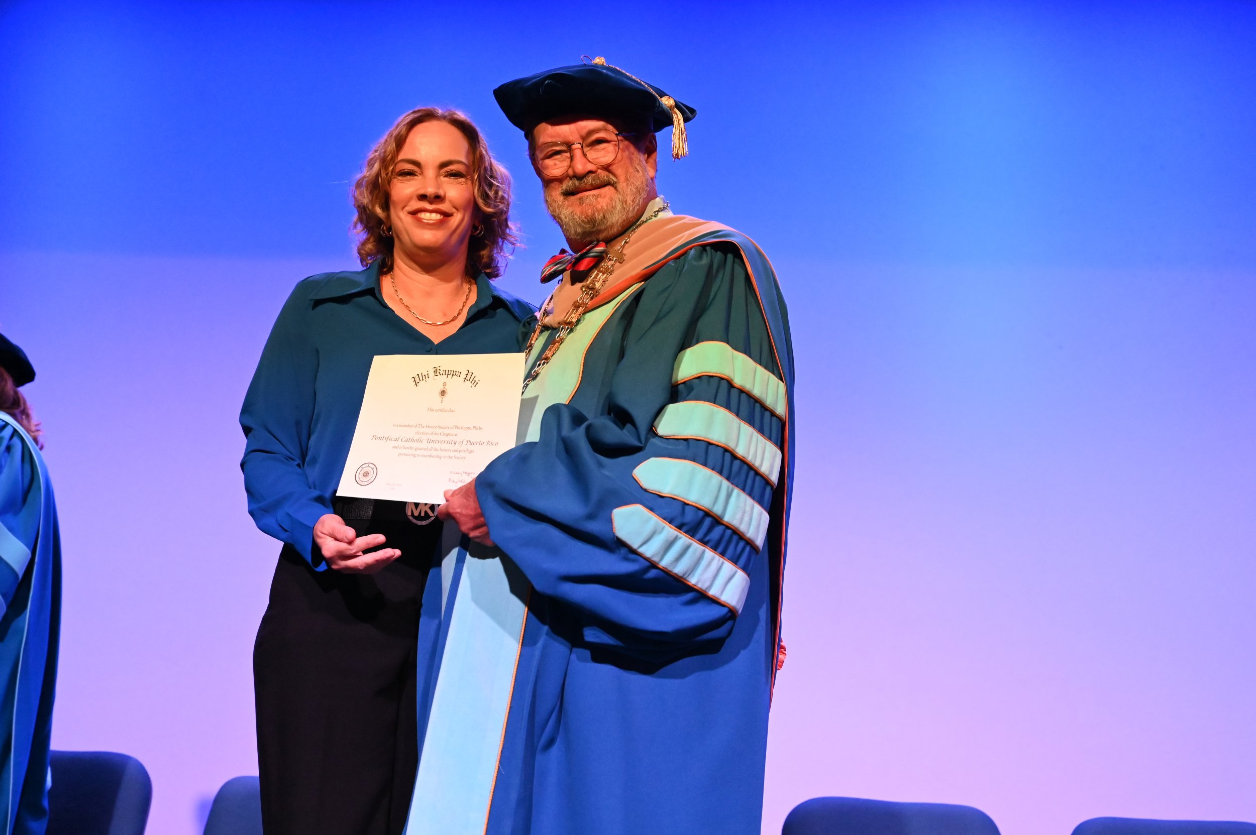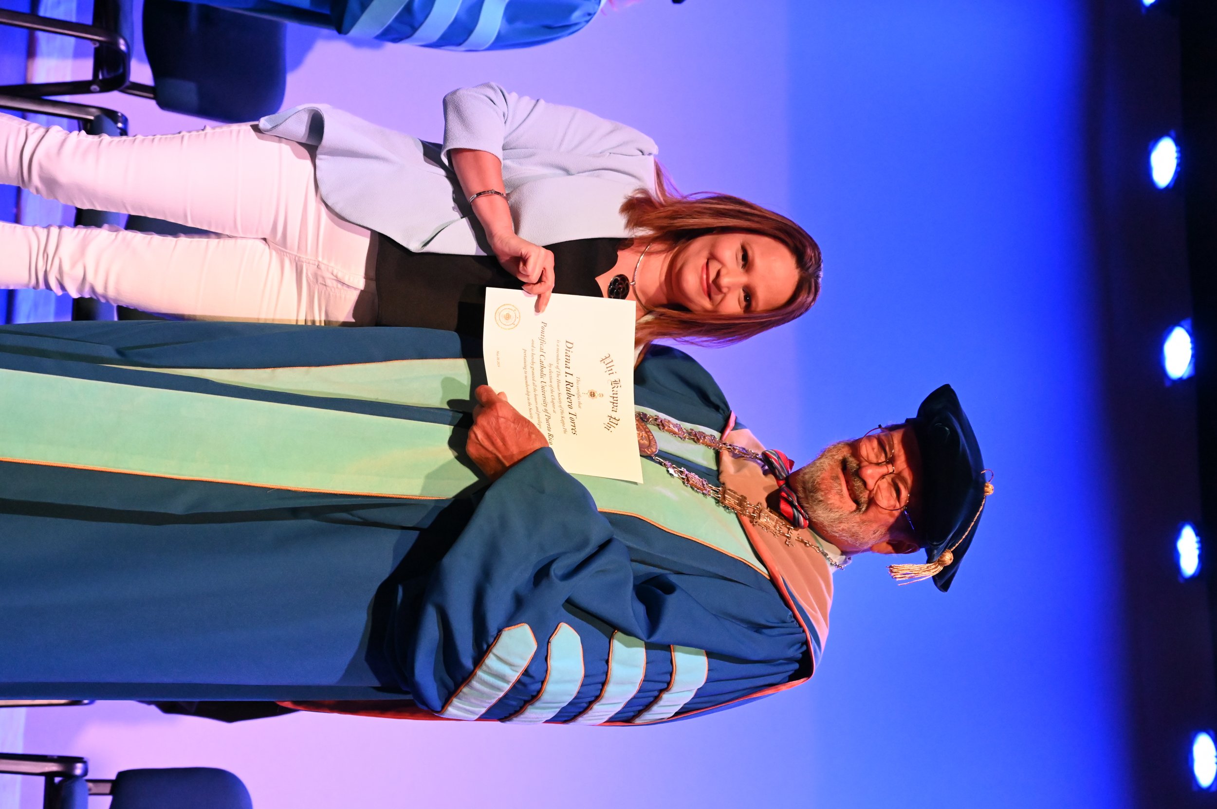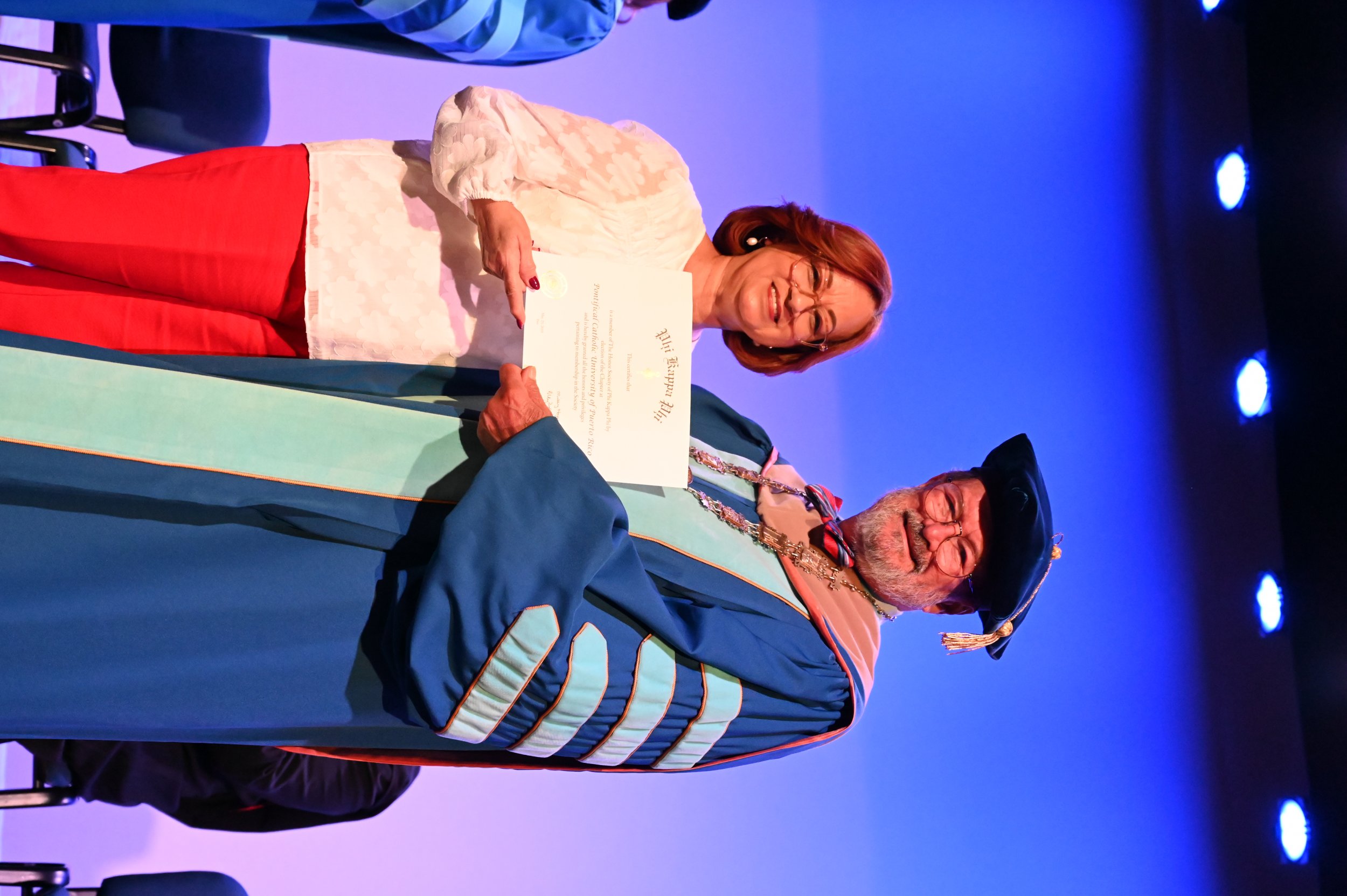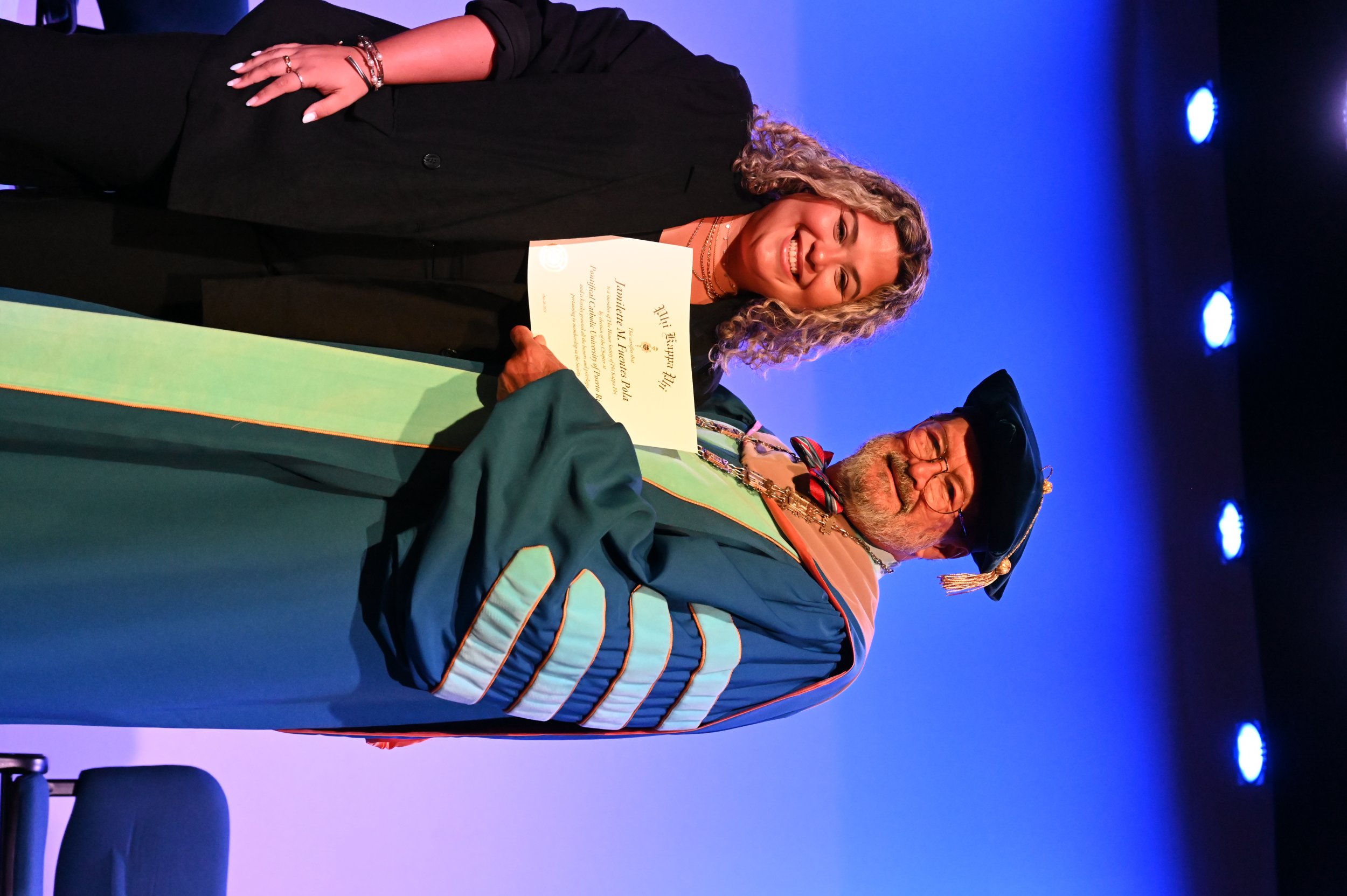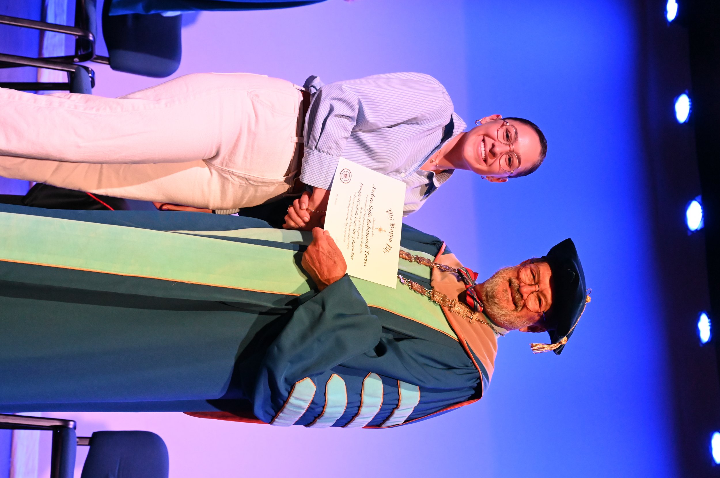 El teatro Mons. Vicente Murga fue la sede para los actos de iniciación de cincuenta nuevos miembros de la Phi Kappa Phi quienes con orgullo aceptaron la invitación a formar parte de esta importante sociedad de honor. “Hay que recordar el lema de Phi Kappa Phi ´Que el amor por la sabiduría rija a la humanidad´. Así que el primer beneficio de formar parte de Phi Kappa es recordar ese lema porque ese lema los va a acompañar el resto de la vida. Múltiples personas muy reconocidas en el mundo han formado parte de esta sociedad. Por lo tanto, se unen a una organización de mucho prestigio desde el punto de vista académico porque es una organización para honrar a los estudiantes, a la facultad y al personal no docente que valoran el que la sabiduría sea lo que rija la humanidad” sostuvo el Dr. Jorge Iván Vélez Arocho, presidente de la PUCPR.