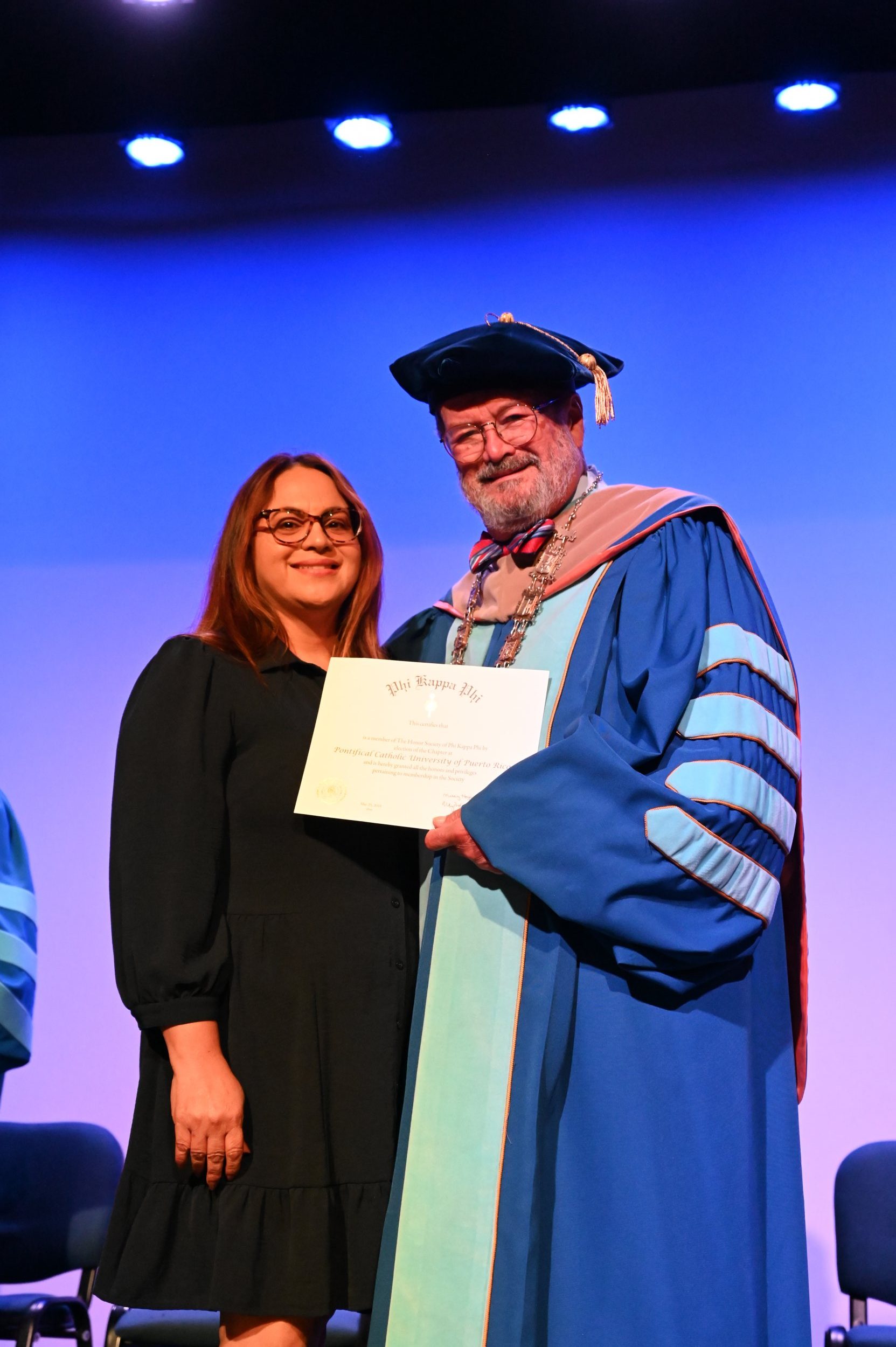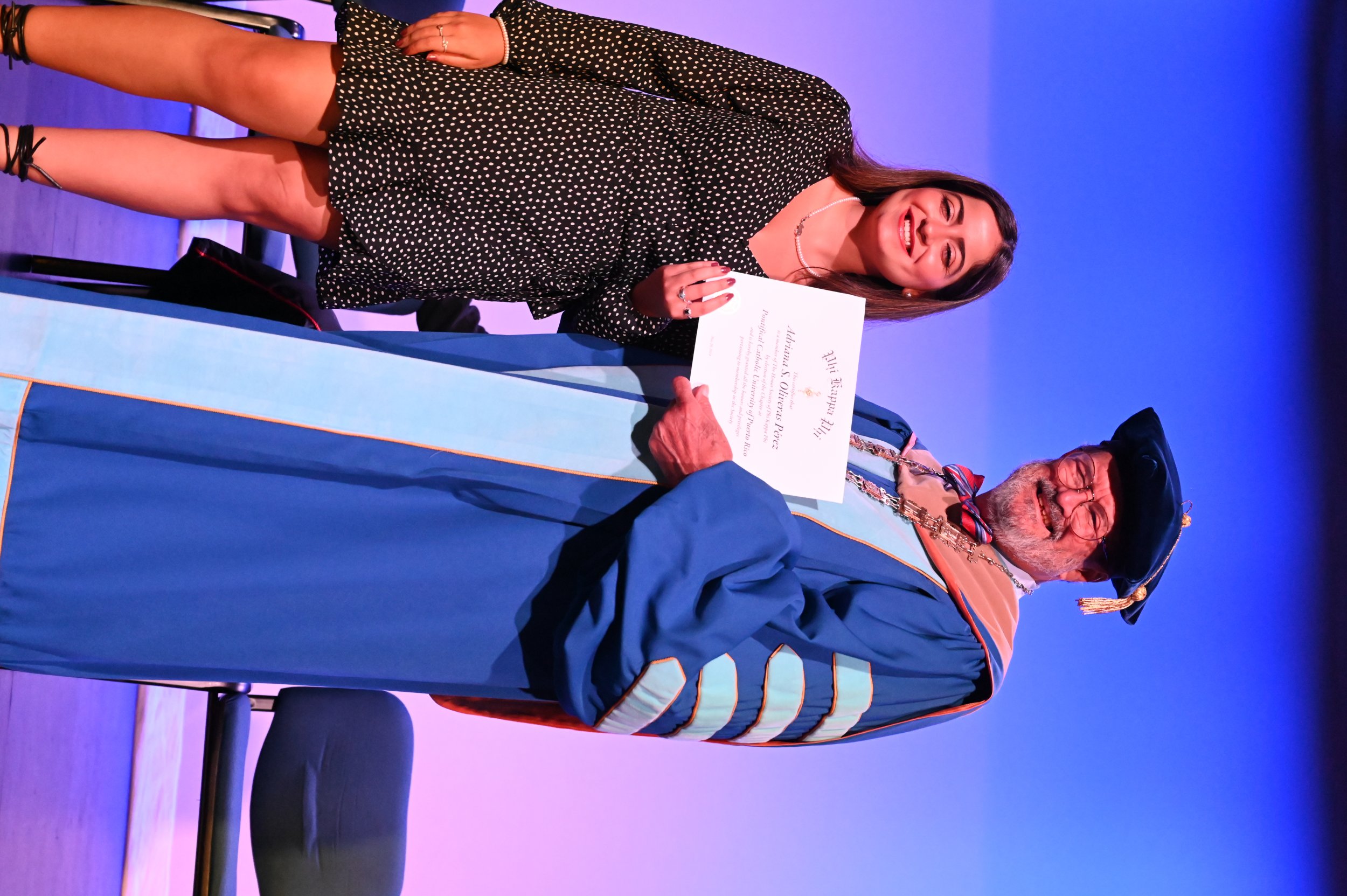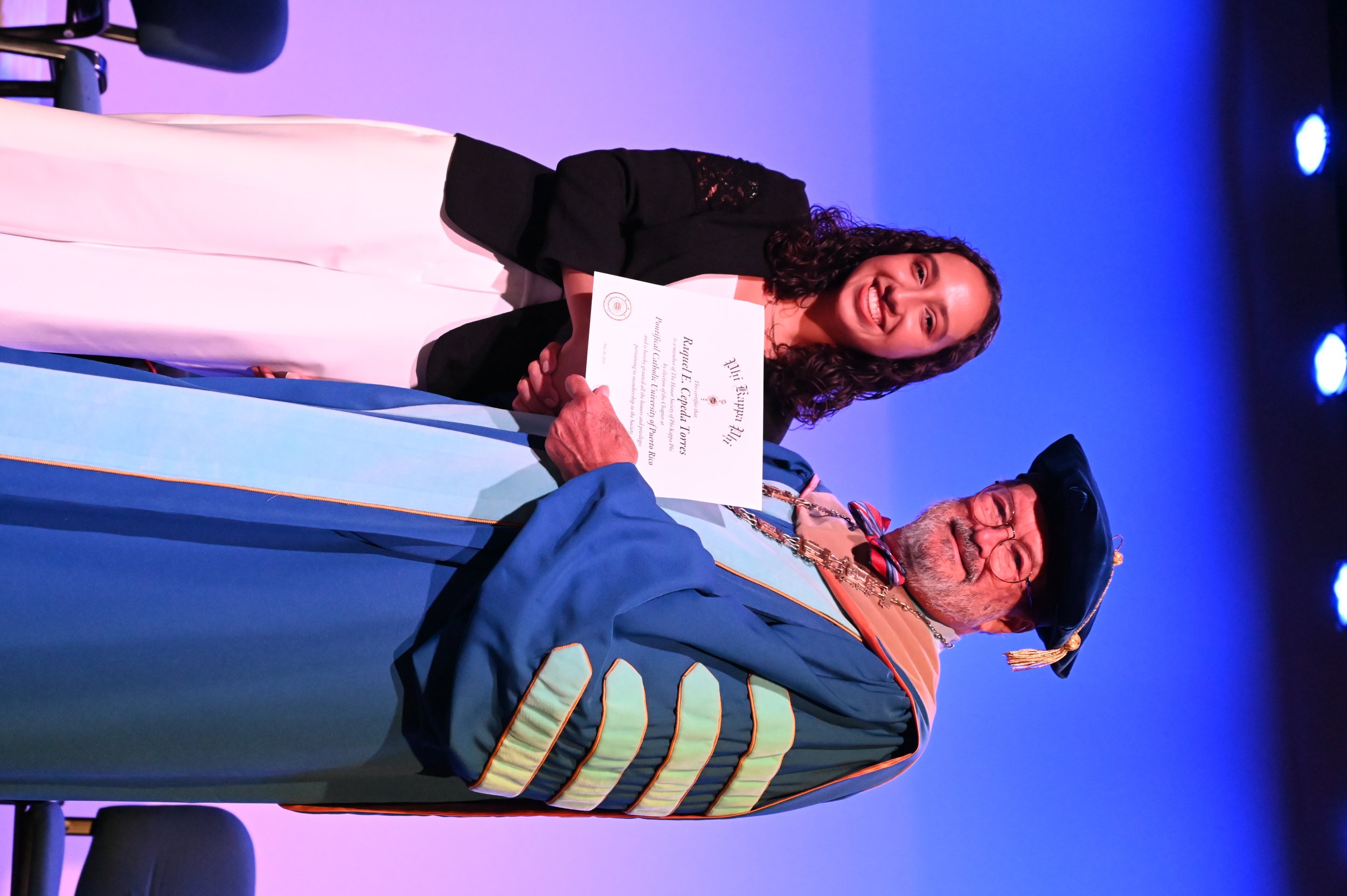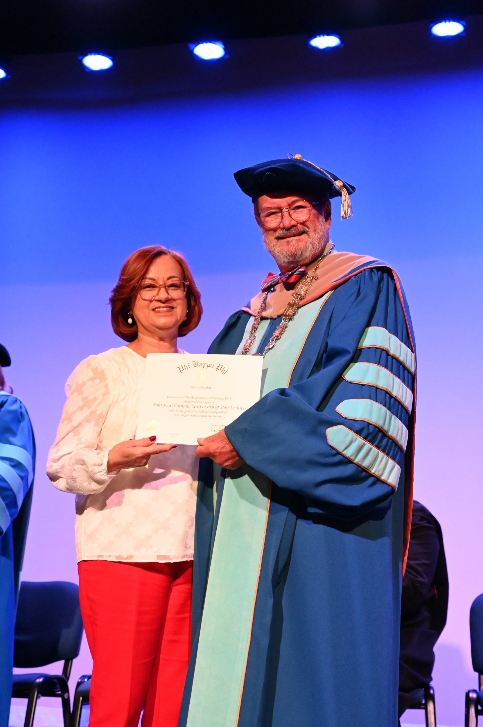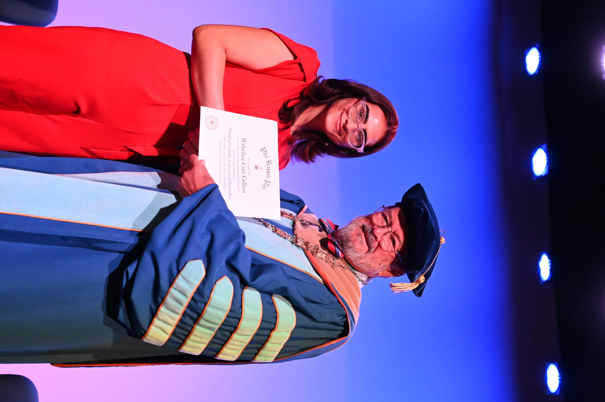 El teatro Mons. Vicente Murga fue la sede para los actos de iniciación de cincuenta nuevos miembros de la Phi Kappa Phi quienes con orgullo aceptaron la invitación a formar parte de esta importante sociedad de honor. “Hay que recordar el lema de Phi Kappa Phi ´Que el amor por la sabiduría rija a la humanidad´. Así que el primer beneficio de formar parte de Phi Kappa es recordar ese lema porque ese lema los va a acompañar el resto de la vida. Múltiples personas muy reconocidas en el mundo han formado parte de esta sociedad. Por lo tanto, se unen a una organización de mucho prestigio desde el punto de vista académico porque es una organización para honrar a los estudiantes, a la facultad y al personal no docente que valoran el que la sabiduría sea lo que rija la humanidad” sostuvo el Dr. Jorge Iván Vélez Arocho, presidente de la PUCPR.