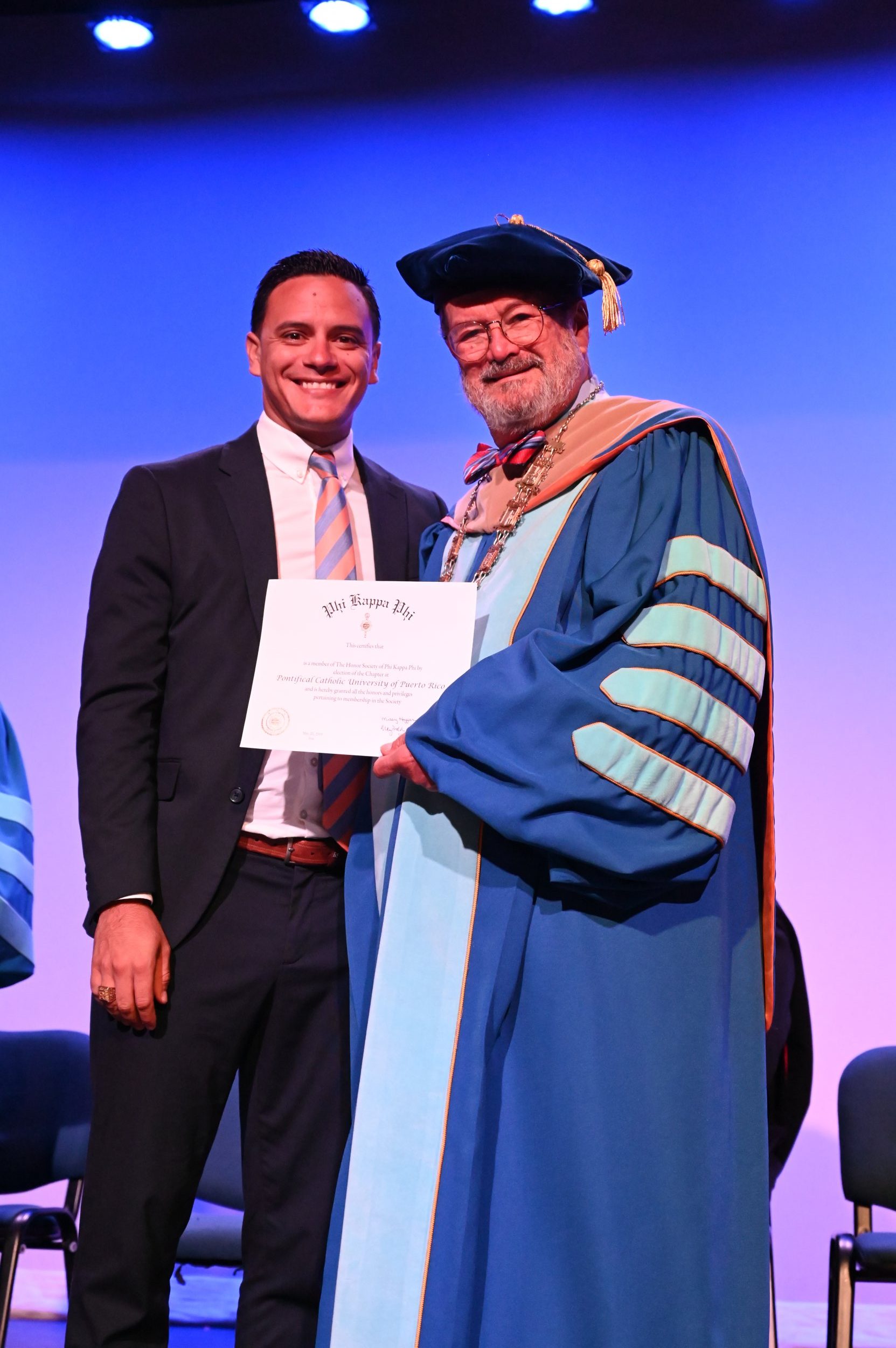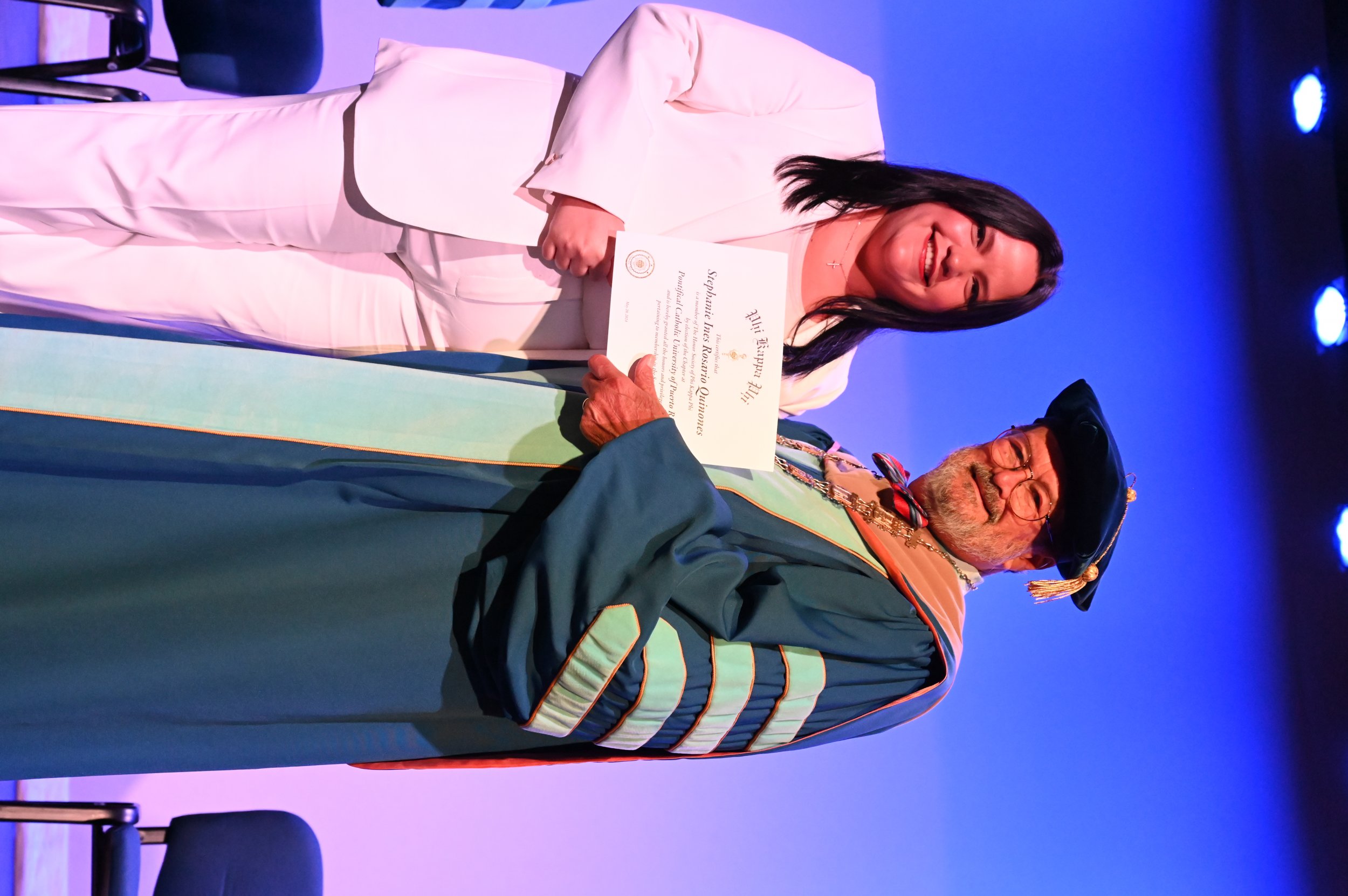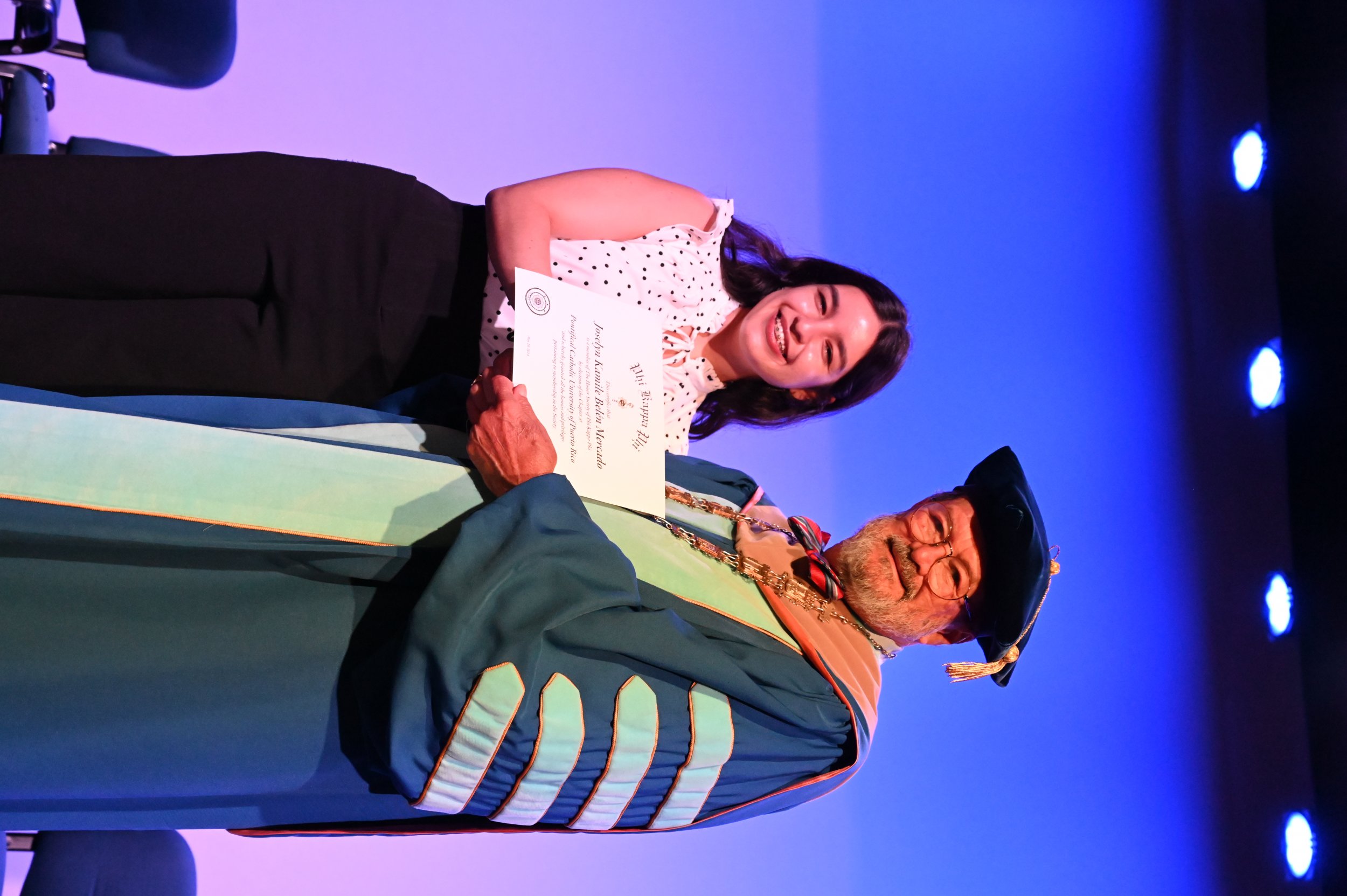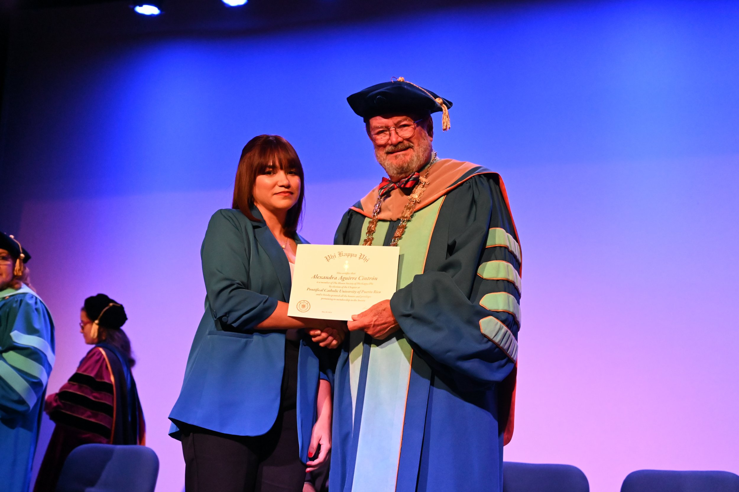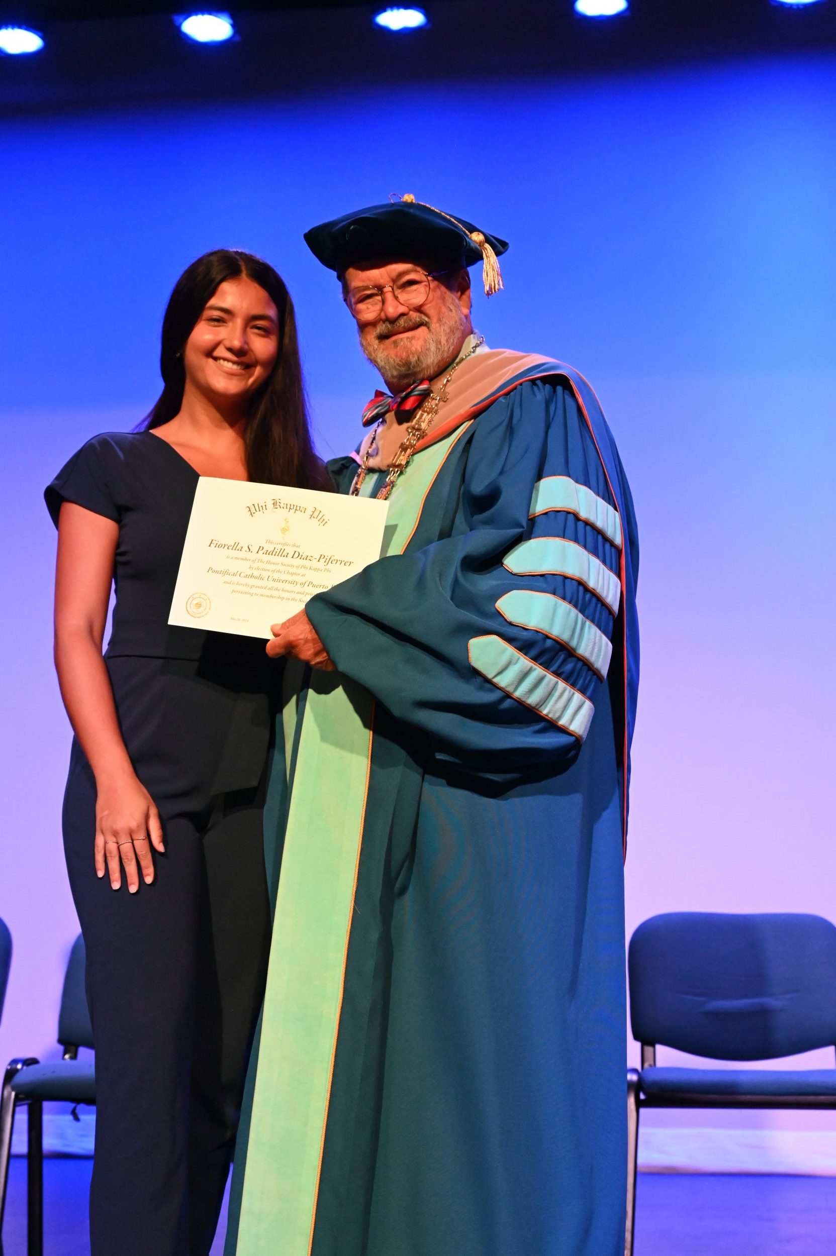 El teatro Mons. Vicente Murga fue la sede para los actos de iniciación de cincuenta nuevos miembros de la Phi Kappa Phi quienes con orgullo aceptaron la invitación a formar parte de esta importante sociedad de honor. “Hay que recordar el lema de Phi Kappa Phi ´Que el amor por la sabiduría rija a la humanidad´. Así que el primer beneficio de formar parte de Phi Kappa es recordar ese lema porque ese lema los va a acompañar el resto de la vida. Múltiples personas muy reconocidas en el mundo han formado parte de esta sociedad. Por lo tanto, se unen a una organización de mucho prestigio desde el punto de vista académico porque es una organización para honrar a los estudiantes, a la facultad y al personal no docente que valoran el que la sabiduría sea lo que rija la humanidad” sostuvo el Dr. Jorge Iván Vélez Arocho, presidente de la PUCPR.