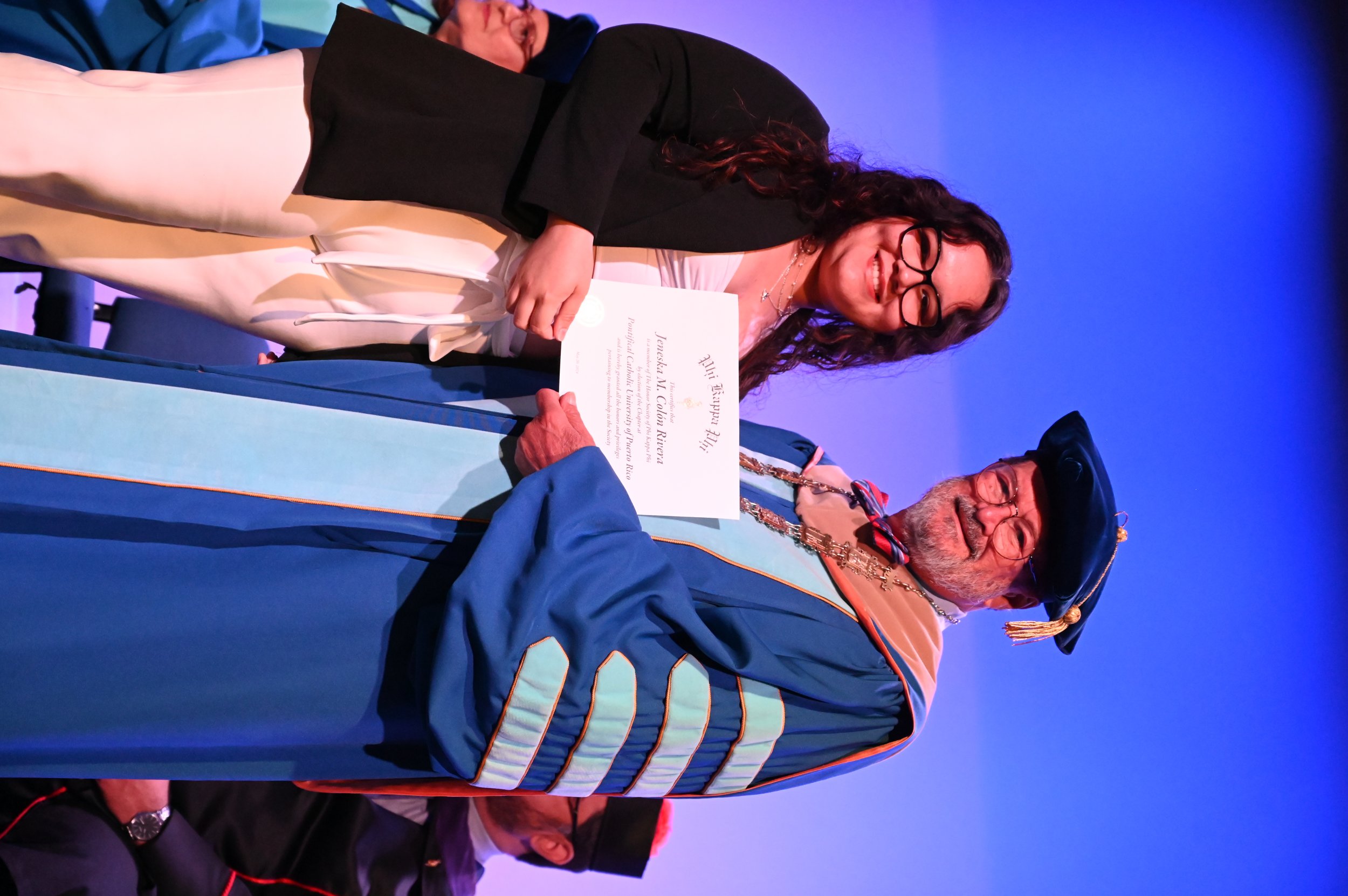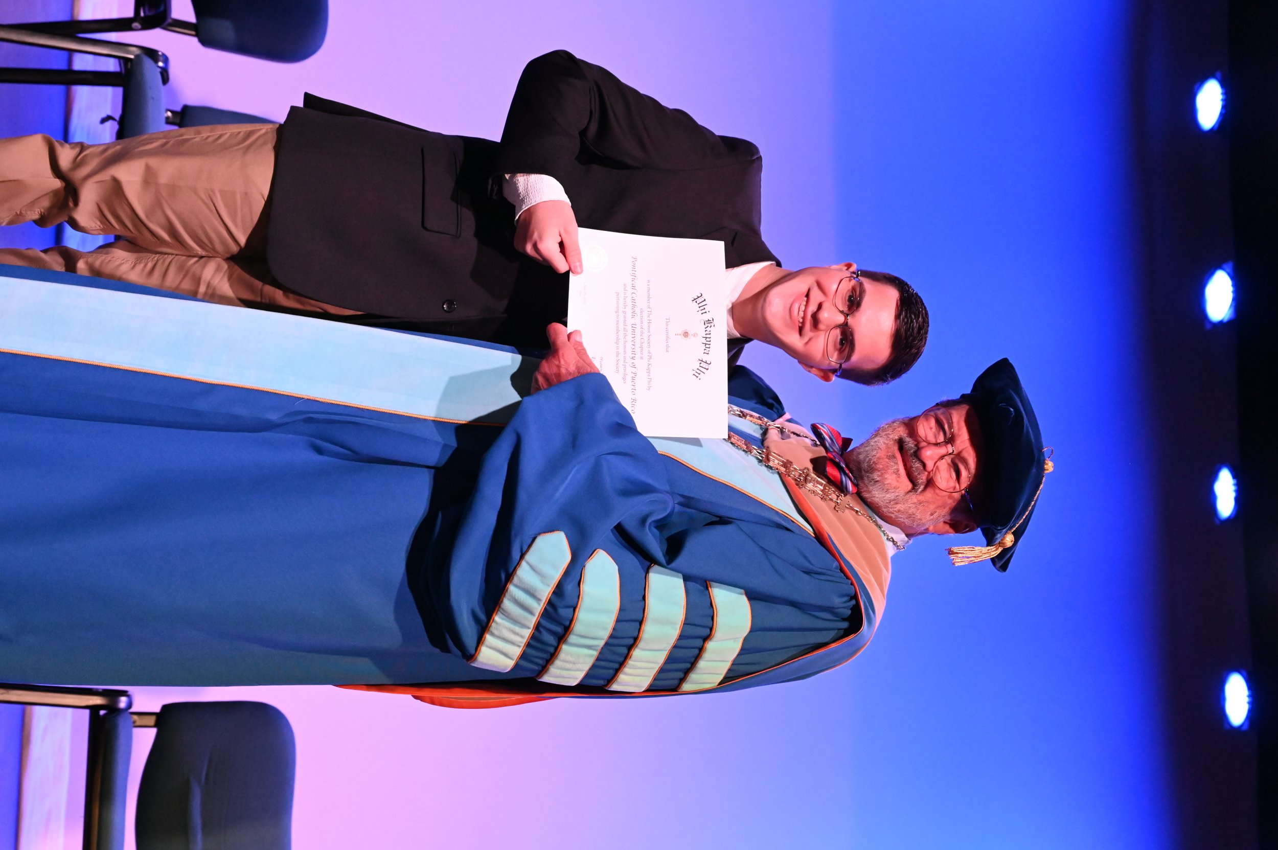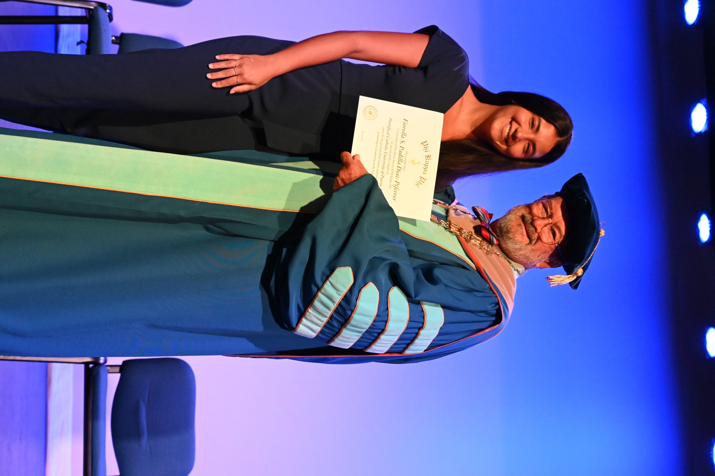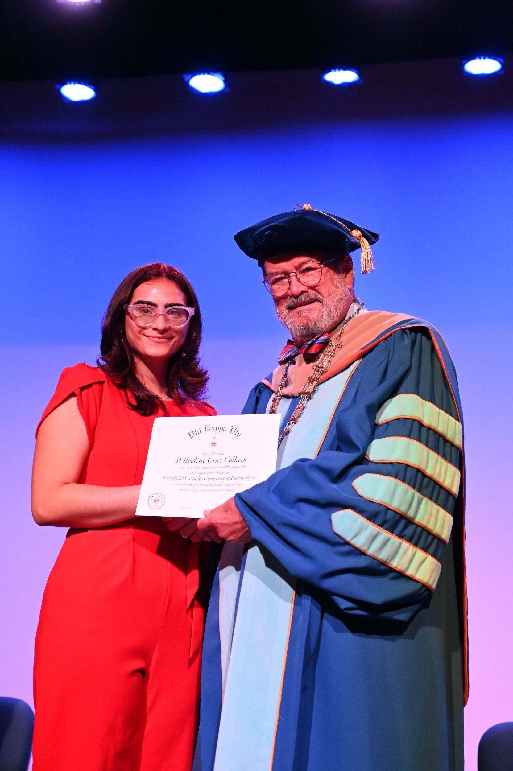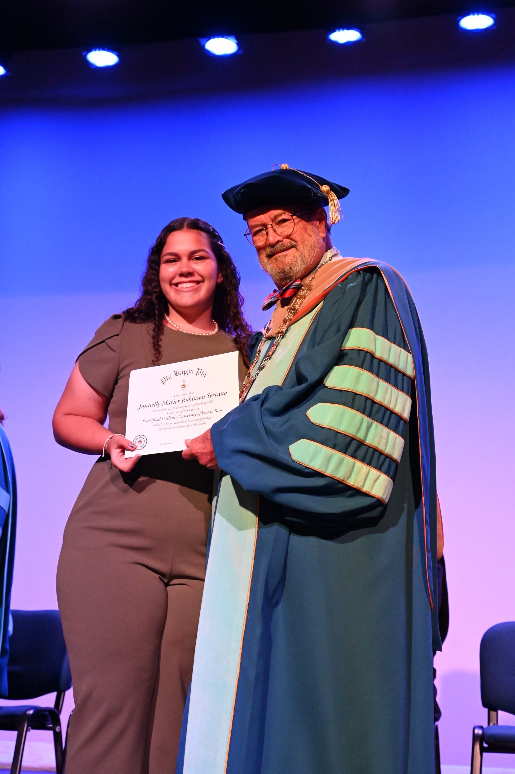 El teatro Mons. Vicente Murga fue la sede para los actos de iniciación de cincuenta nuevos miembros de la Phi Kappa Phi quienes con orgullo aceptaron la invitación a formar parte de esta importante sociedad de honor. “Hay que recordar el lema de Phi Kappa Phi ´Que el amor por la sabiduría rija a la humanidad´. Así que el primer beneficio de formar parte de Phi Kappa es recordar ese lema porque ese lema los va a acompañar el resto de la vida. Múltiples personas muy reconocidas en el mundo han formado parte de esta sociedad. Por lo tanto, se unen a una organización de mucho prestigio desde el punto de vista académico porque es una organización para honrar a los estudiantes, a la facultad y al personal no docente que valoran el que la sabiduría sea lo que rija la humanidad” sostuvo el Dr. Jorge Iván Vélez Arocho, presidente de la PUCPR.