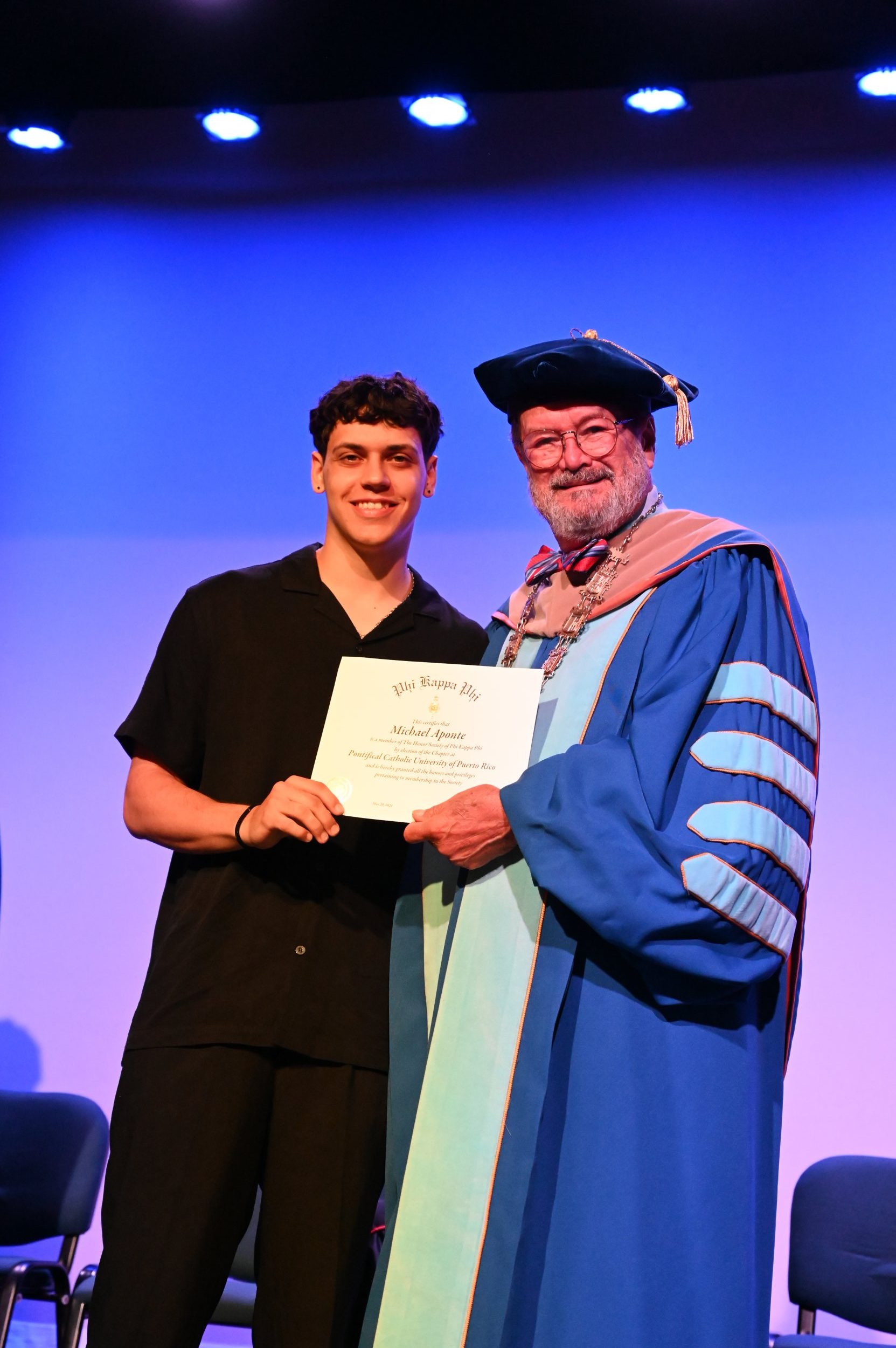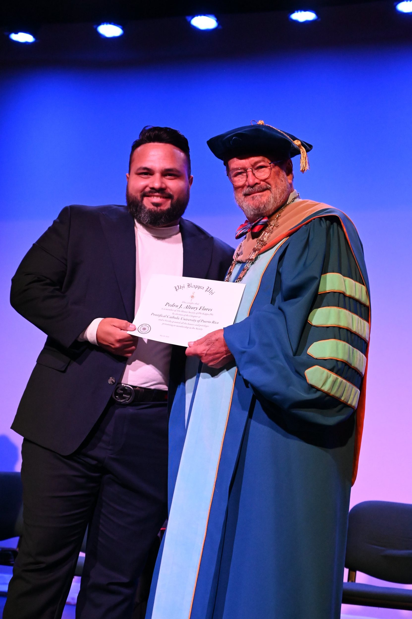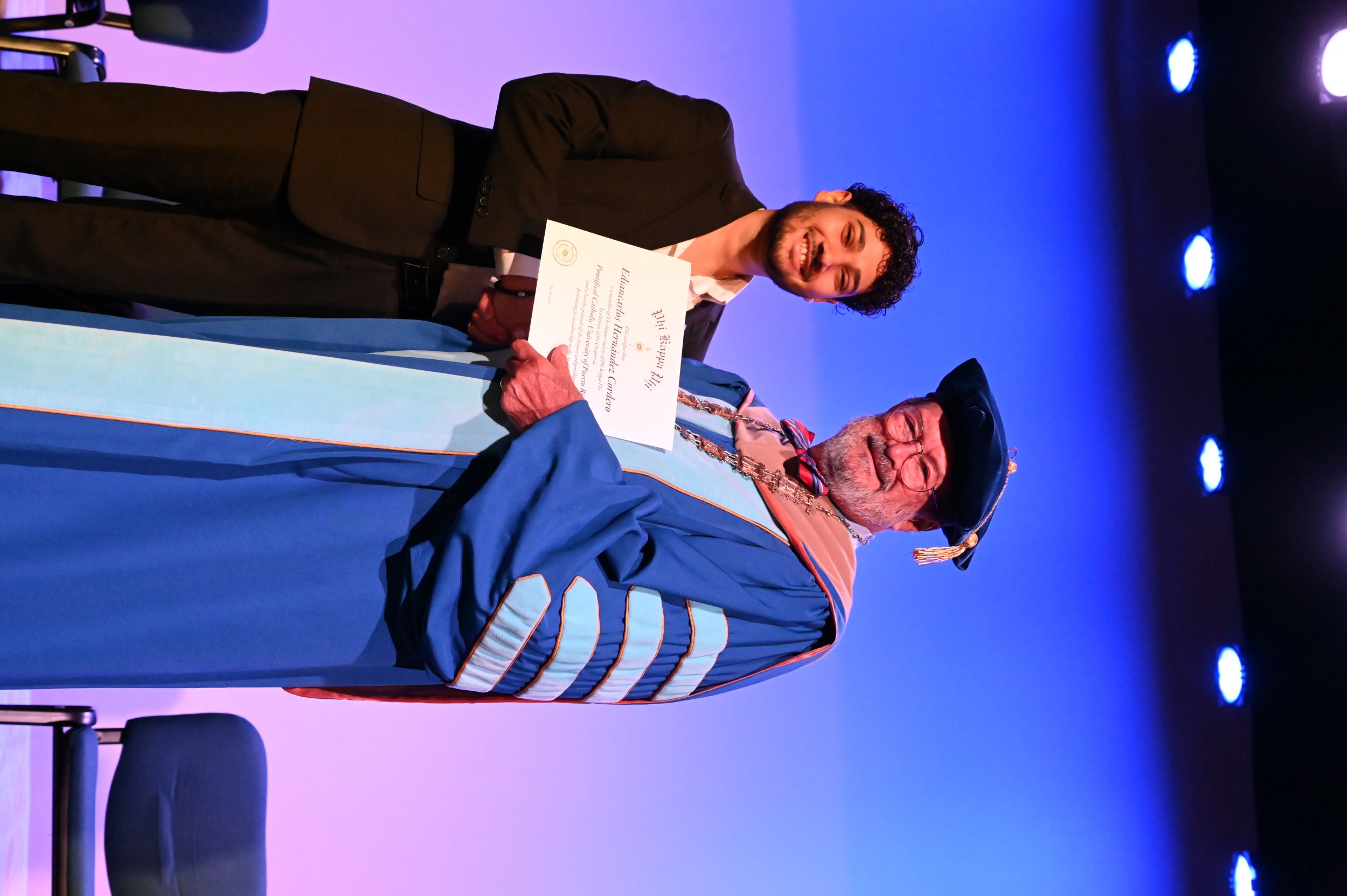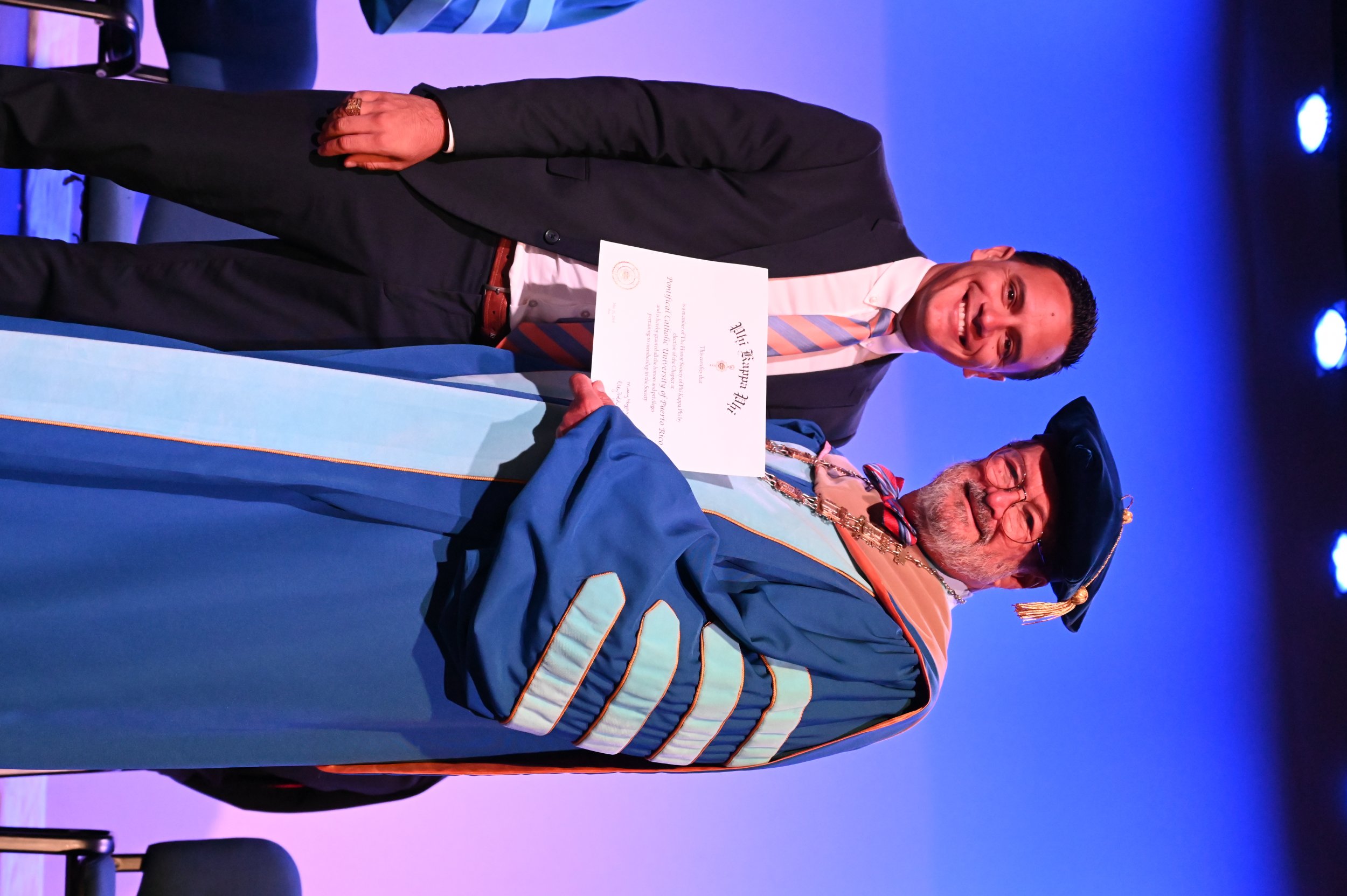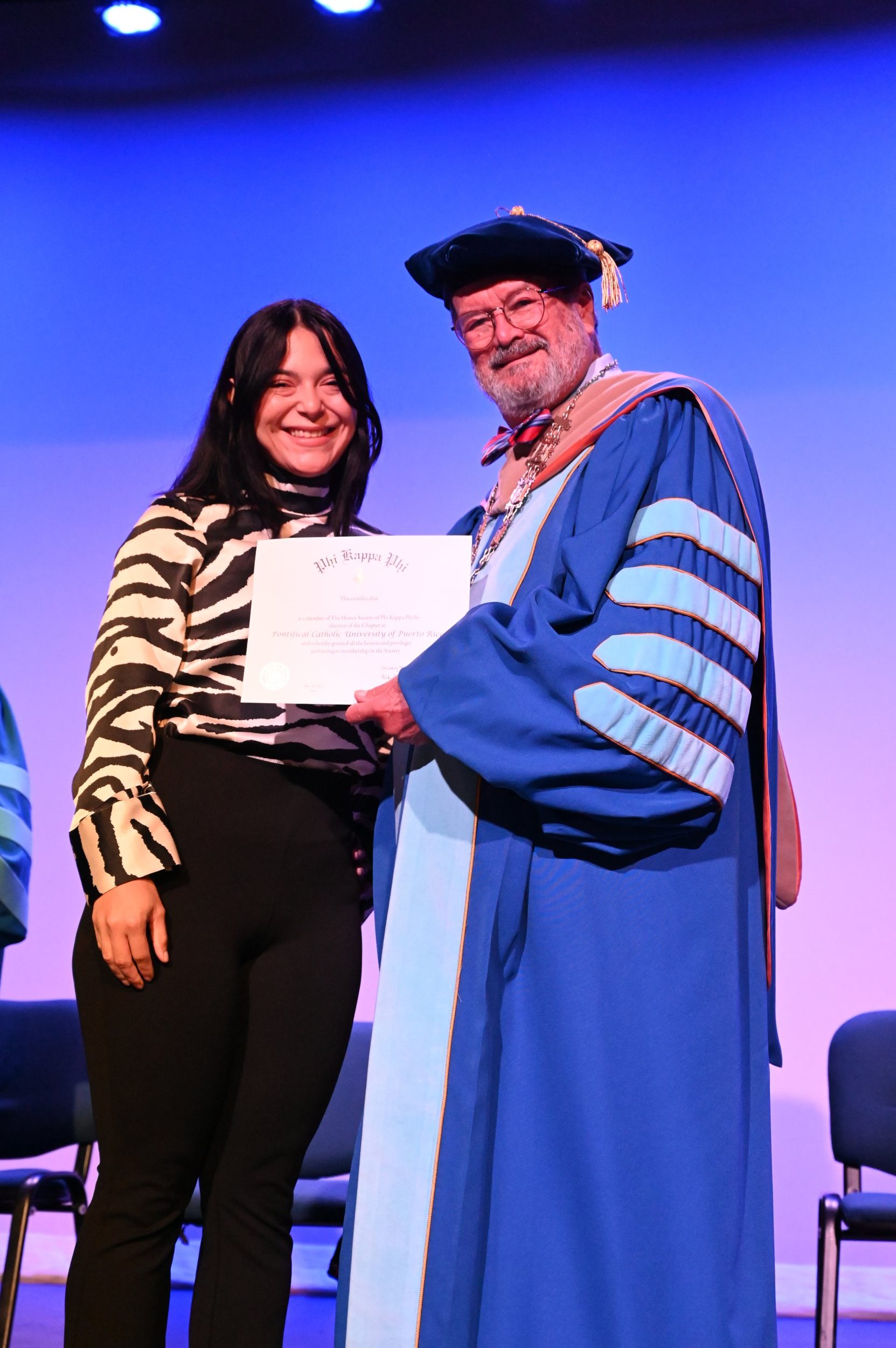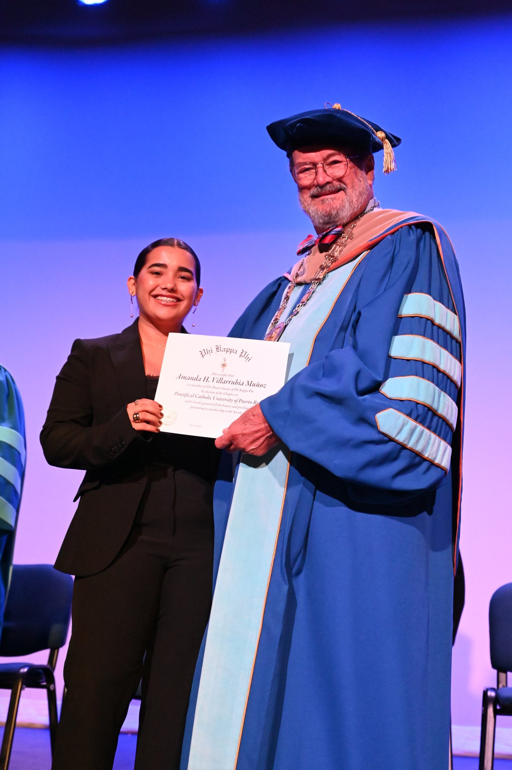 El teatro Mons. Vicente Murga fue la sede para los actos de iniciación de cincuenta nuevos miembros de la Phi Kappa Phi quienes con orgullo aceptaron la invitación a formar parte de esta importante sociedad de honor. “Hay que recordar el lema de Phi Kappa Phi ´Que el amor por la sabiduría rija a la humanidad´. Así que el primer beneficio de formar parte de Phi Kappa es recordar ese lema porque ese lema los va a acompañar el resto de la vida. Múltiples personas muy reconocidas en el mundo han formado parte de esta sociedad. Por lo tanto, se unen a una organización de mucho prestigio desde el punto de vista académico porque es una organización para honrar a los estudiantes, a la facultad y al personal no docente que valoran el que la sabiduría sea lo que rija la humanidad” sostuvo el Dr. Jorge Iván Vélez Arocho, presidente de la PUCPR.