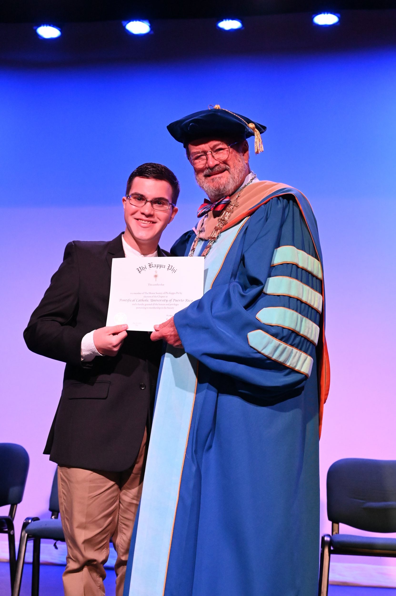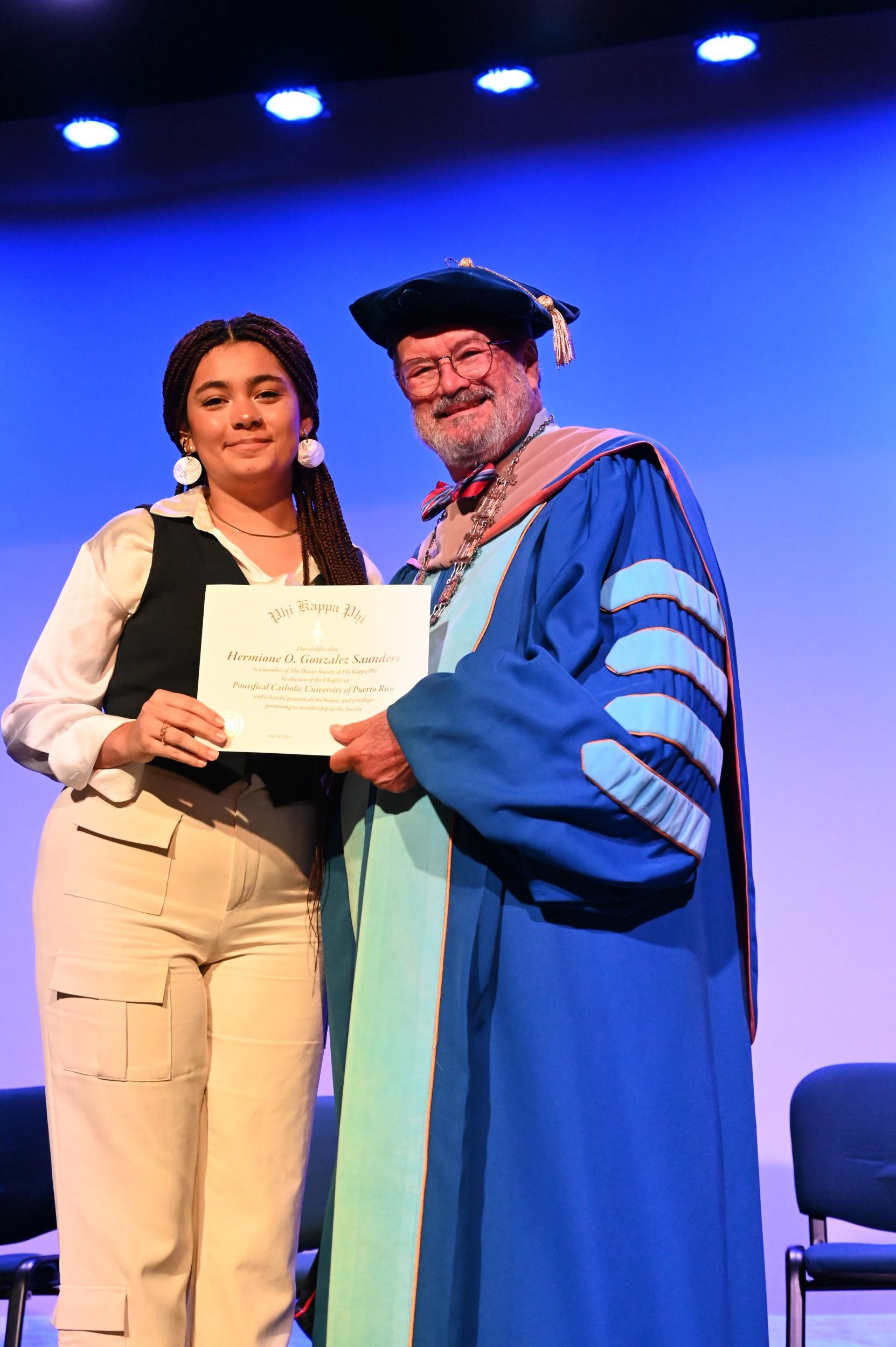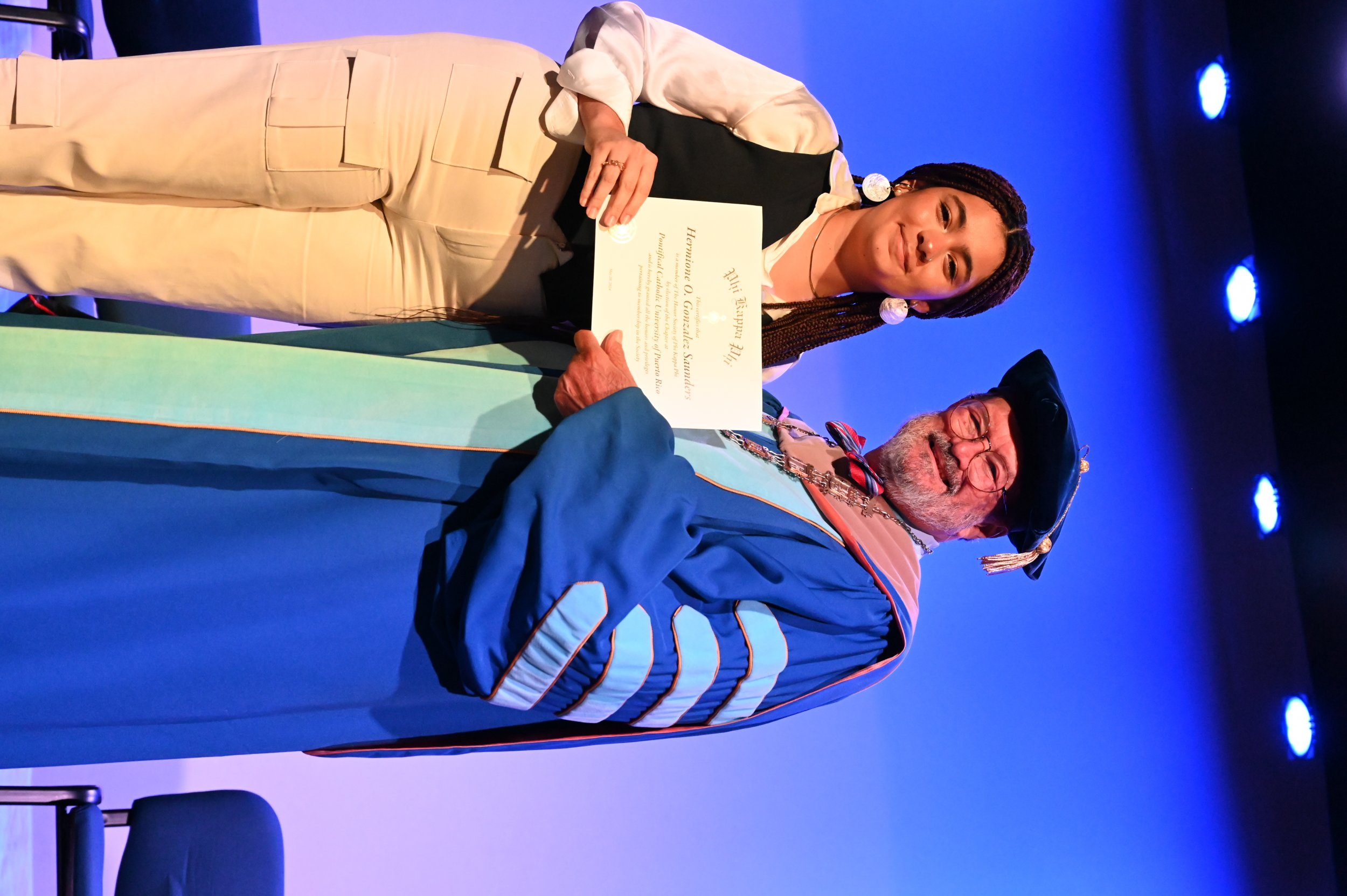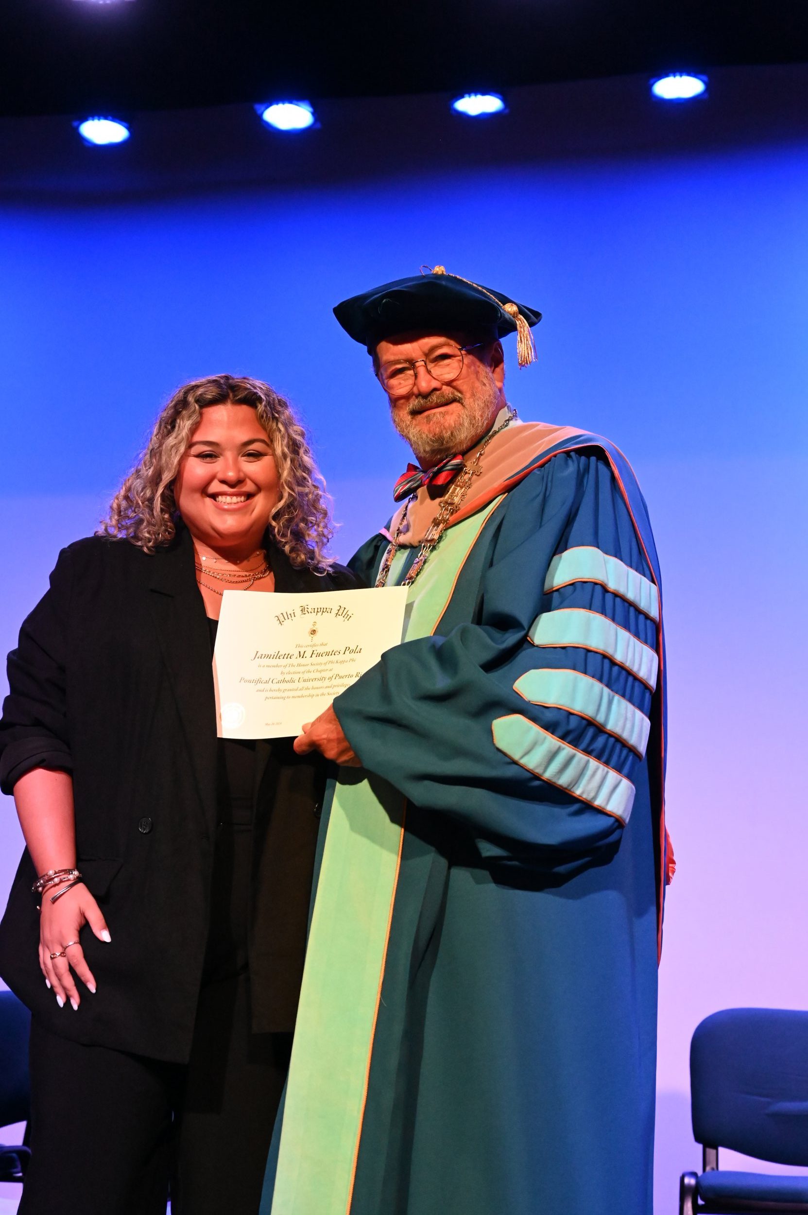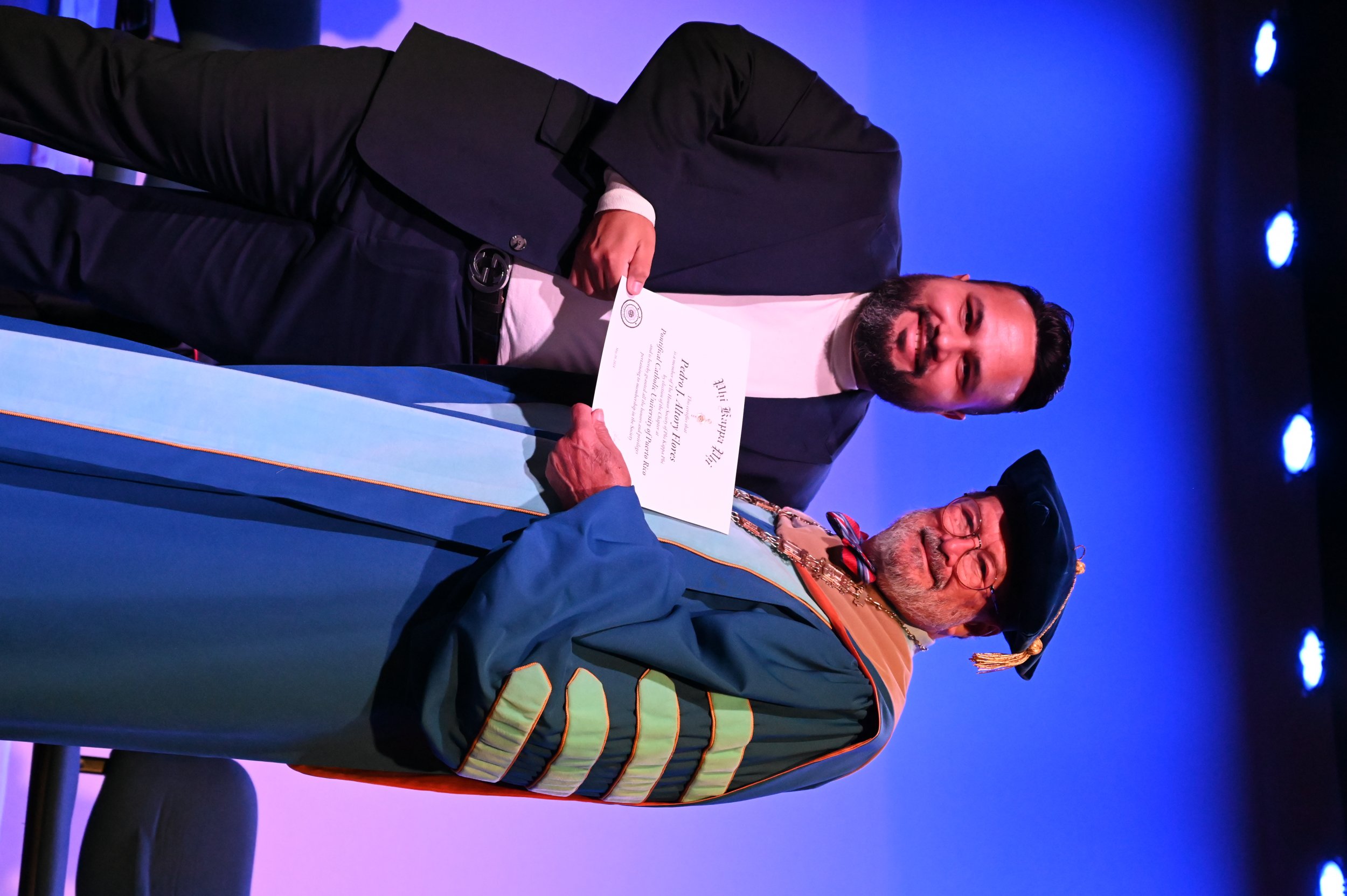 El teatro Mons. Vicente Murga fue la sede para los actos de iniciación de cincuenta nuevos miembros de la Phi Kappa Phi quienes con orgullo aceptaron la invitación a formar parte de esta importante sociedad de honor. “Hay que recordar el lema de Phi Kappa Phi ´Que el amor por la sabiduría rija a la humanidad´. Así que el primer beneficio de formar parte de Phi Kappa es recordar ese lema porque ese lema los va a acompañar el resto de la vida. Múltiples personas muy reconocidas en el mundo han formado parte de esta sociedad. Por lo tanto, se unen a una organización de mucho prestigio desde el punto de vista académico porque es una organización para honrar a los estudiantes, a la facultad y al personal no docente que valoran el que la sabiduría sea lo que rija la humanidad” sostuvo el Dr. Jorge Iván Vélez Arocho, presidente de la PUCPR.