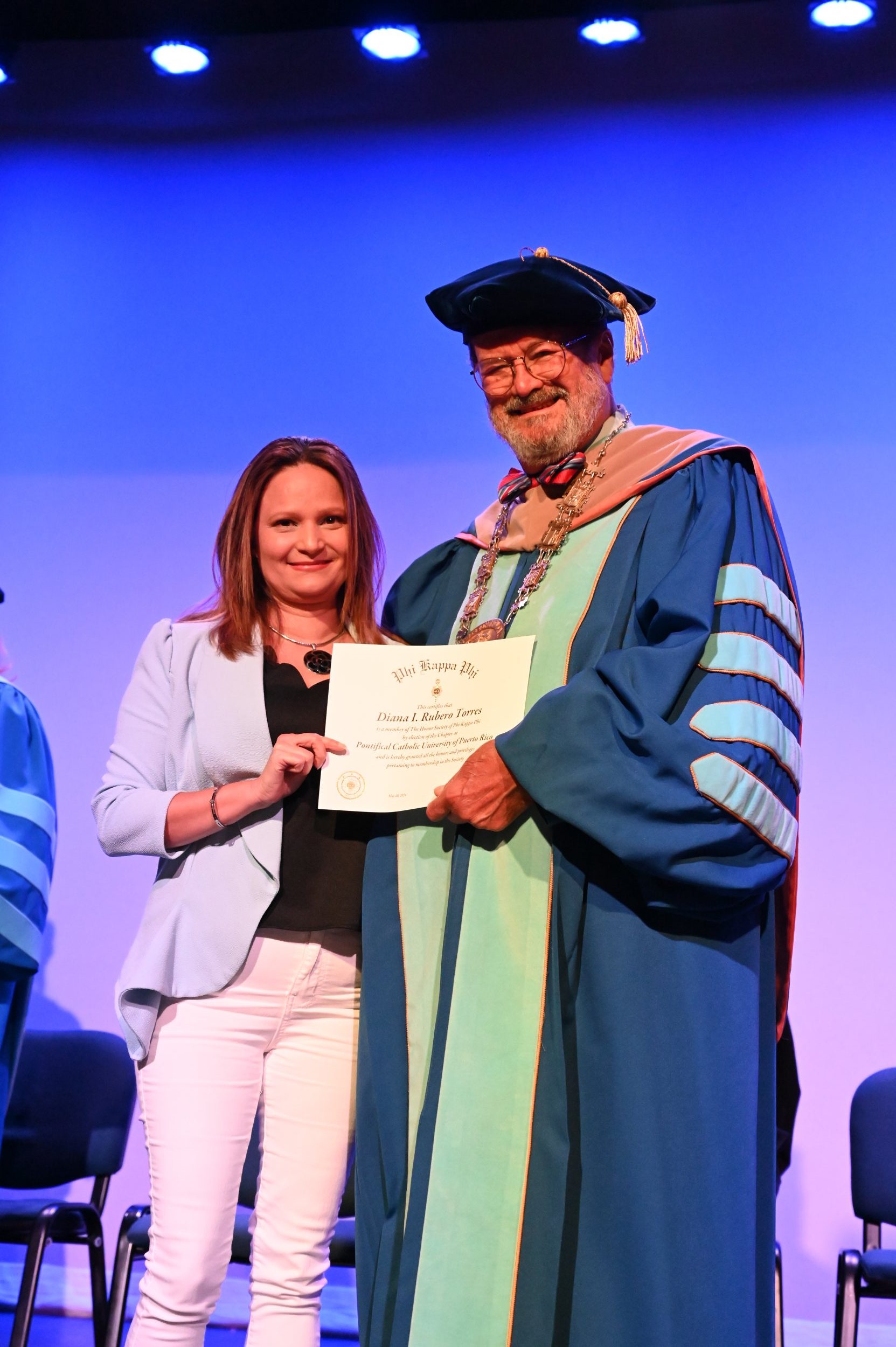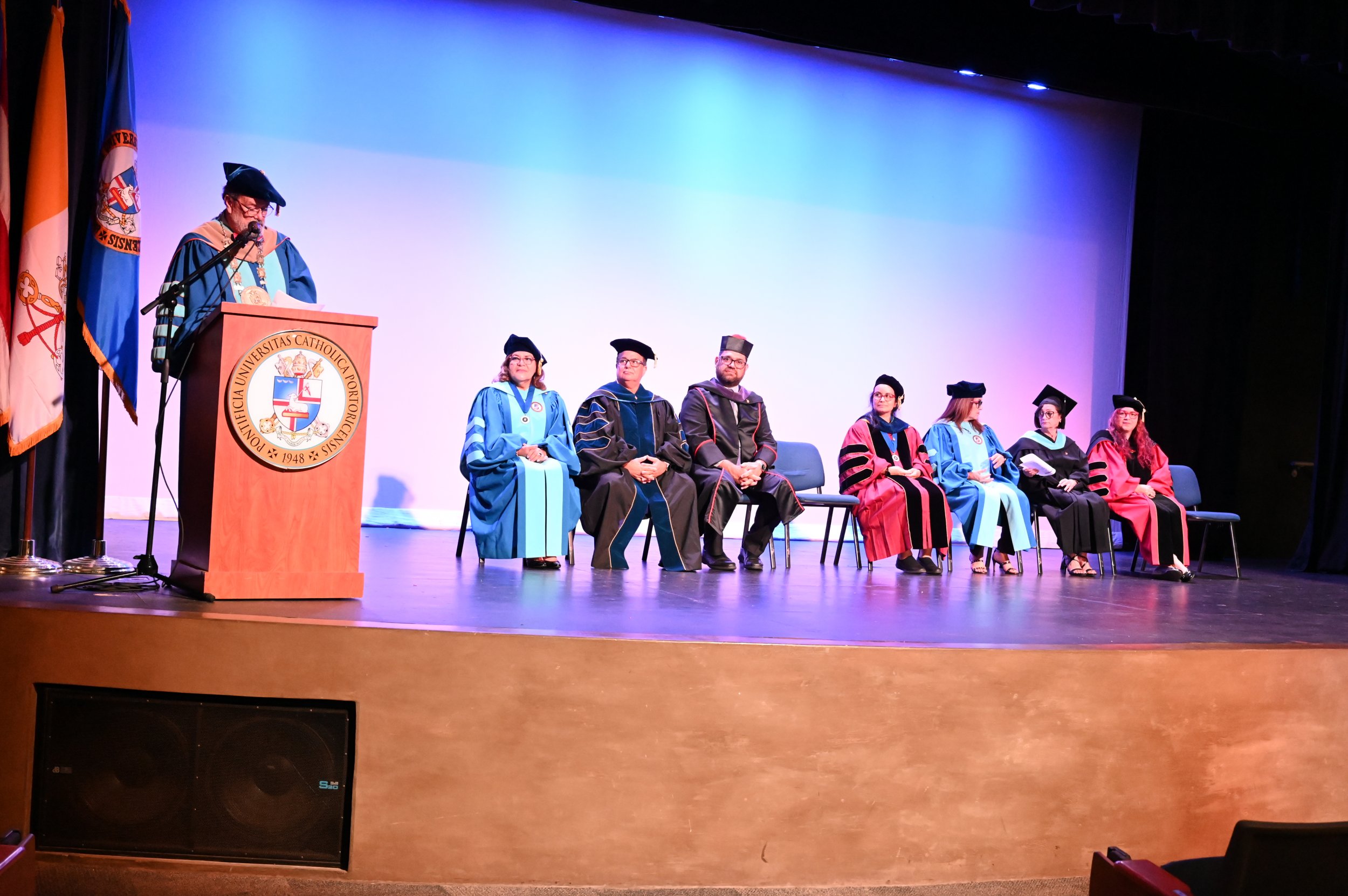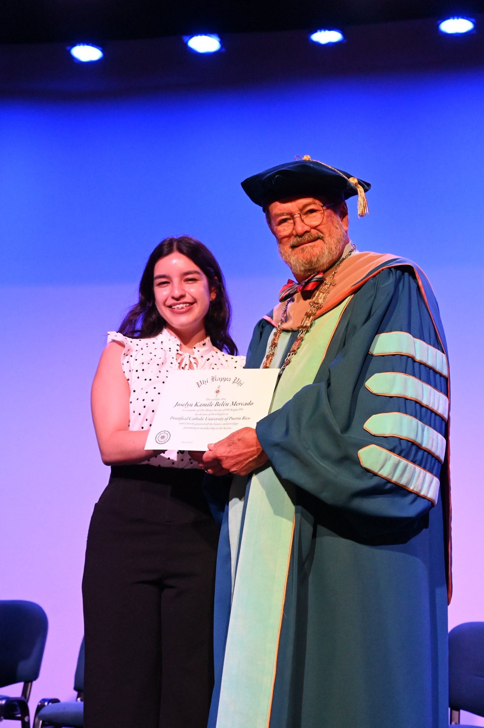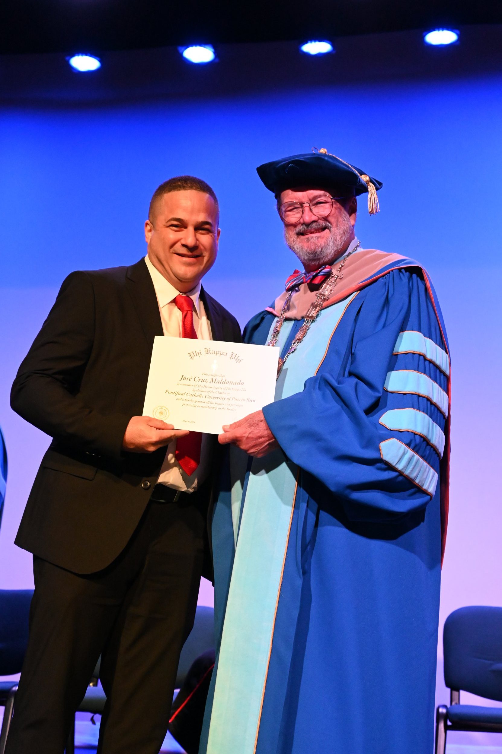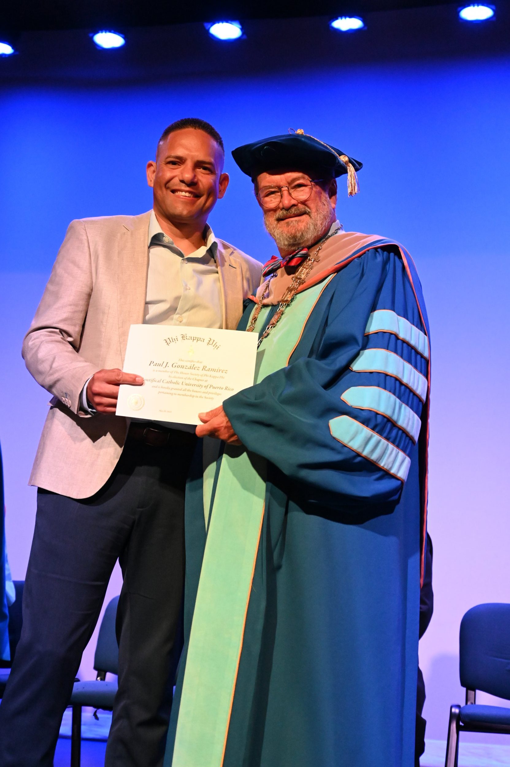 El teatro Mons. Vicente Murga fue la sede para los actos de iniciación de cincuenta nuevos miembros de la Phi Kappa Phi quienes con orgullo aceptaron la invitación a formar parte de esta importante sociedad de honor. “Hay que recordar el lema de Phi Kappa Phi ´Que el amor por la sabiduría rija a la humanidad´. Así que el primer beneficio de formar parte de Phi Kappa es recordar ese lema porque ese lema los va a acompañar el resto de la vida. Múltiples personas muy reconocidas en el mundo han formado parte de esta sociedad. Por lo tanto, se unen a una organización de mucho prestigio desde el punto de vista académico porque es una organización para honrar a los estudiantes, a la facultad y al personal no docente que valoran el que la sabiduría sea lo que rija la humanidad” sostuvo el Dr. Jorge Iván Vélez Arocho, presidente de la PUCPR.