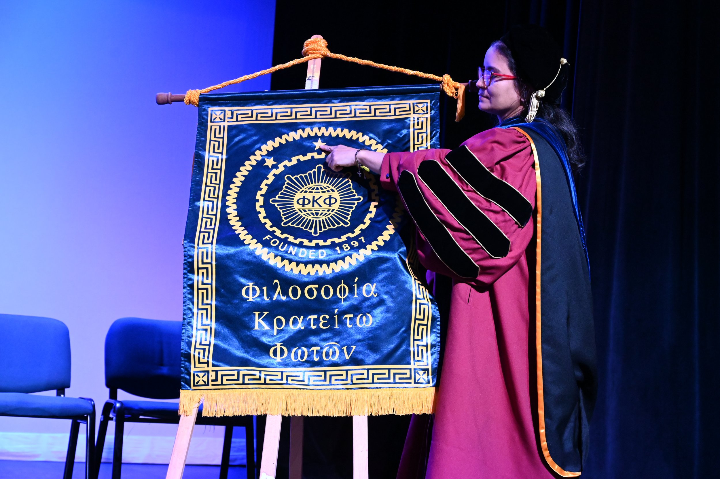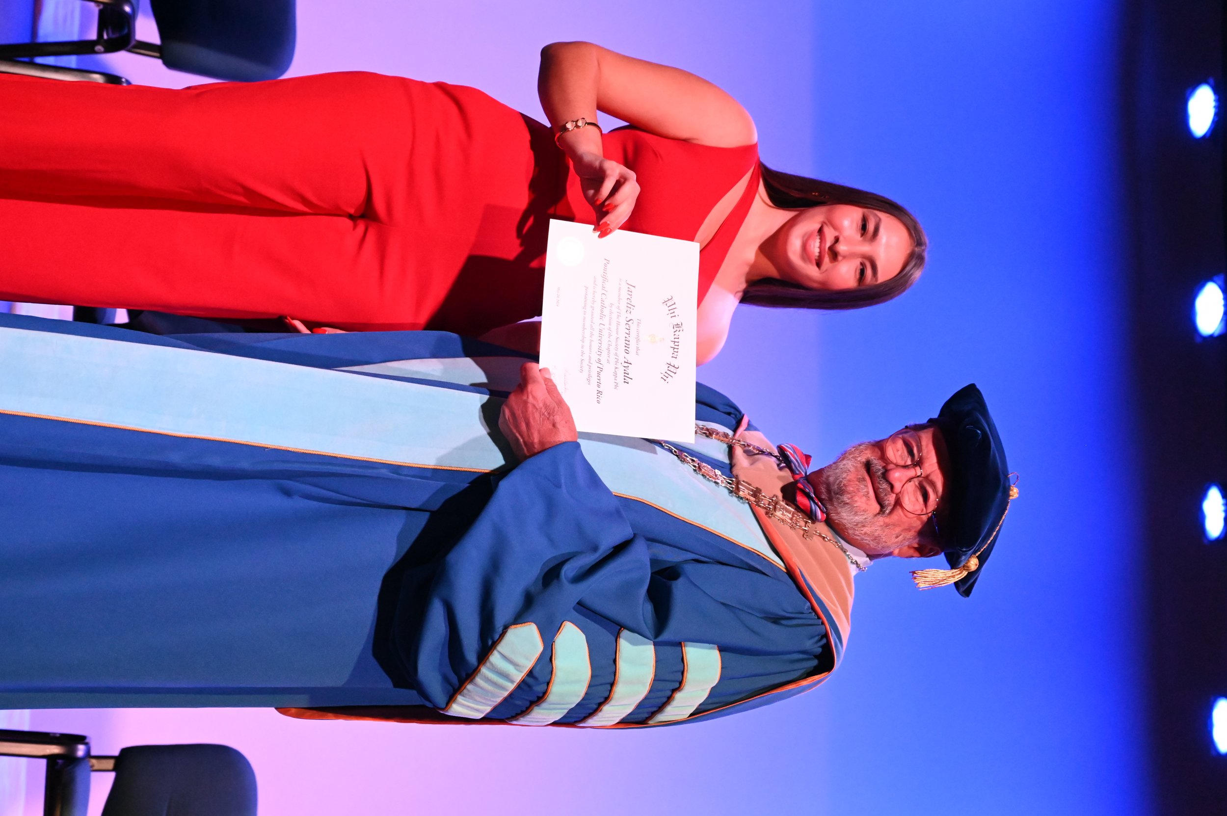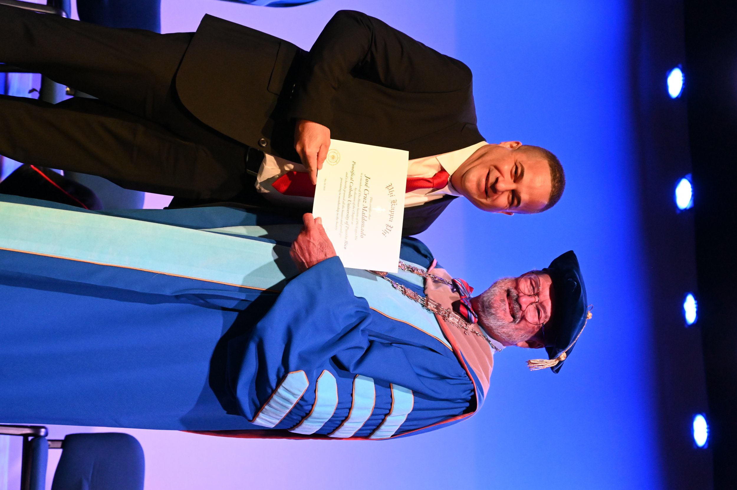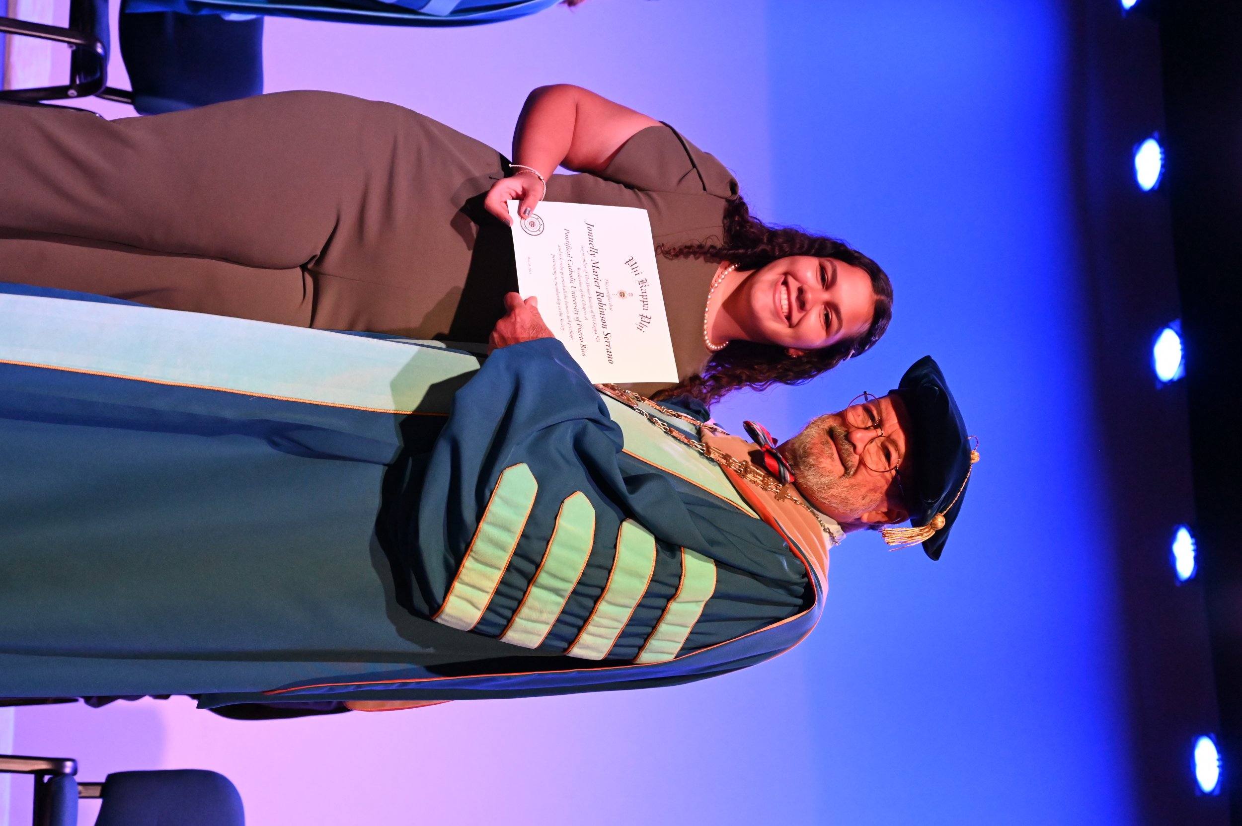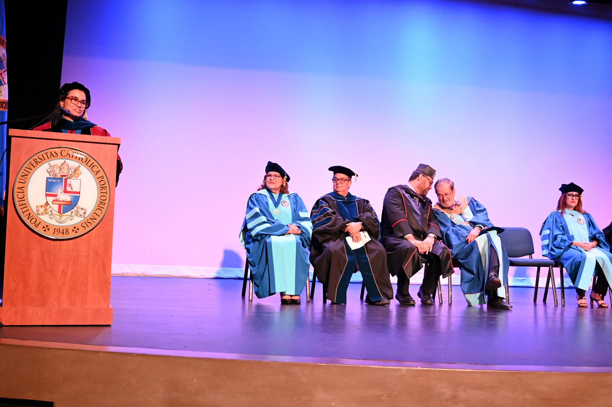 El teatro Mons. Vicente Murga fue la sede para los actos de iniciación de cincuenta nuevos miembros de la Phi Kappa Phi quienes con orgullo aceptaron la invitación a formar parte de esta importante sociedad de honor. “Hay que recordar el lema de Phi Kappa Phi ´Que el amor por la sabiduría rija a la humanidad´. Así que el primer beneficio de formar parte de Phi Kappa es recordar ese lema porque ese lema los va a acompañar el resto de la vida. Múltiples personas muy reconocidas en el mundo han formado parte de esta sociedad. Por lo tanto, se unen a una organización de mucho prestigio desde el punto de vista académico porque es una organización para honrar a los estudiantes, a la facultad y al personal no docente que valoran el que la sabiduría sea lo que rija la humanidad” sostuvo el Dr. Jorge Iván Vélez Arocho, presidente de la PUCPR.