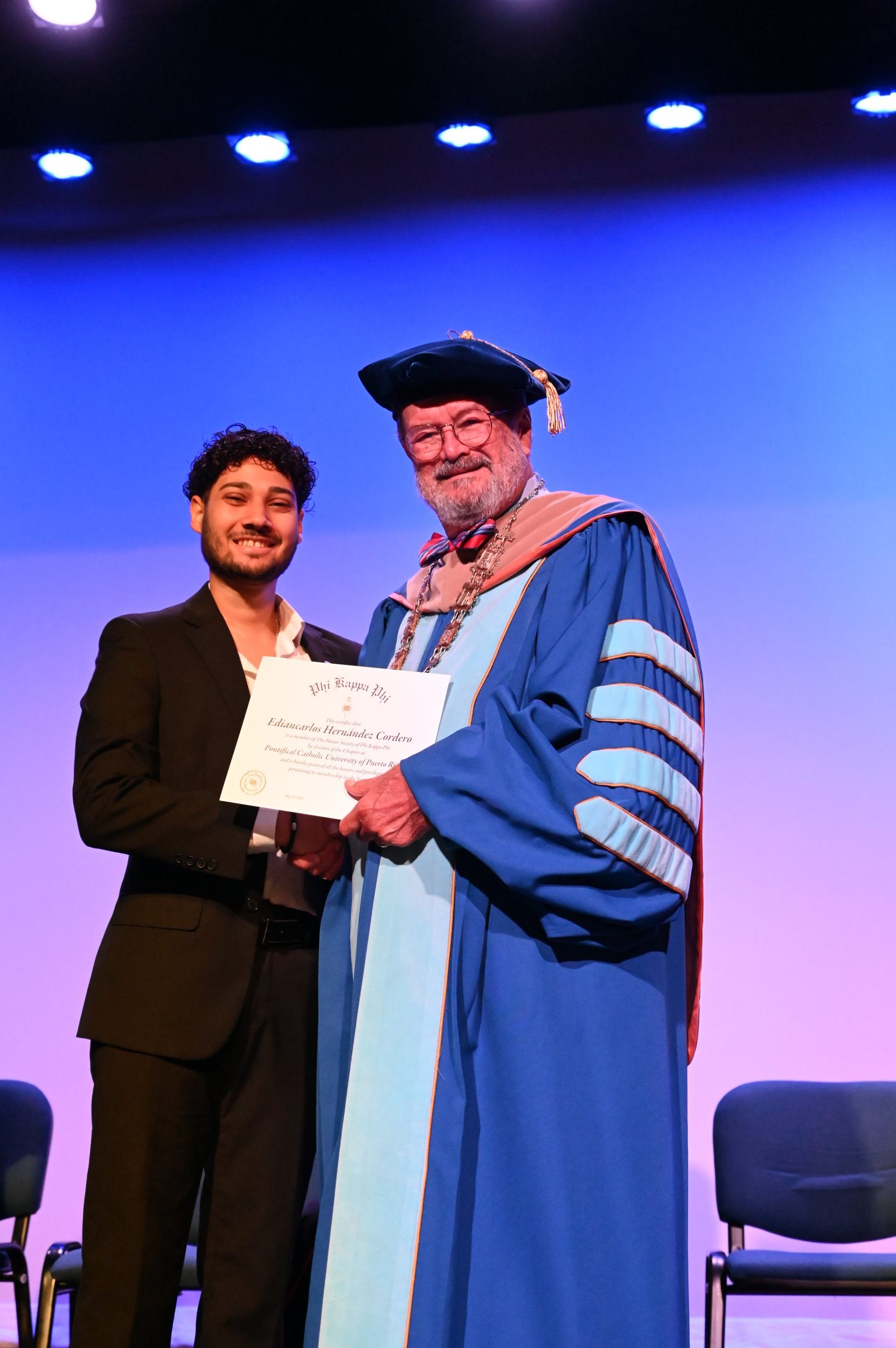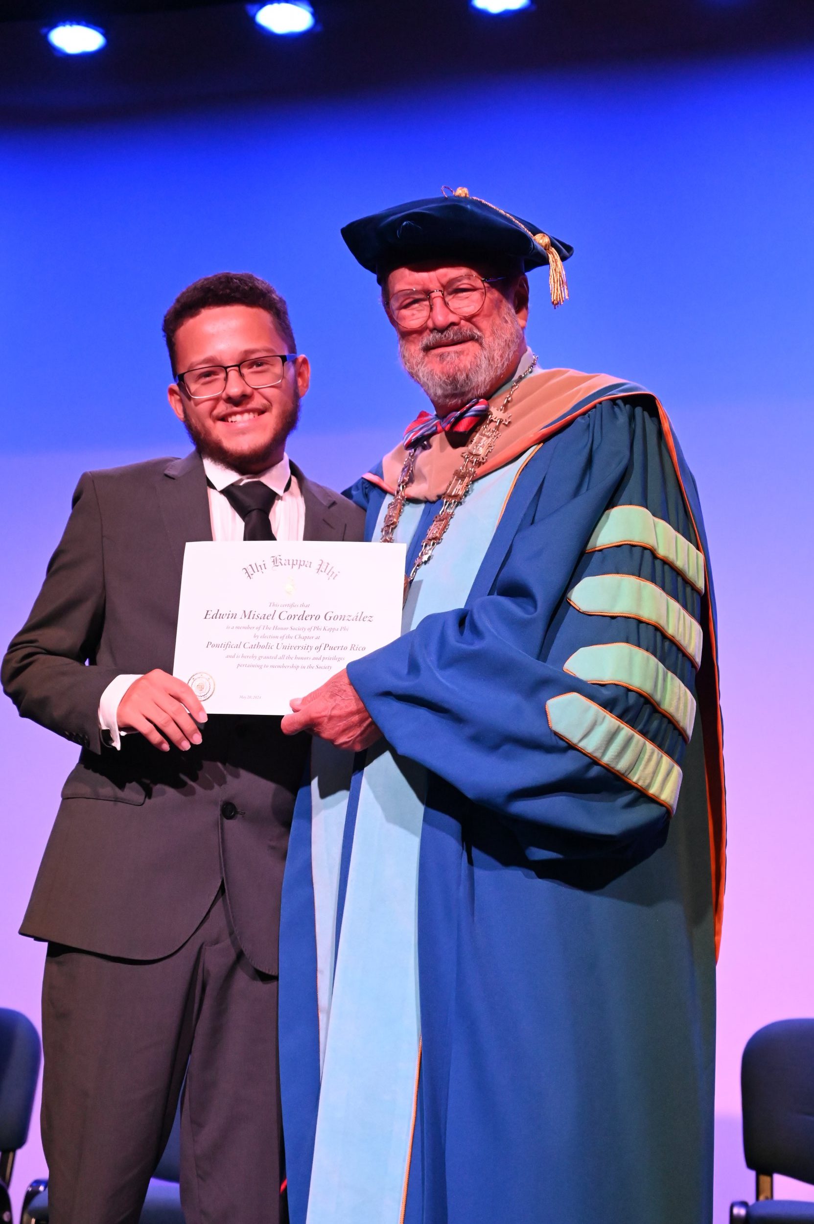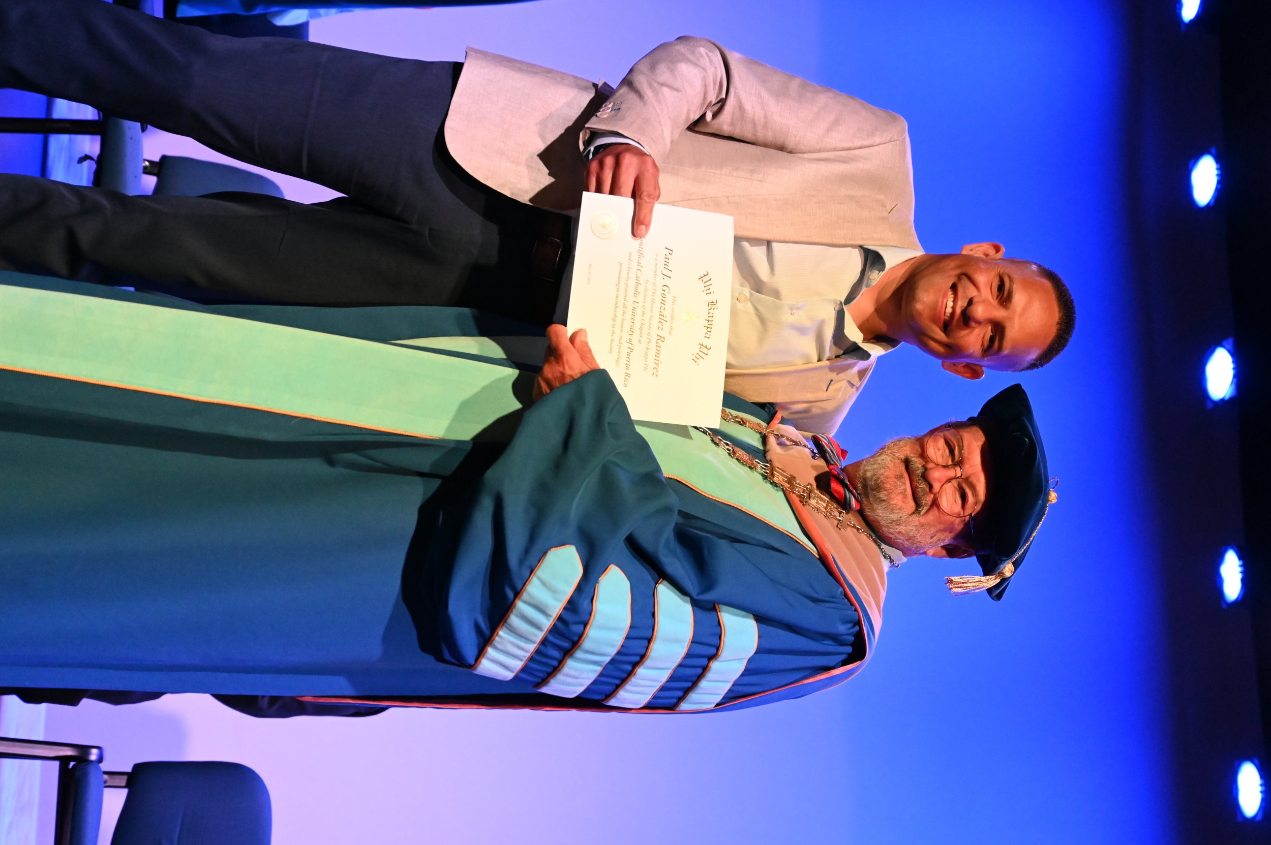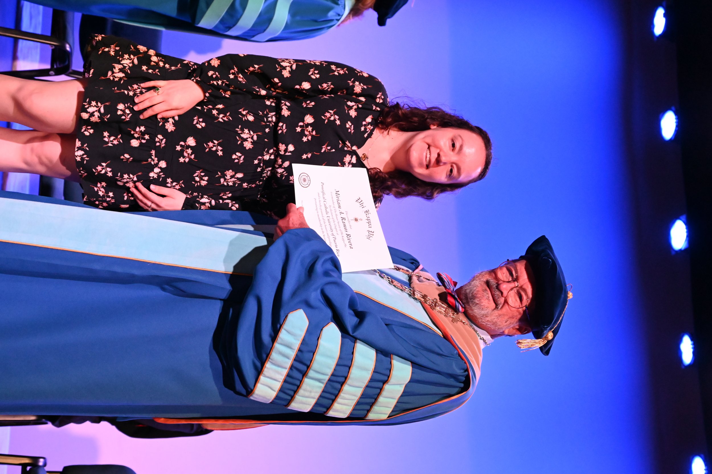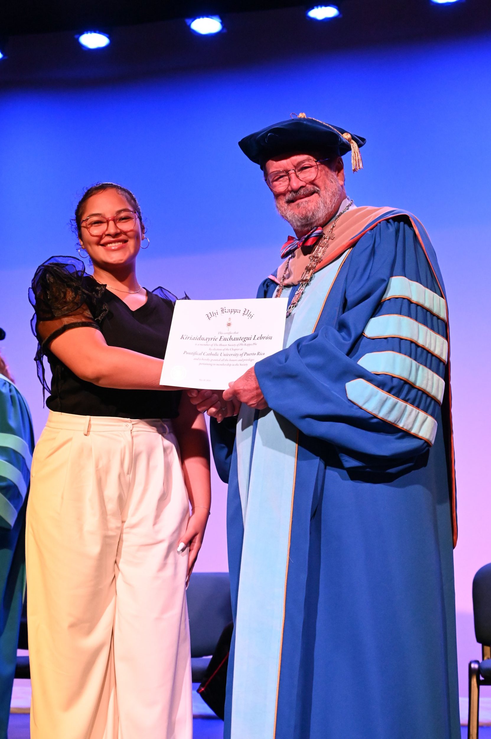 El teatro Mons. Vicente Murga fue la sede para los actos de iniciación de cincuenta nuevos miembros de la Phi Kappa Phi quienes con orgullo aceptaron la invitación a formar parte de esta importante sociedad de honor. “Hay que recordar el lema de Phi Kappa Phi ´Que el amor por la sabiduría rija a la humanidad´. Así que el primer beneficio de formar parte de Phi Kappa es recordar ese lema porque ese lema los va a acompañar el resto de la vida. Múltiples personas muy reconocidas en el mundo han formado parte de esta sociedad. Por lo tanto, se unen a una organización de mucho prestigio desde el punto de vista académico porque es una organización para honrar a los estudiantes, a la facultad y al personal no docente que valoran el que la sabiduría sea lo que rija la humanidad” sostuvo el Dr. Jorge Iván Vélez Arocho, presidente de la PUCPR.