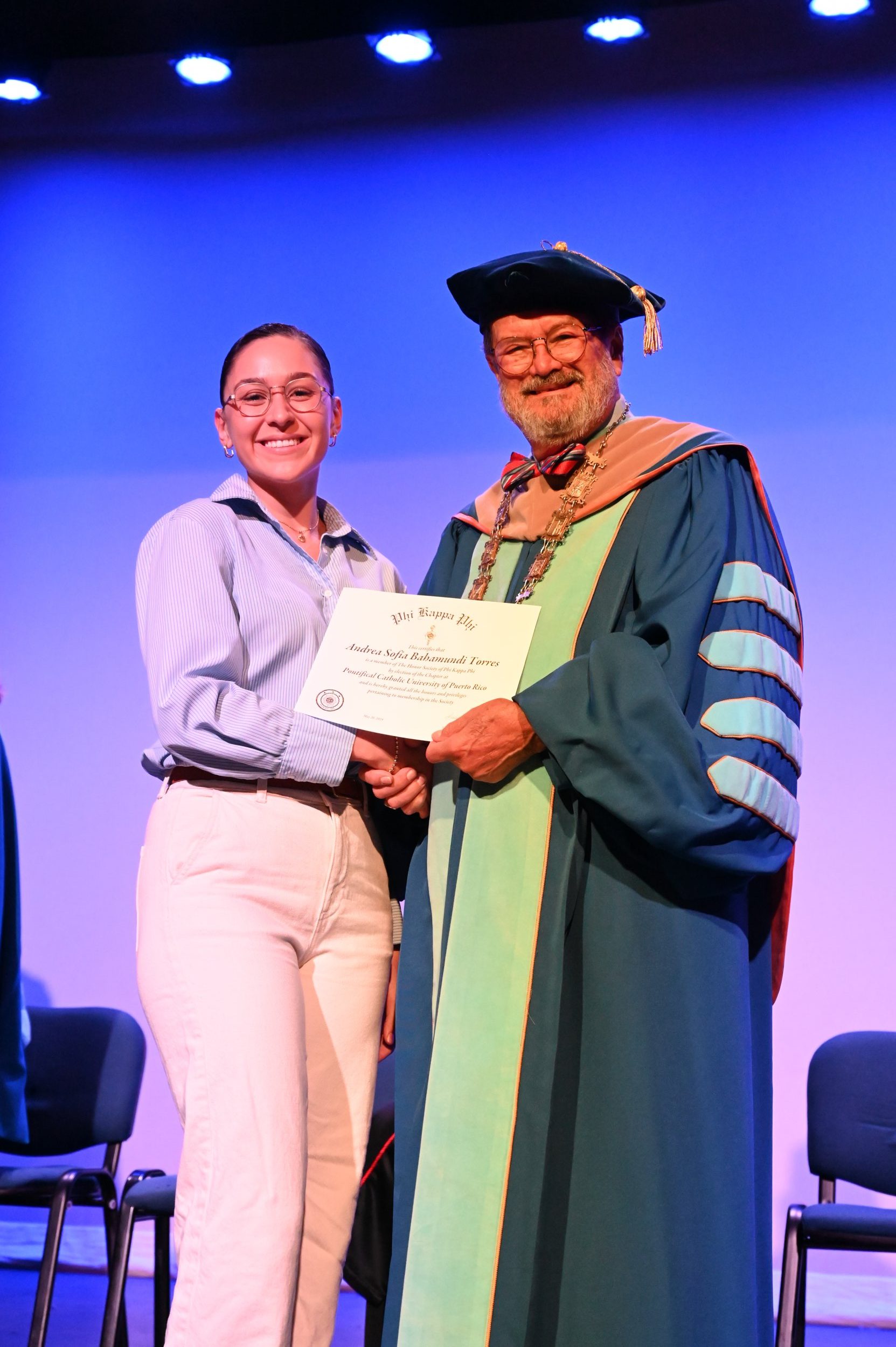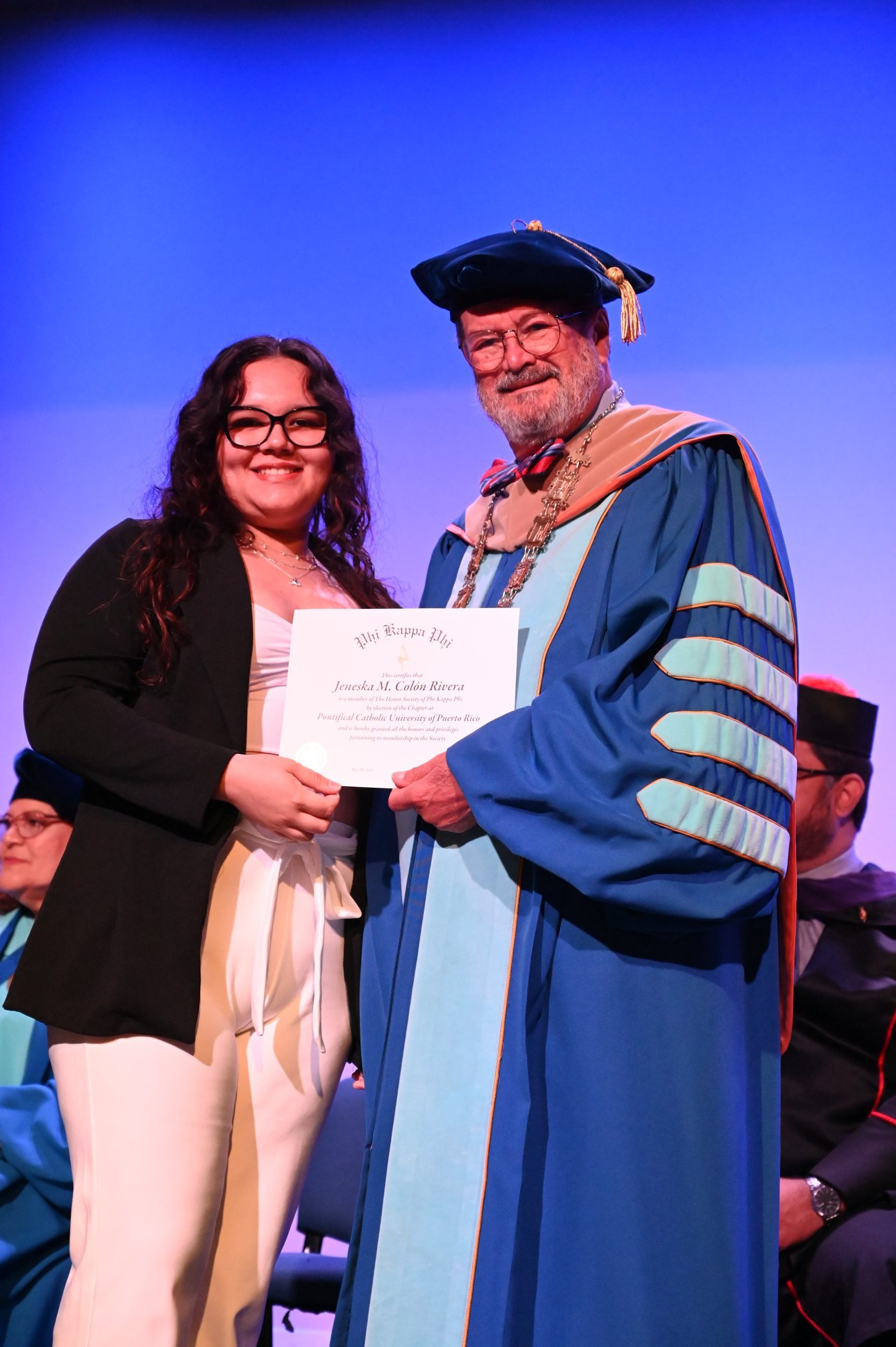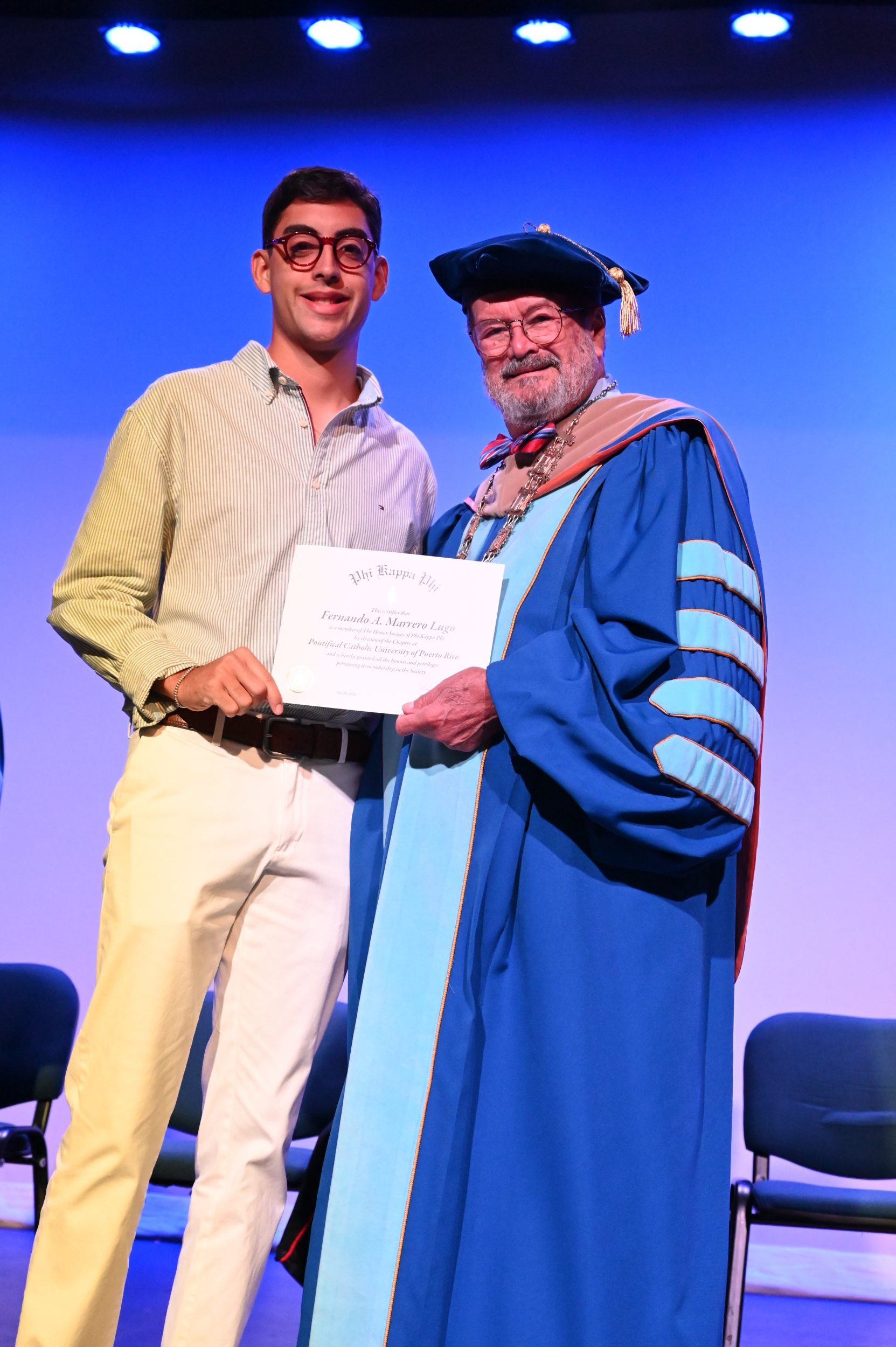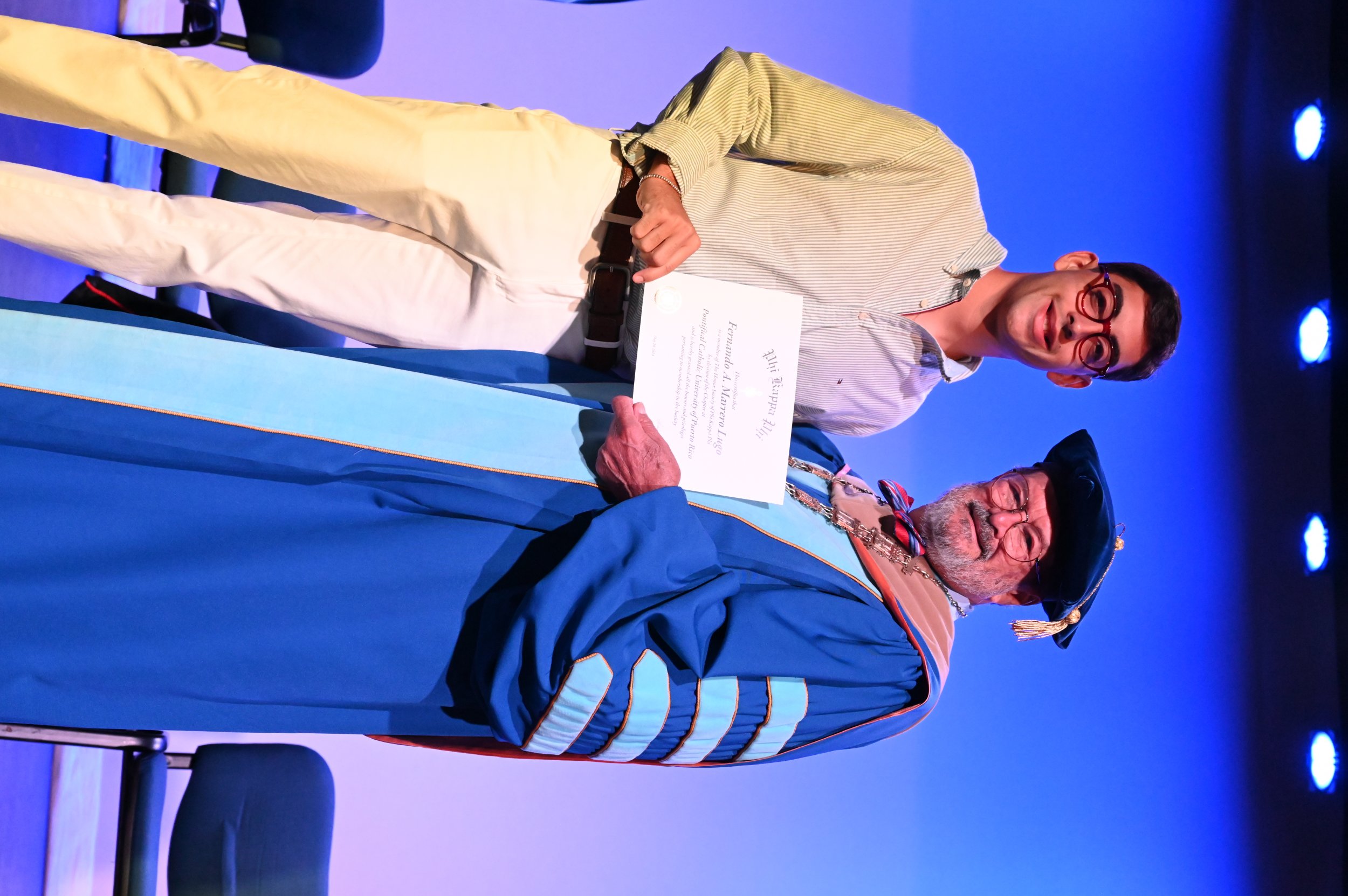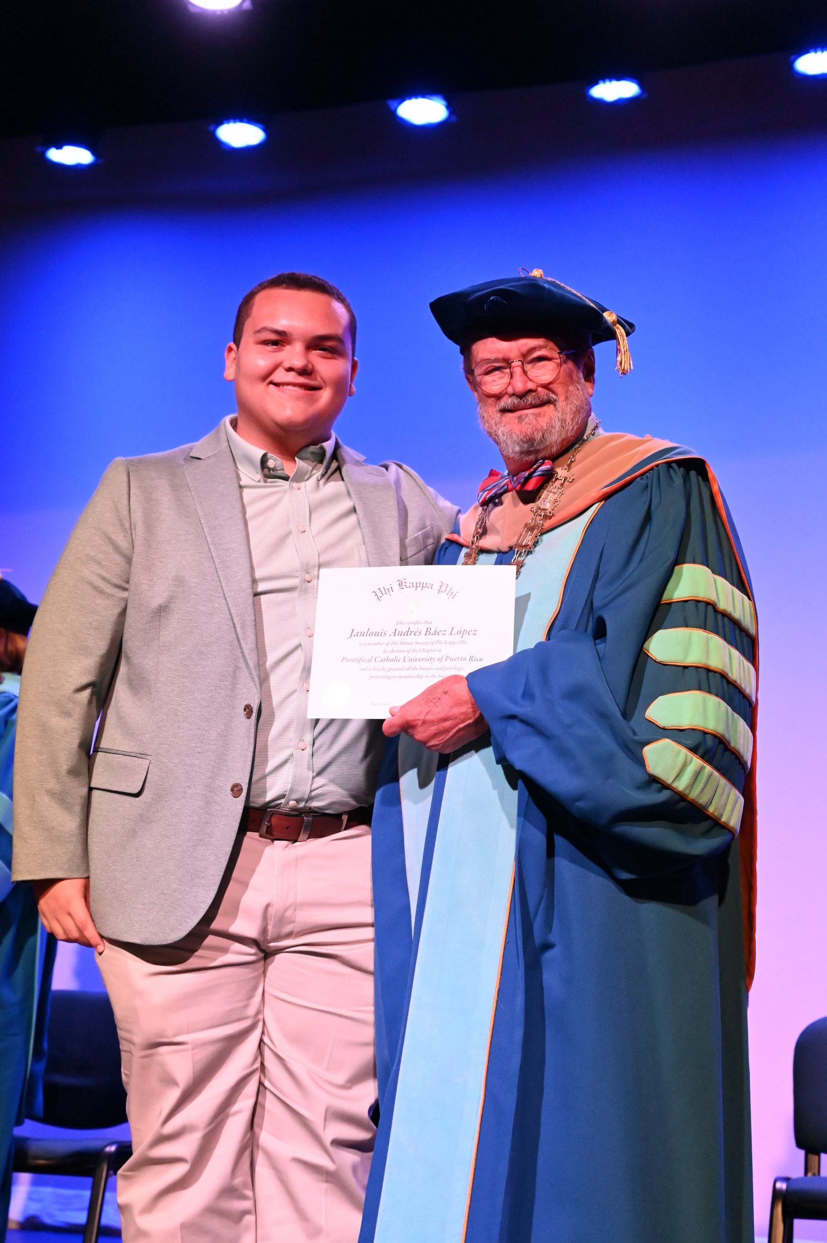 El teatro Mons. Vicente Murga fue la sede para los actos de iniciación de cincuenta nuevos miembros de la Phi Kappa Phi quienes con orgullo aceptaron la invitación a formar parte de esta importante sociedad de honor. “Hay que recordar el lema de Phi Kappa Phi ´Que el amor por la sabiduría rija a la humanidad´. Así que el primer beneficio de formar parte de Phi Kappa es recordar ese lema porque ese lema los va a acompañar el resto de la vida. Múltiples personas muy reconocidas en el mundo han formado parte de esta sociedad. Por lo tanto, se unen a una organización de mucho prestigio desde el punto de vista académico porque es una organización para honrar a los estudiantes, a la facultad y al personal no docente que valoran el que la sabiduría sea lo que rija la humanidad” sostuvo el Dr. Jorge Iván Vélez Arocho, presidente de la PUCPR.