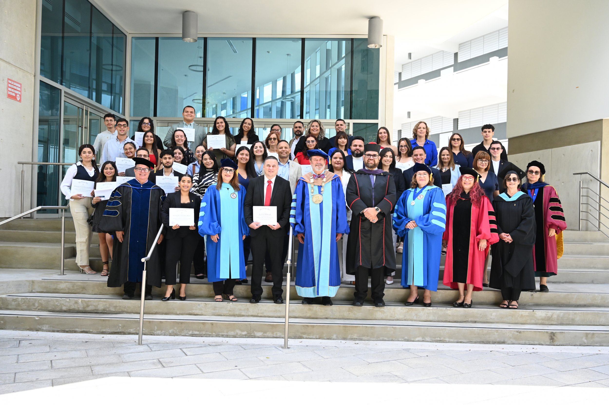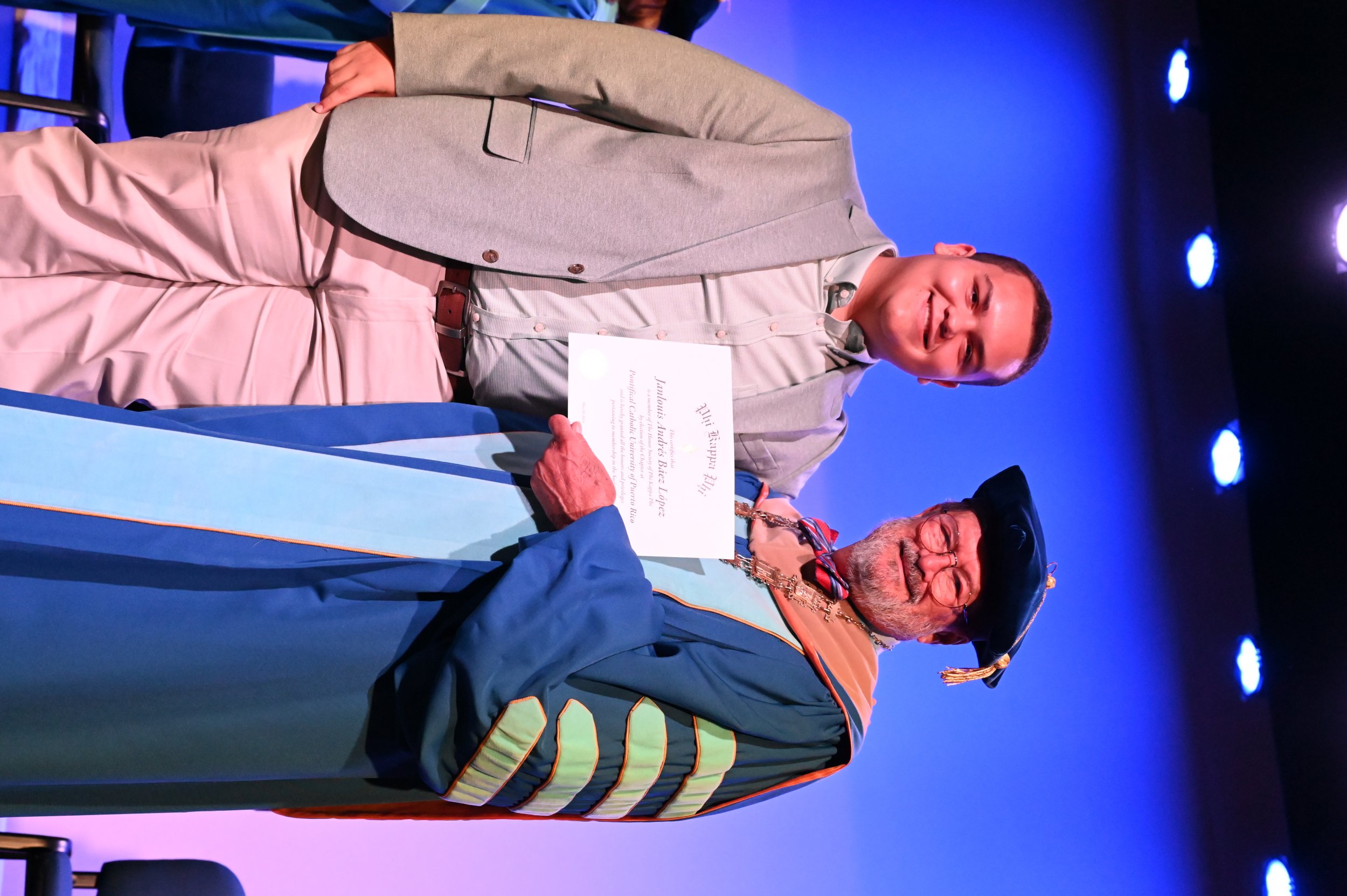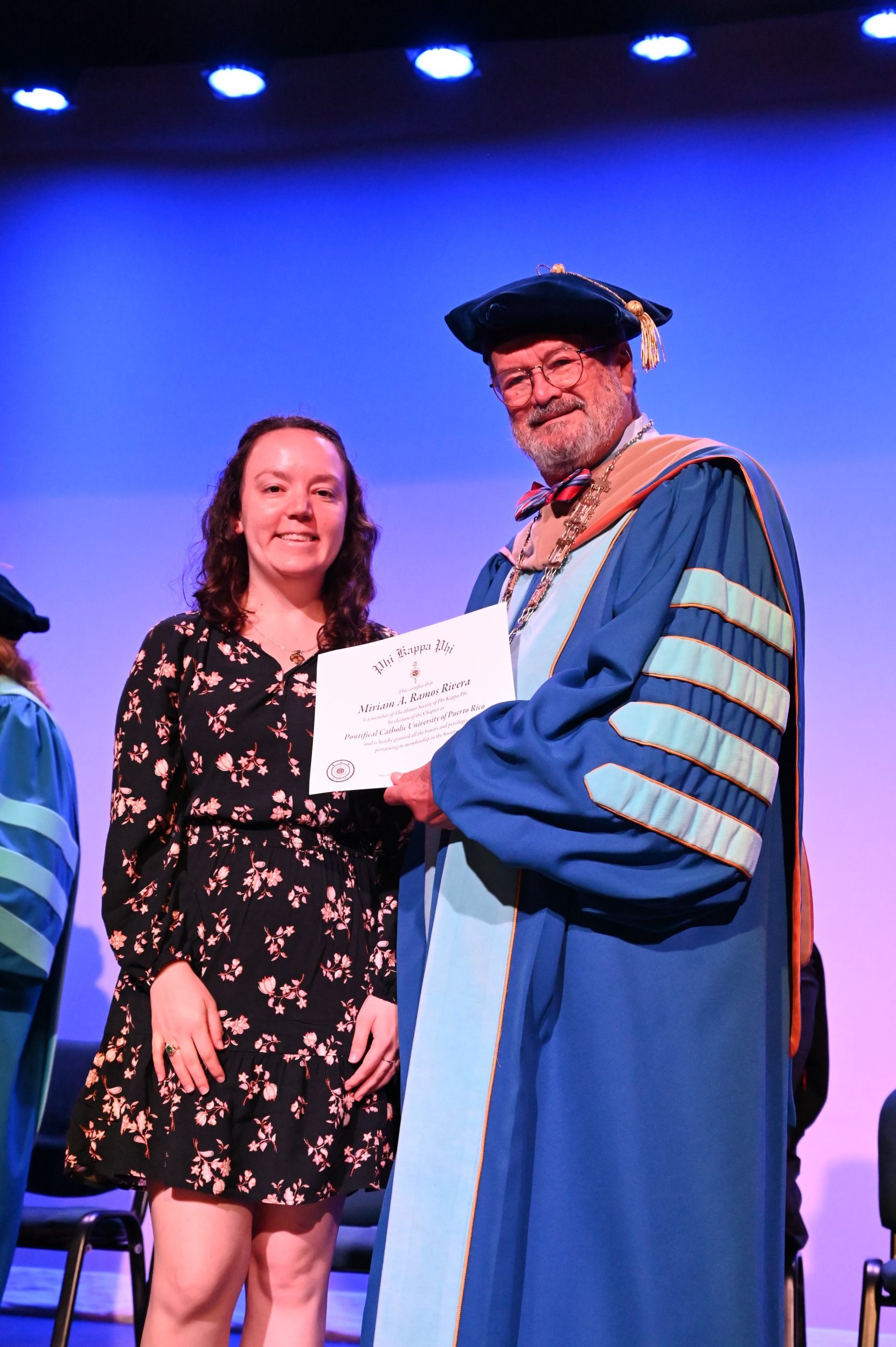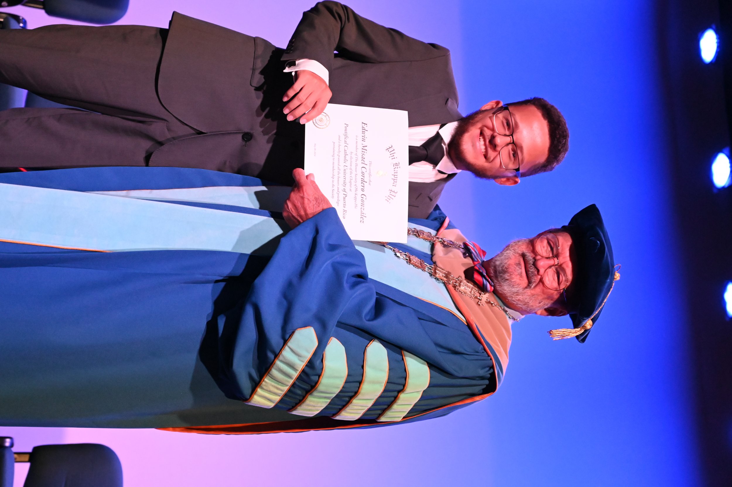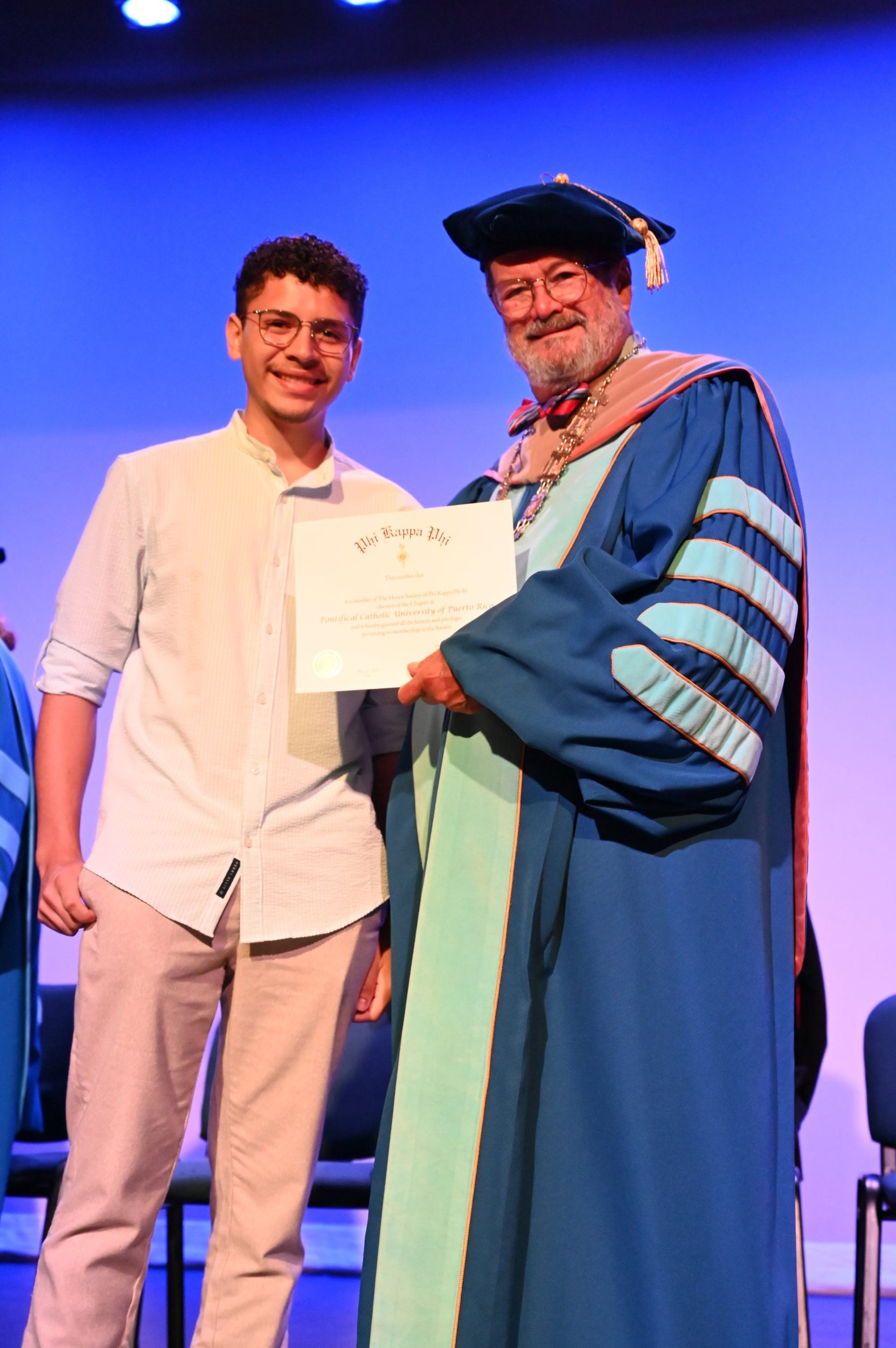 El teatro Mons. Vicente Murga fue la sede para los actos de iniciación de cincuenta nuevos miembros de la Phi Kappa Phi quienes con orgullo aceptaron la invitación a formar parte de esta importante sociedad de honor. “Hay que recordar el lema de Phi Kappa Phi ´Que el amor por la sabiduría rija a la humanidad´. Así que el primer beneficio de formar parte de Phi Kappa es recordar ese lema porque ese lema los va a acompañar el resto de la vida. Múltiples personas muy reconocidas en el mundo han formado parte de esta sociedad. Por lo tanto, se unen a una organización de mucho prestigio desde el punto de vista académico porque es una organización para honrar a los estudiantes, a la facultad y al personal no docente que valoran el que la sabiduría sea lo que rija la humanidad” sostuvo el Dr. Jorge Iván Vélez Arocho, presidente de la PUCPR.