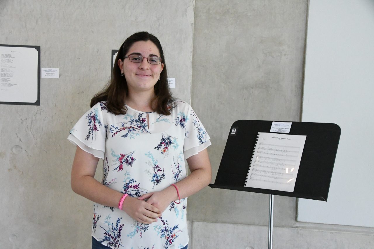 Alexandra Bermúdez, estudiante de bachillerato, fue una de las participantes del certamen y ganadora del primer lugar en la categoría de composición musical. “No esperaba ganar.  Fue un reto que me lancé para saber si era capaz de lograrlo.  Este proceso se vuelve bien personal. No es lo mismo tocar una composición de otra persona versus el tú ir haciéndolo y ver cómo, poco a poco, va adquiriendo personalidad y se vuelve más profundo.  Mi proyecto de composición musical es una canción para voz, preferiblemente femenina, acompañada de piano.  El mensaje de la pieza es que, como estudiante, vas a vivir altas y bajas, pero es un llamado a mantenerse, a no dejarse desanimar por los eventos que surjan alrededor y eventualmente llegar a ese final en el que posiblemente no seas la misma persona que eras cuando comenzaste a estudiar” explicó Alexandra.
