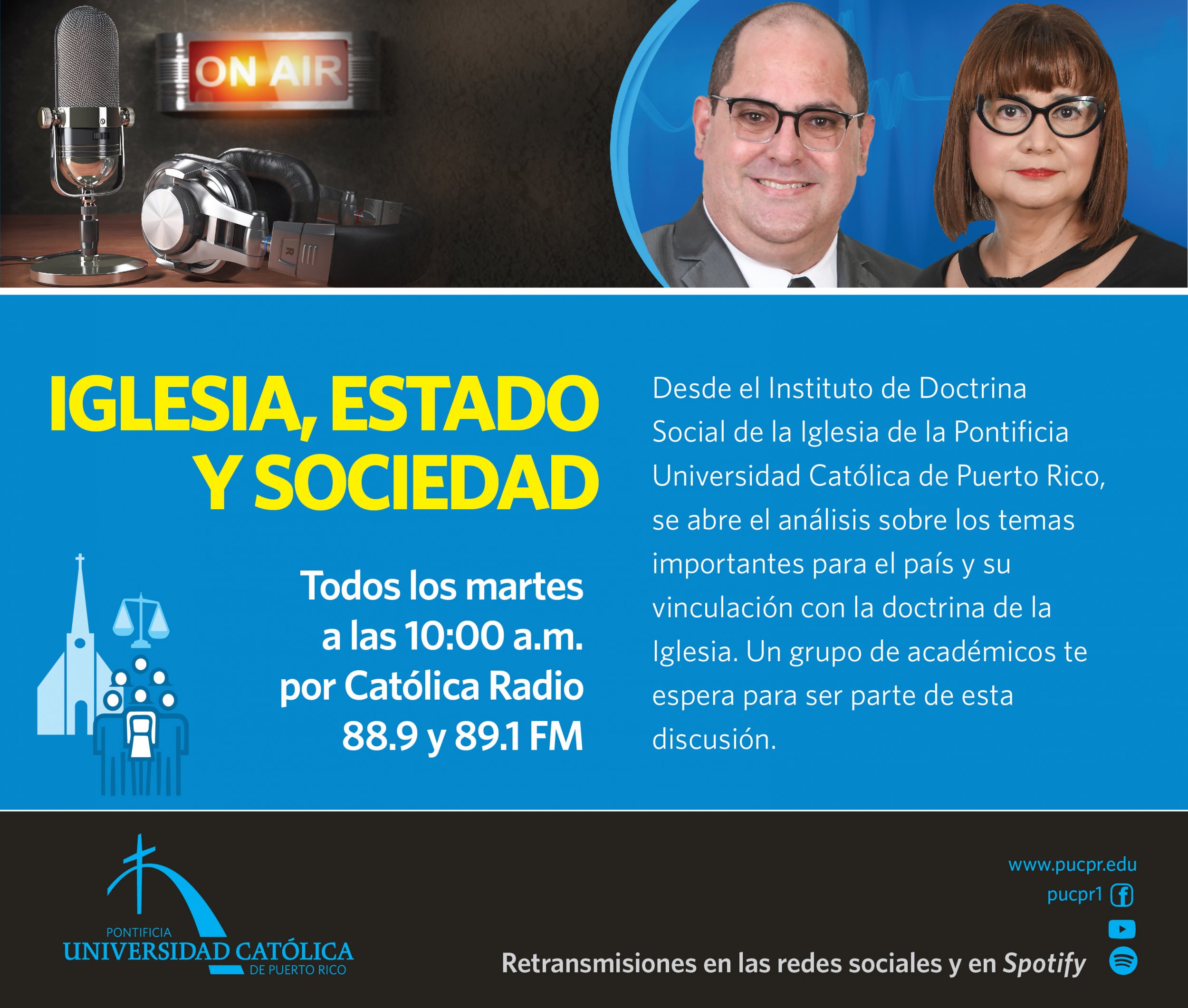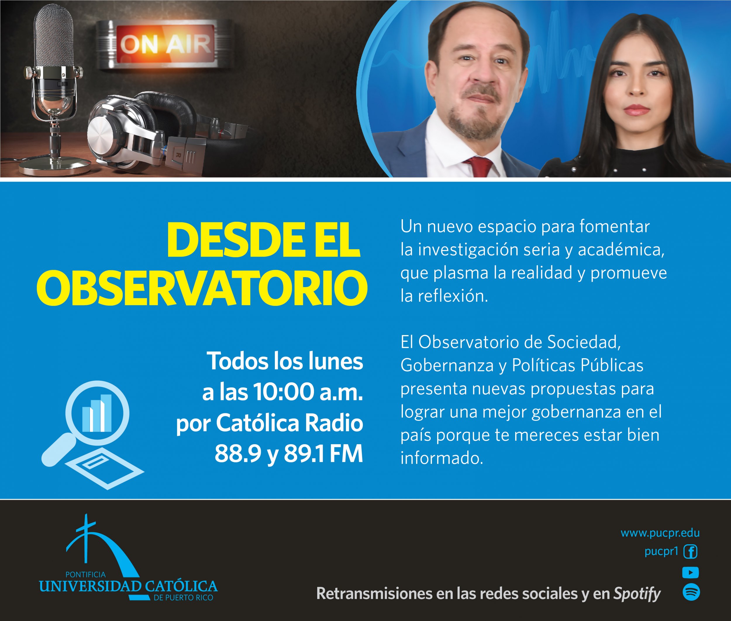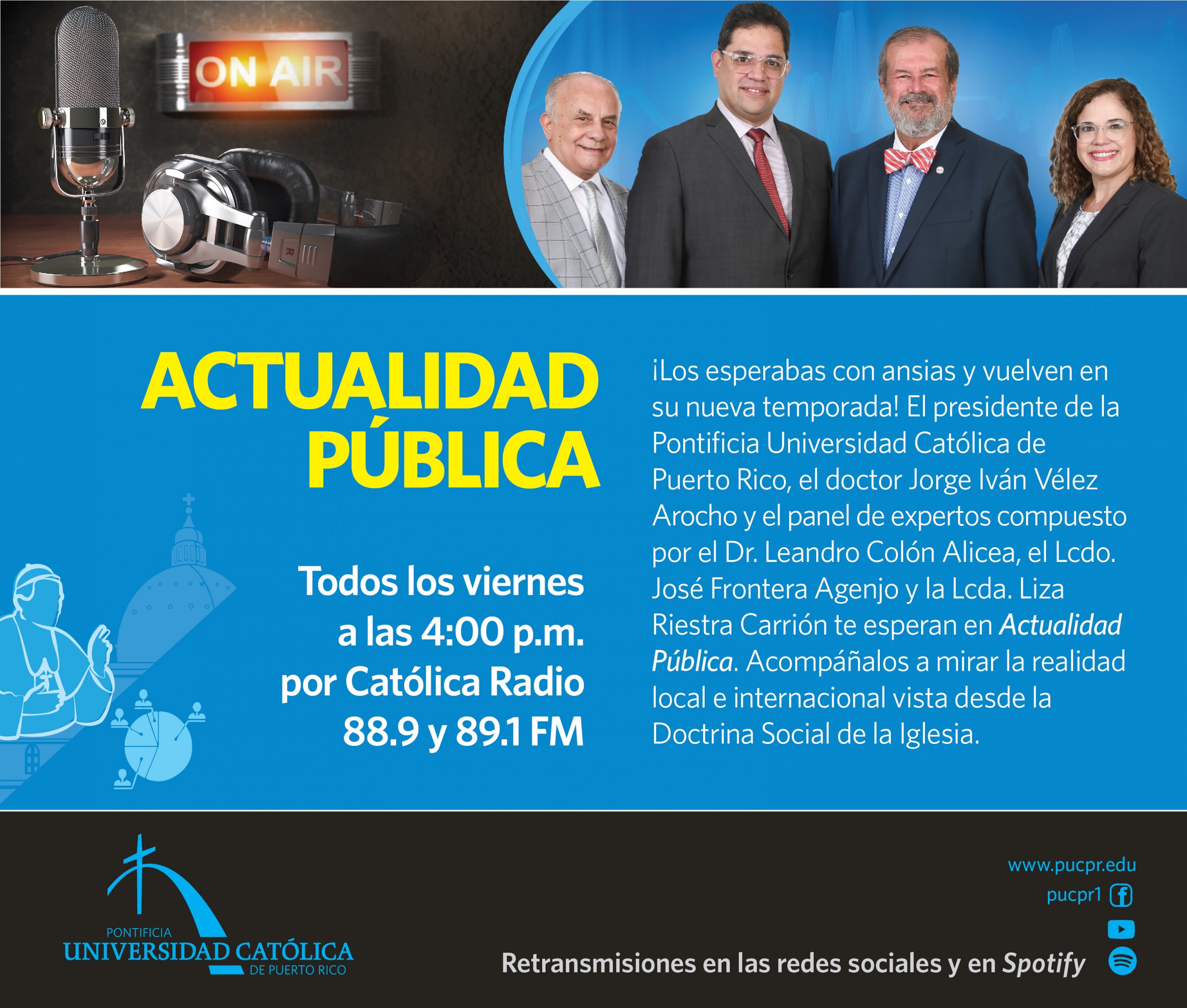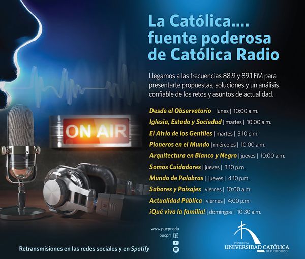 La Pontificia Universidad Católica de Puerto Rico se convirtió en fuente poderosa de análisis, propuestas y de un espacio confiable para ver y juzgar la realidad del país y del mundo. A través de las ondas radiales de Católica Radio, importantes voces de La Católica abren el espacio serio para que tú formes parte del diálogo.