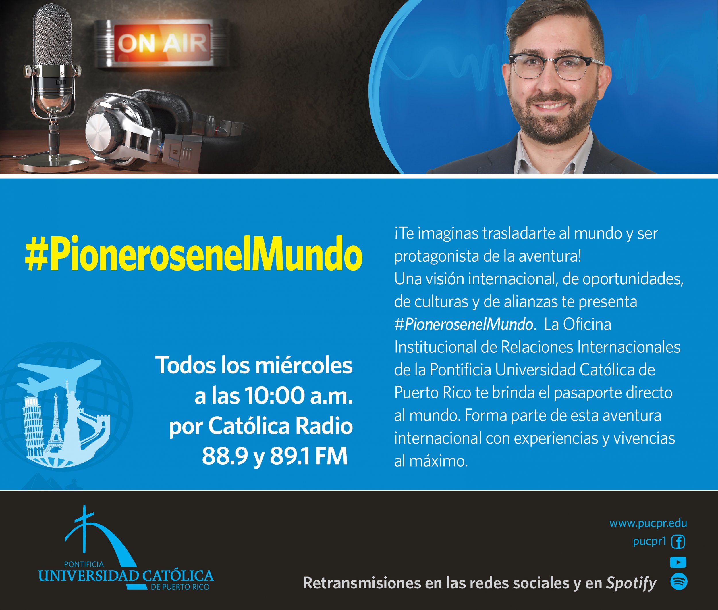 En este primer edición conocerás el Programa de Intercambio Estudiantil con la participación de la Sra. María Reyes Lebrón, oficial de Servicios al Estudiante, quien está a cargo del Programa apoyando a los estudiantes internacionales en sus procesos de solicitud a la PUCPR, y a los estudiantes de PUCPR en sus procesos de solicitud a universidades internacionales asociadas con La Católica. Se presentan testimonios de estudiantes internacionales tomando cursos en la PUCPR de forma presencial y virtual, por medio del programa de movilidad académica Americarum Mobilitas de la Organización de Universidades Católicas de América Latina y el Caribe (ODUCAL). Finaliza el programa con la entrevista a la Prof. Lindamar Fernández, trabajadora social del Programa de Integración y Calidad de Vida, quien participó del programa en la Pontificia Universidad Católica de Chile.