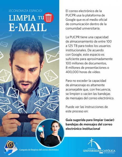 El director ejecutivo de la Oficina de de Telecomunicaciones y Tecnologías de la Información Pontificia Universidad Católica de Puerto Rico, Dr. Edgardo Avilés Garay, hizo un llamado a la comunidad universitaria a liberar espacio en el correo electrónico institucional para así maximizar el servicio de las plataformas digitales de comunicación.