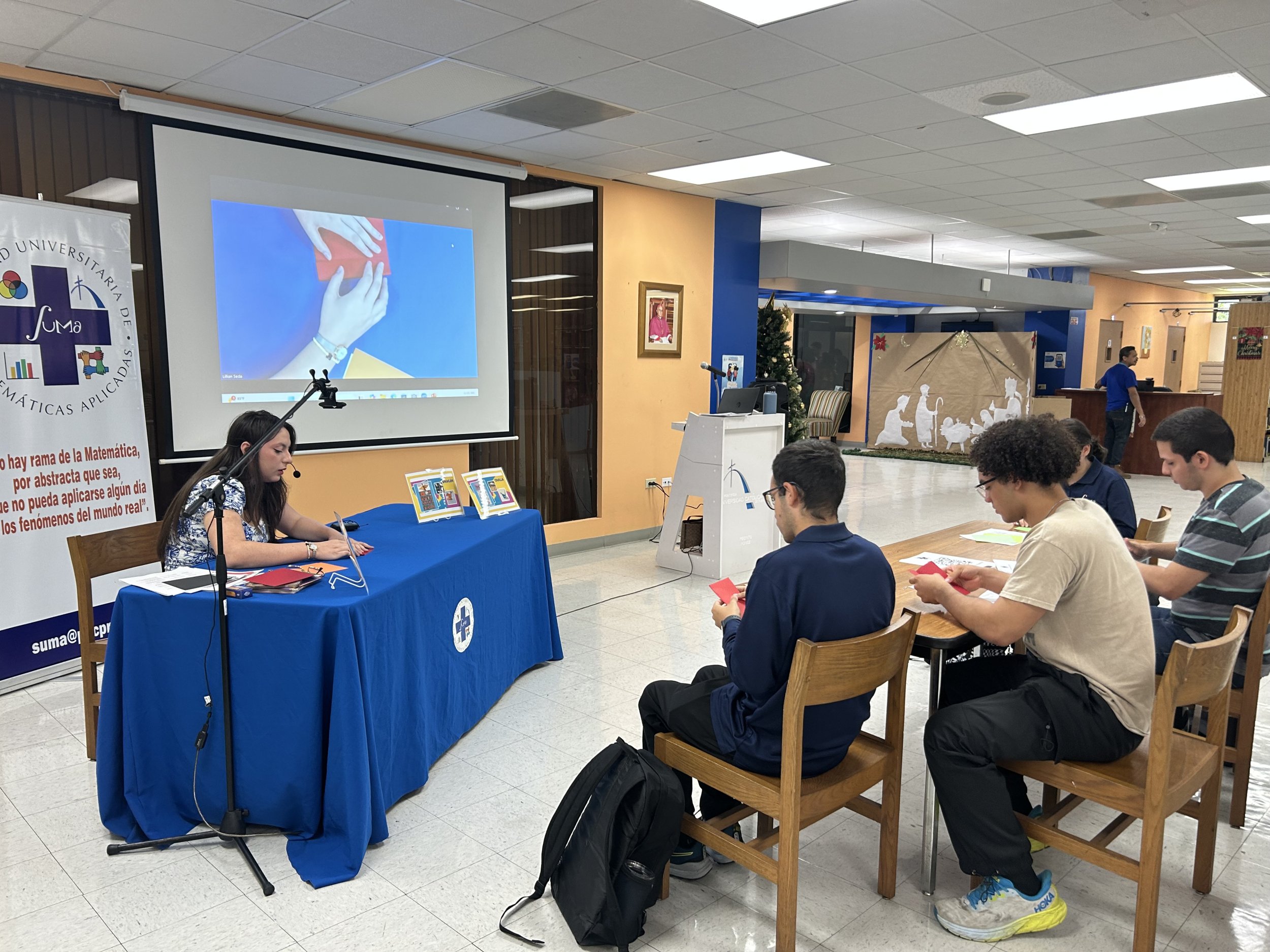 La profesora también resaltó “La sección práctica del taller estuvo a cargo de la estudiante de tercer año de Ciencias Biomédicas, Gabriela Pacheco, quien guió a los participantes en la confección de sus propias figuras de origami, promoviendo el aprendizaje activo y la creatividad. Además, SUMA presentó en la Biblioteca Beato Carlos Manuel Cecilio Rodríguez Santiago una exhibición de figuras confeccionadas por la estudiante, acompañada de material educativo sobre la estrecha relación entre el origami y la geometría.