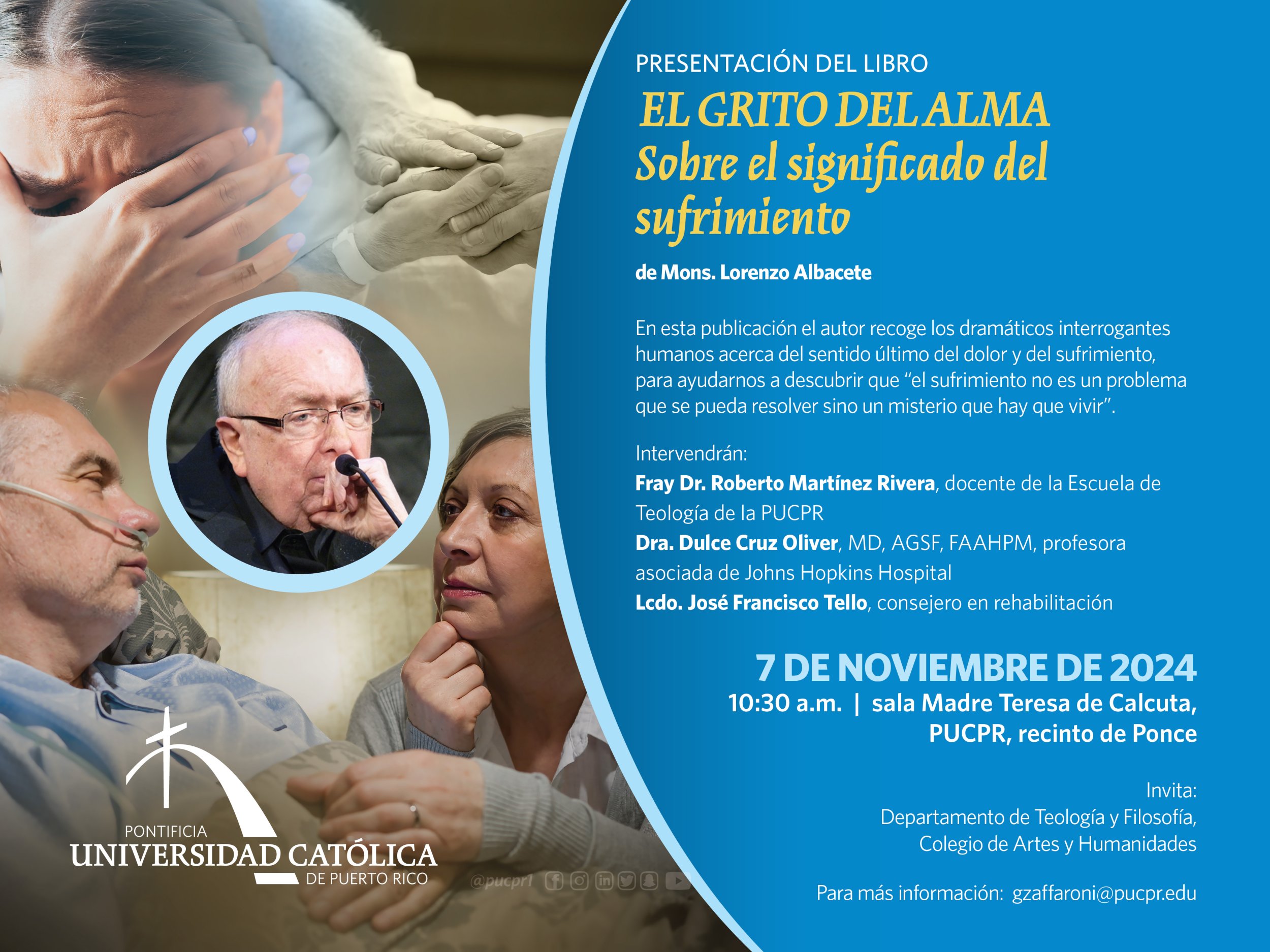 El grito del alma sobre el significado del sufrimiento By celimer_torres@pucpr.edu | November 1, 2024 La publicación recoge los dramáticos interrogantes humanos acerca del sentido último del dolor y del sufrimiento Posted in General ← Celebremos nuestra puertorriqueñidadEspiritualidad en la psicoterapia →