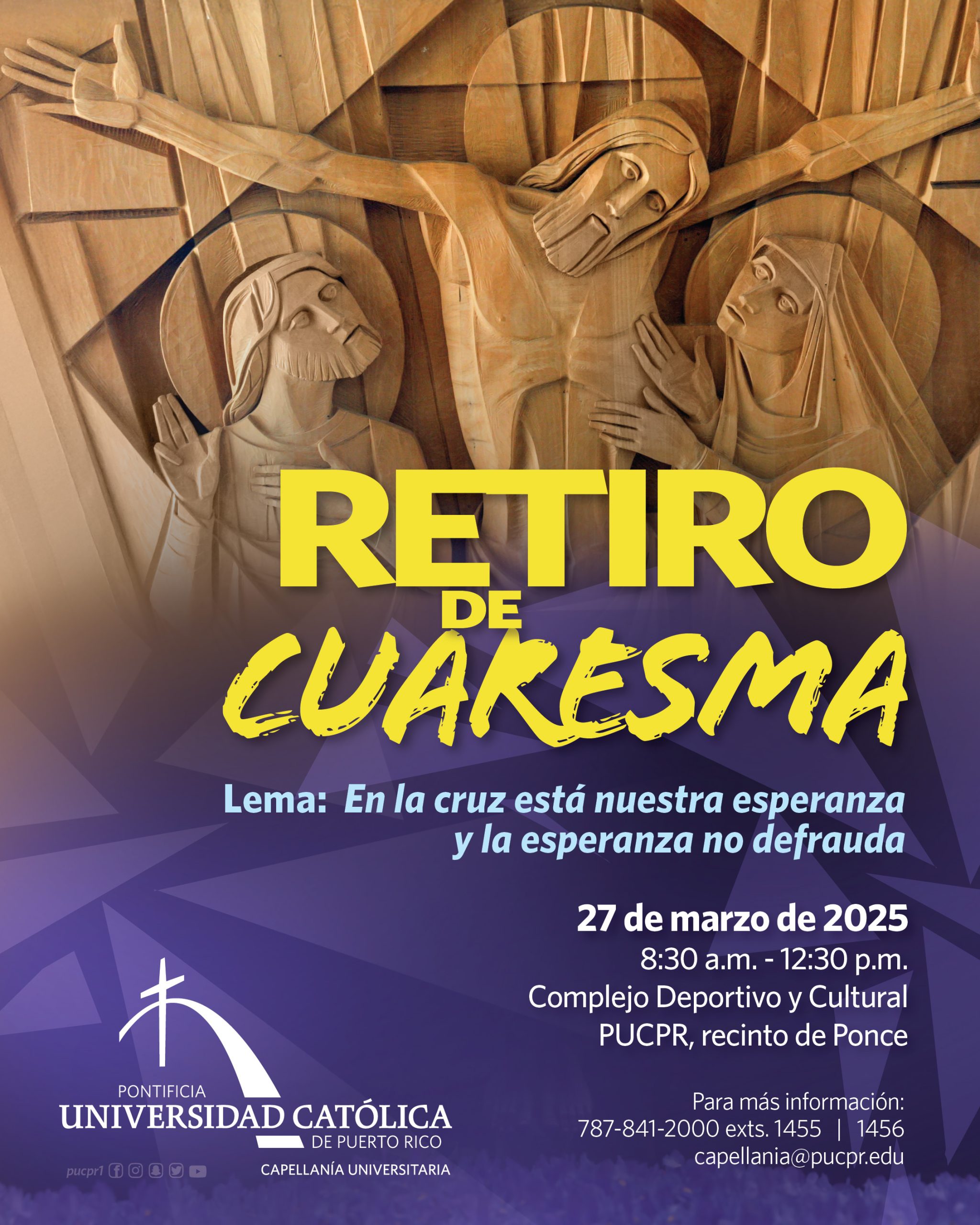 En la cruz está nuestra esperanza y la esperanza no defrauda By celimer_torres@pucpr.edu | March 20, 2025 La Capellanía invita al Retiro de Cuaresma Posted in General ← MicroPLantas Renace de C.E.I.B.A en la Universidad Católica del Oriente en ColombiaAntropología molecular y ADN antiguo en el Caribe →