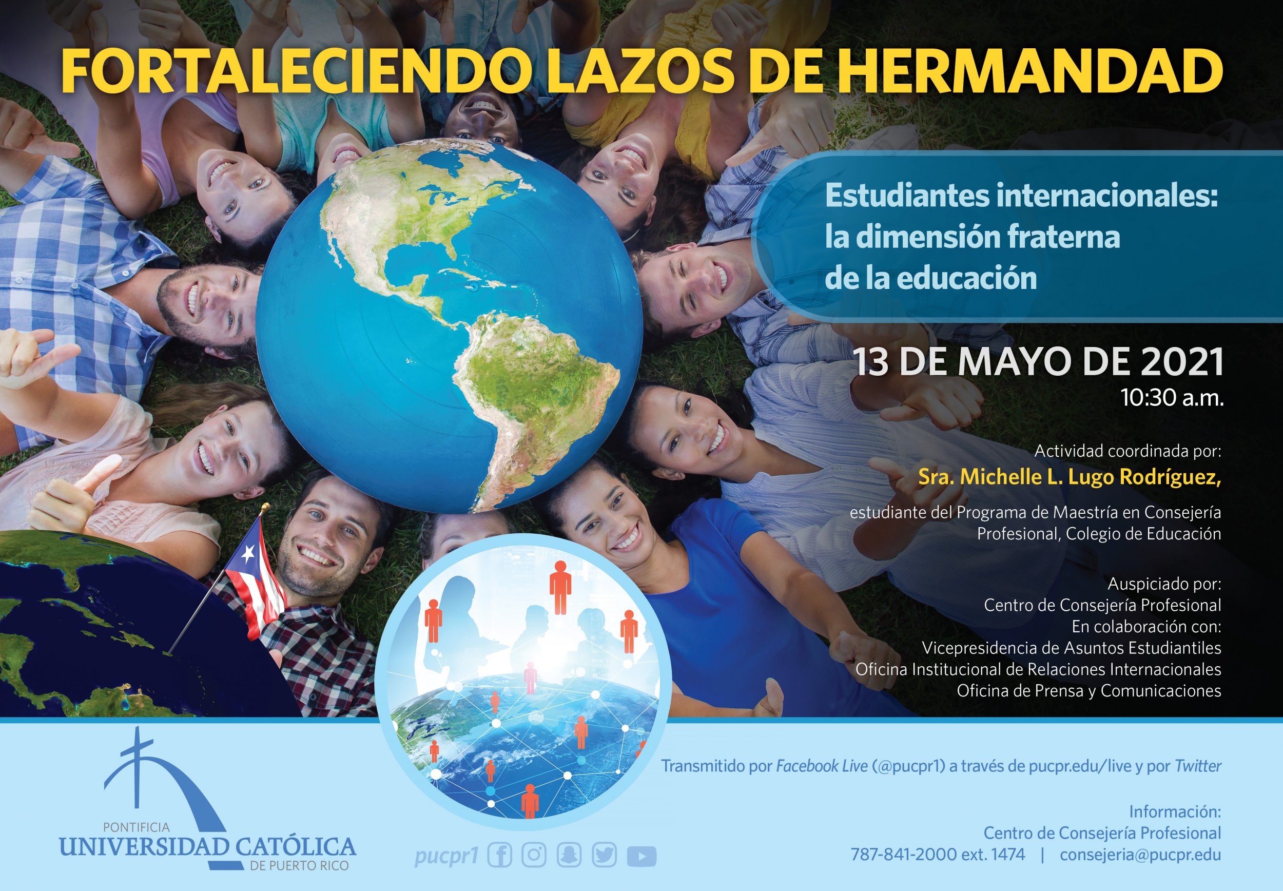 Encuentro virtual estudiantes internacionales By celimer_torres@pucpr.edu | May 6, 2021 Fortaleciendo lazos de hermandad. Transmisión disponible el 13 de mayo a las 10:30 a.m. Posted in Actividades ← “Todos somos discípulos misioneros en salida”Puerto Rico ante el nuevo escenario político en los Estados Unidos →