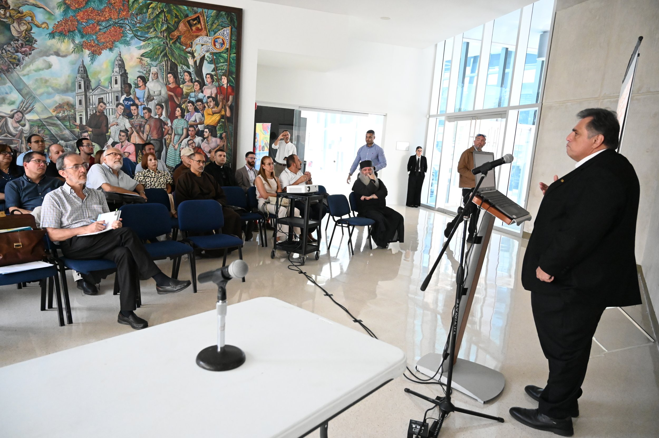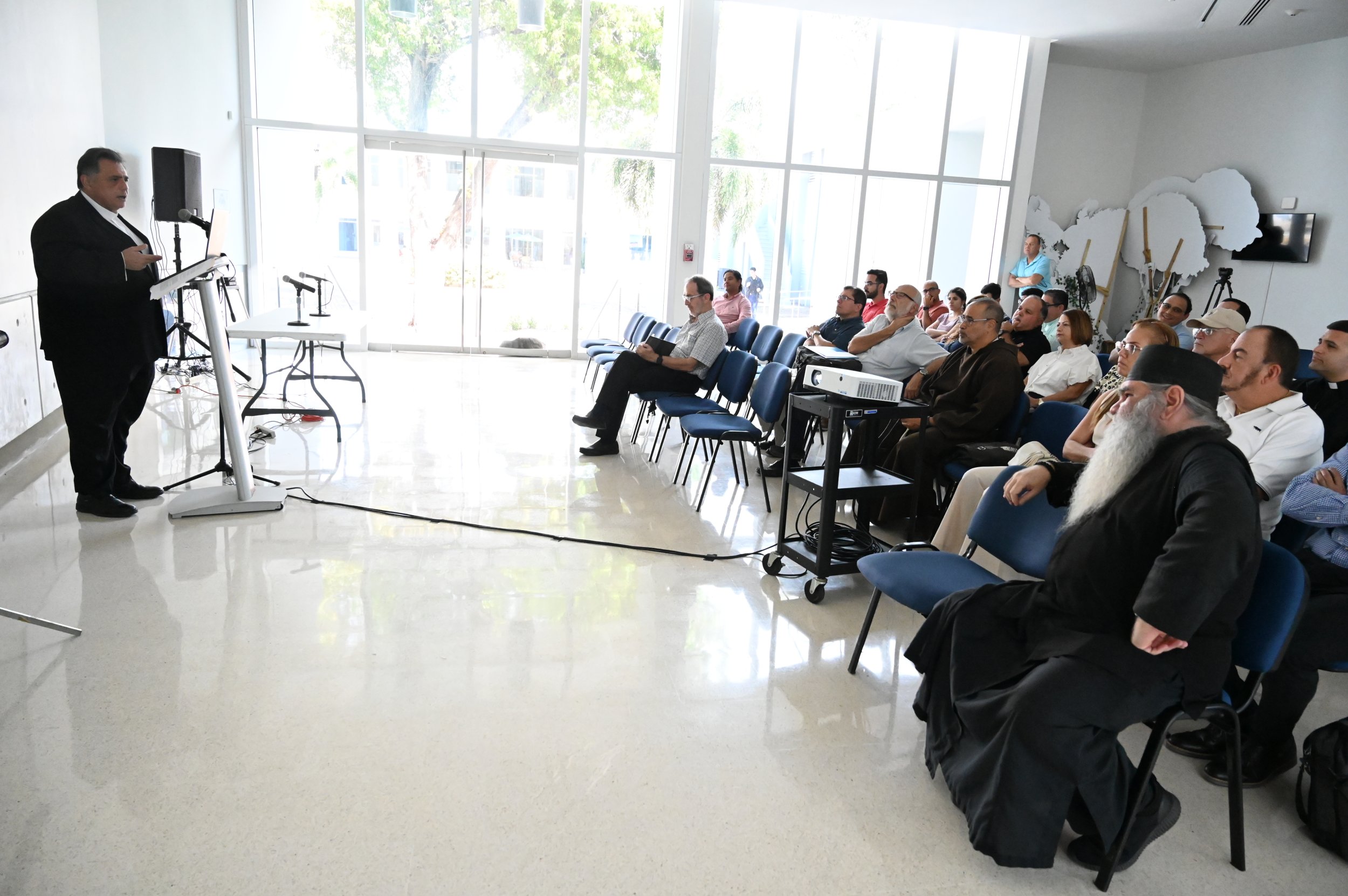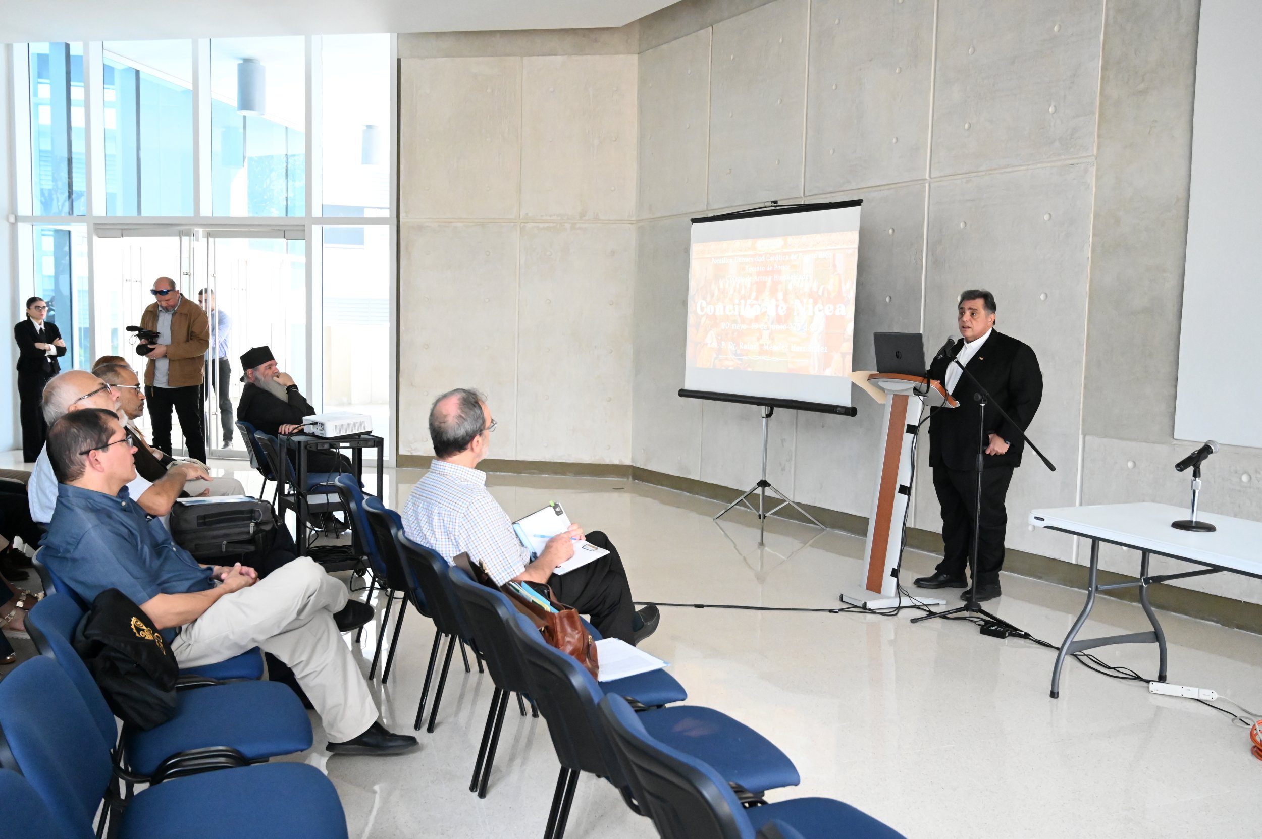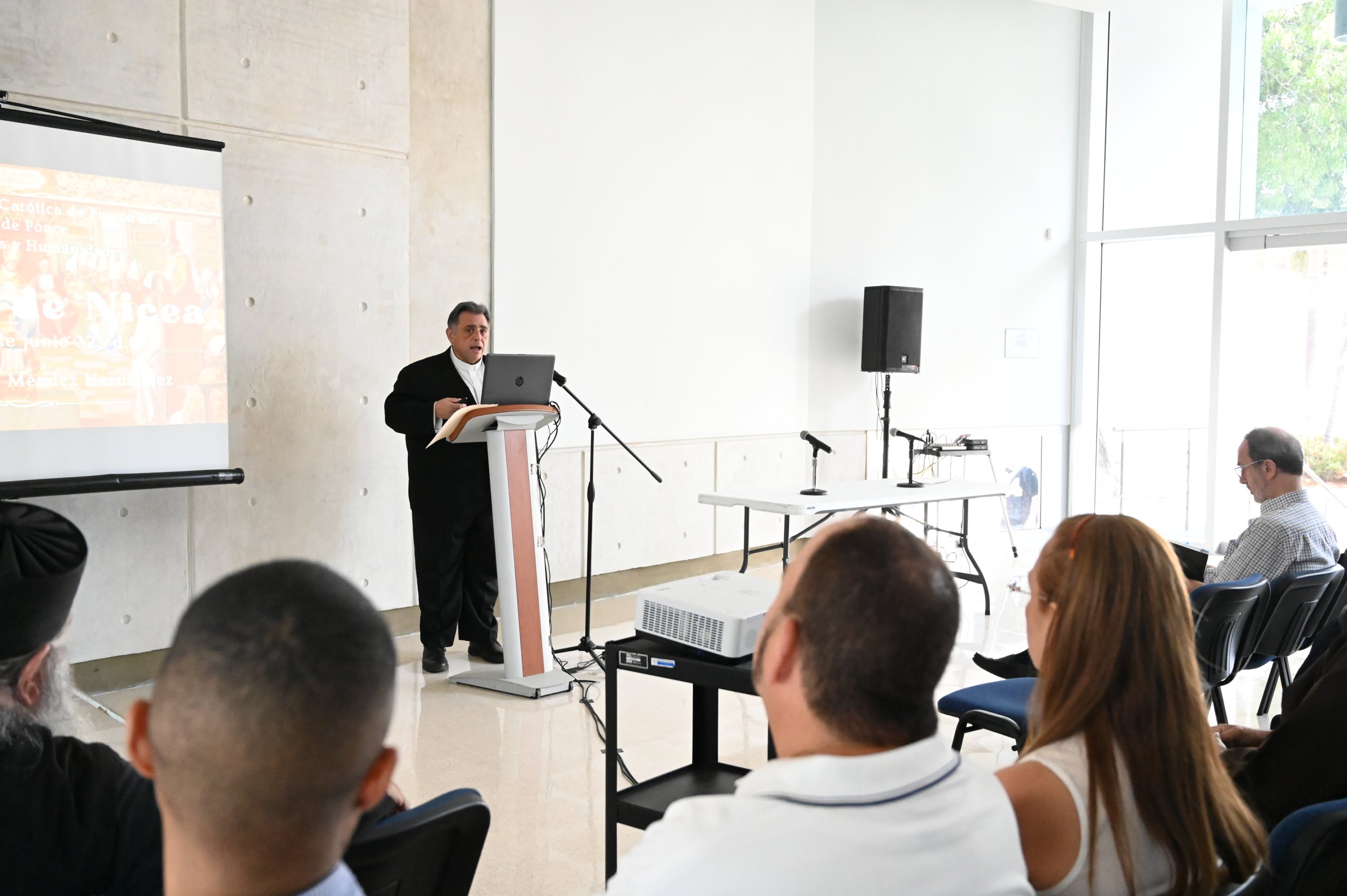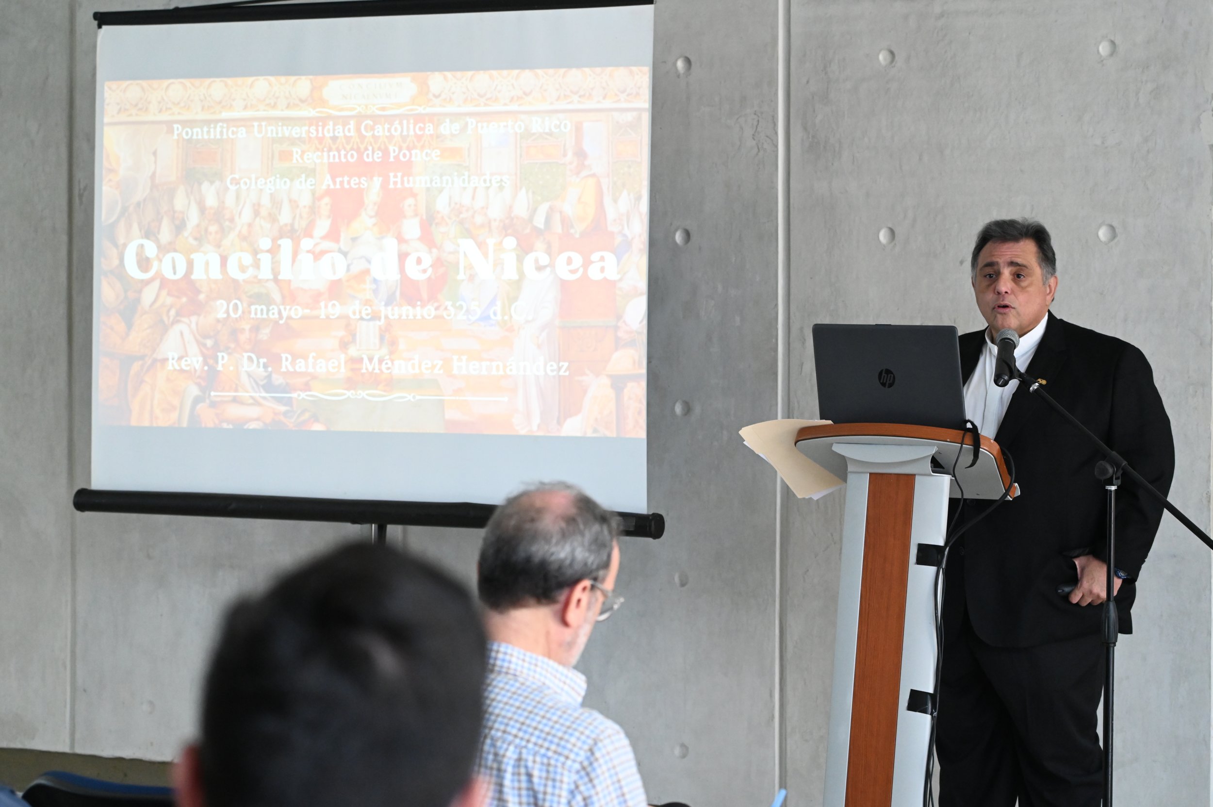 El conferenciante invitado fue el Rvdo. Dr. Rafael Méndez Hernández, profesor de la Escuela de Teología y del Departamento de Historia de la PUCPR.“La conferencia versó sobre el concilio de Nicea, su importancia y los frutos del Concilio. Estamos celebrando los 1700 años del Concilio de Nicea, un suceso que fue clave en la historia de la Iglesia. La gente no está consciente de cuán importante es pues este es el Concilio en el que se declaró que Jesucristo es Dios y que sentó la base de nuestro credo sobre todo esa expresión ‘Dios de Dios, luz de luz Dios Verdadero de Dios Verdadero, Engendrado no creado, de la misma naturaleza que el Padre por quien todo fue hecho’. Así que discutimos qué fue el concilio, qué provocó el concilio, la importancia del concilio y los frutos y consecuencias del mismo”, explicó el sacerdote.