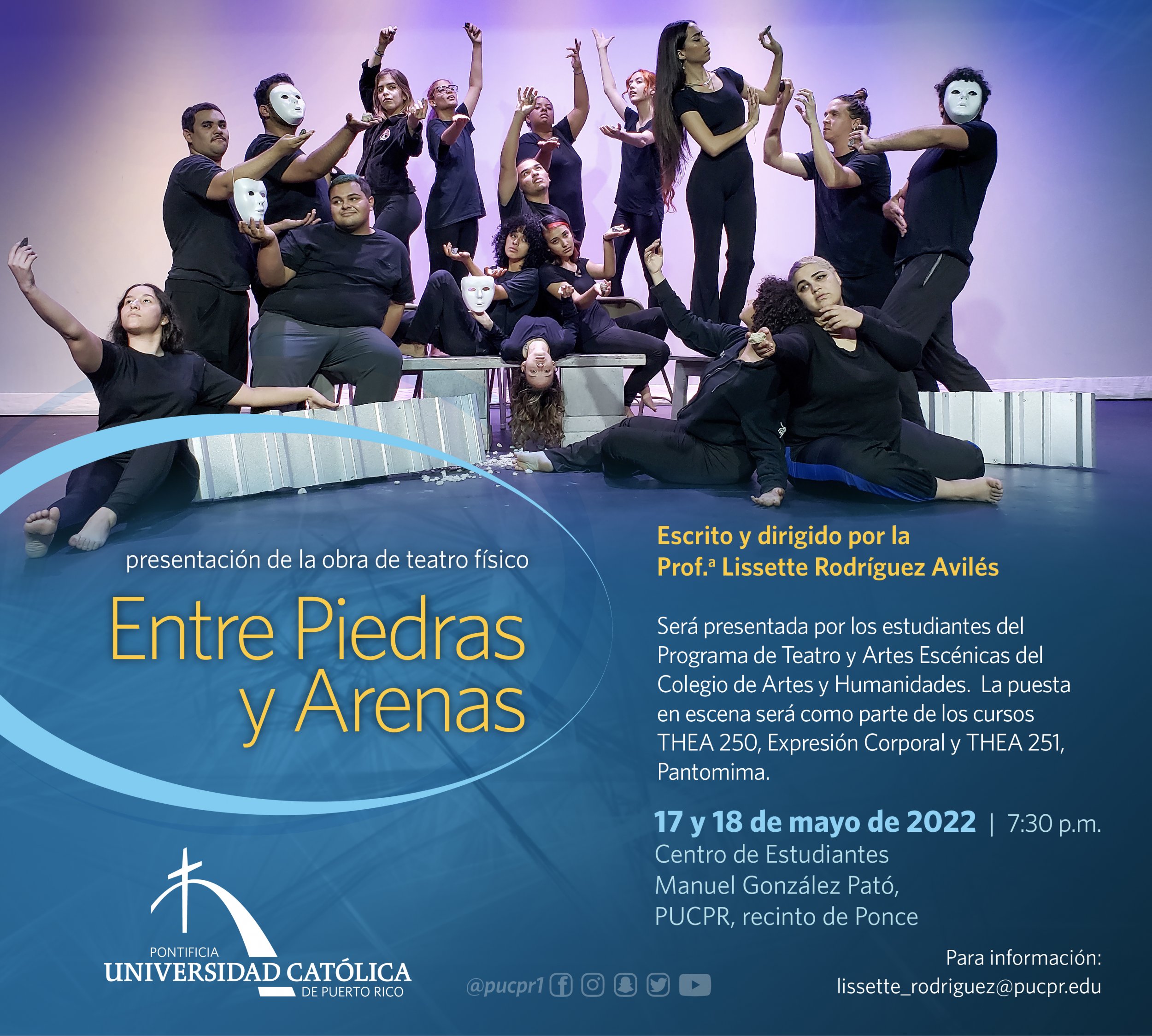 Entre Piedras y Arenas By celimer_torres@pucpr.edu | May 5, 2022 Los teatreros de los cursos Expresión Corporal y Pantomima presentan la pieza escrita y dirigida por la Prof.ª Lissette Rodríguez Avilés. Posted in General ← Bodas de SangreJornada de Musicoterapia: El valor de la musicoterapia en la sociedad →