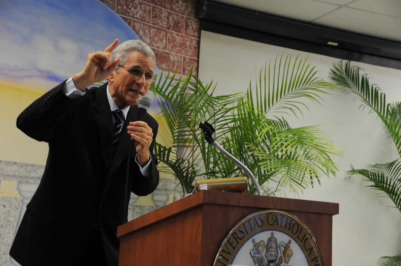 También, es considerado como uno de los mejores –por algunos el mejor- de Puerto Rico en la actualidad. Ha publicado diez libros, entre ellos Letra viva, una antología de su obra más fundamental. También, trabajó y colaboró con libros académicos, como los reconocidos Sueños y palabras y versiones actualizadas de la gramática y ortografía españolas.La magna actividad, auspiciada por el Departamento de Estudios Hispánicos de la PUCPR y El Sur Visita al Sur, Inc., tuvo lugar en la Sala Madre Teresa de Calcuta el pasado jueves, 15 de marzo de 2012. Estuvieron presentes la directora del mencionado departamento, profesora Caridad Álvarez, el decano del Colegio de Artes y Humanidades, profesor Alfonso Santiago y el presidente de la Institución, Dr. Jorge Iván Vélez Arocho. Por su parte, la doctora Ada Hilda Martínez de Alicea introdujo al prestigioso conferenciante.