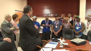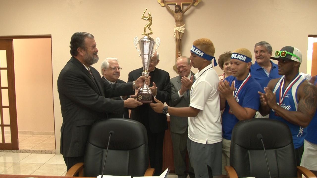 También, el Presidente recibió de manos del equipo campeón el magno trofeo del primer lugar. Los atletas reconocieron que esto es solo el comienzo de una ardua tarea como estudiantes. “Esto es un logro de equipo, representamos dignamente a la Pontificia Universidad Católica de Puerto Rico. Por eso el campeonato se lo queremos entregar a usted. Vamos a ser mejores estudiantes y mejores ciudadanos”, recalcó Egui Rodríguez, el capitán del equipo.