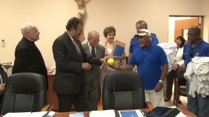 En un evento sin precedentes, la presea de oro del equipo de softbol brilló en la Sede de la Junta de Síndicos de la Pontificia Universidad Católica de Puerto Rico. Es que el presidente de la PUCPR, Dr. Jorge Iván Vélez Arocho, junto a los miembros de la Junta de la Universidad, recibieron a los Pioneros para celebrar el campeonato que no se lograba desde la década de los ’60.