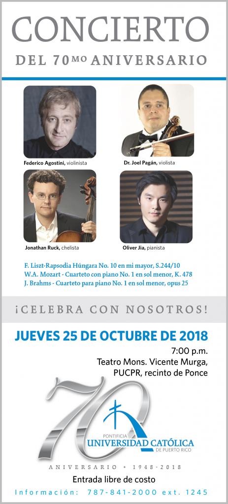 Para celebrar este momento especial, la PUCPR presenta en concierto al violinista Federico Agostini; al violista y artista residente, Dr. Joel Pagán; a Jonathan Ruck, chelista; y a Oliver Jia, pianista. El cuarteto tocará piezas de los compositores Wolfgang Amadeus Mozart y Johannes Brahms.