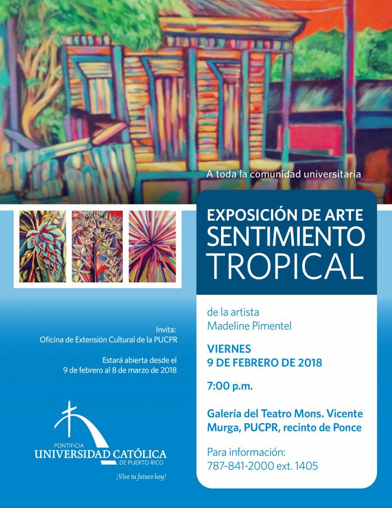 Exposición de arte Sentimiento Tropical By celimer_torres@pucpr.edu | February 7, 2018 Posted in General ← ¿Dificultad para continuar estudiando luego del huracán María?Magistral junte internacional →