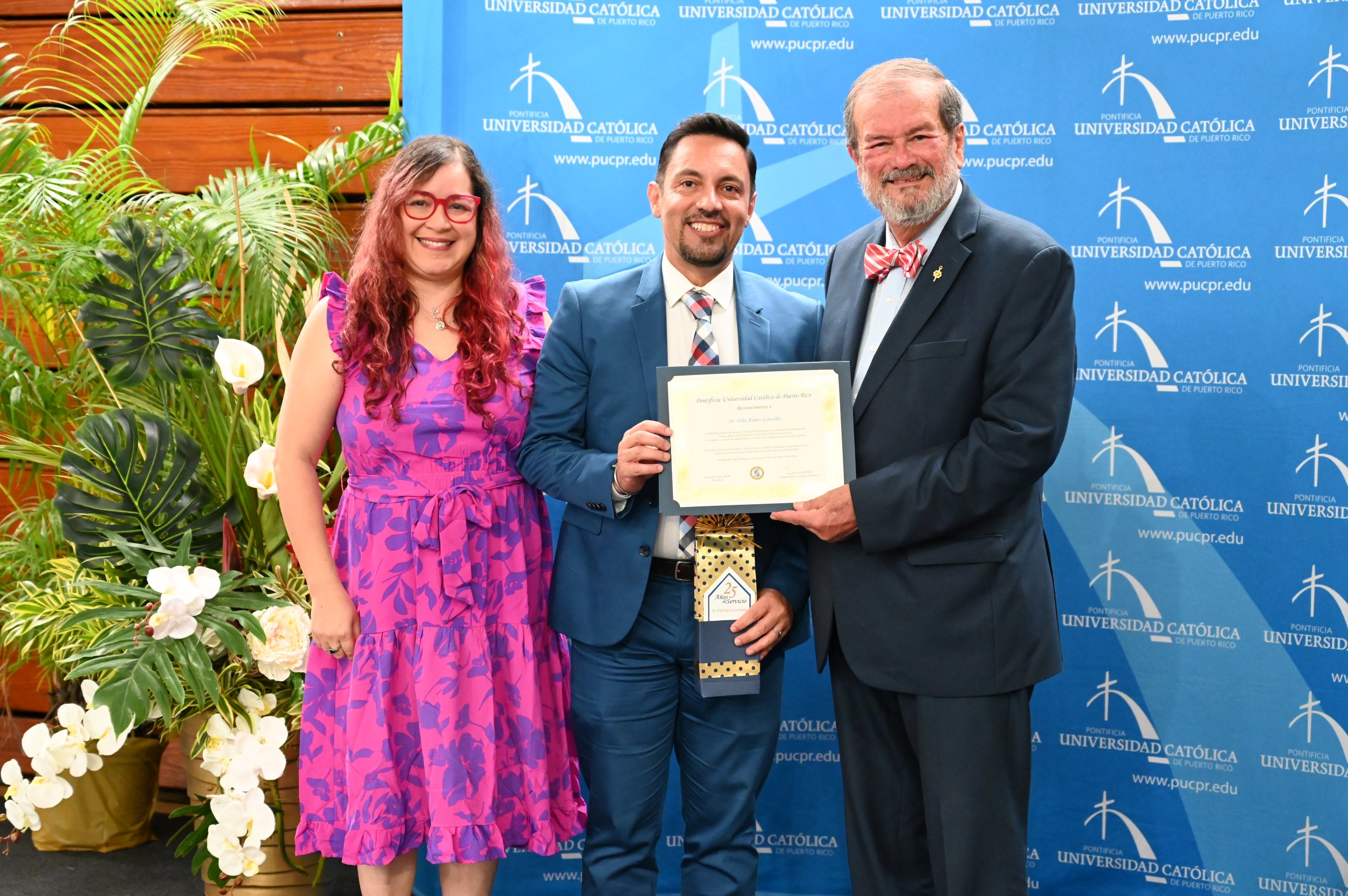 Por su parte, el Dr. Félix Ramos, profesor del Colegio de Ciencias de la Conducta y Asuntos de la Comunidad fue reconocido por cumplir 25 años de servicio en la Institución. Ante esto manifestó “En estos 25 años he visto el progreso de cada uno de nuestros estudiantes, en 25 años tenemos ya estudiantes profesionales en diferentes áreas en nuestra sociedad y, para mí, pues un orgullo poder servir a nuestra comunidad a través de la enseñanza”.