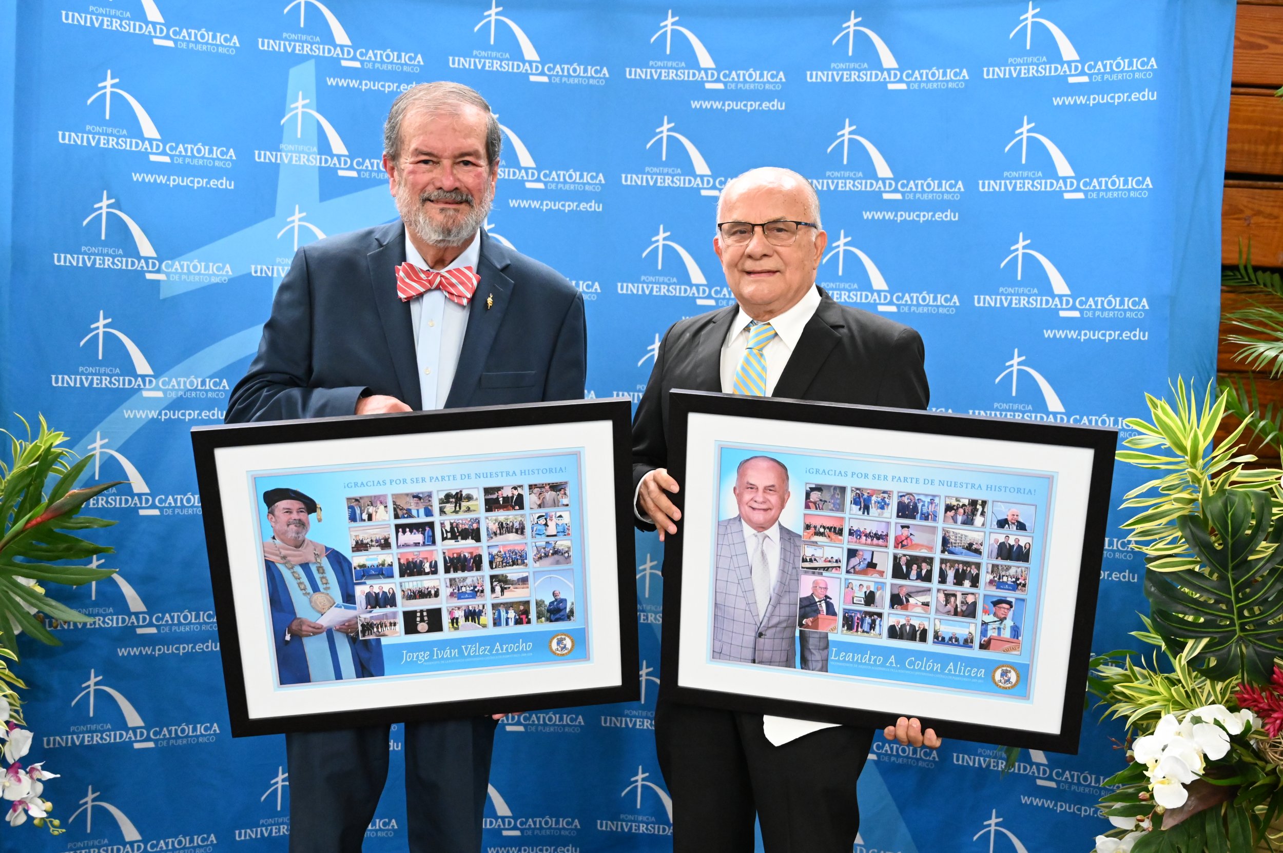Dr. Jorge Iván Vélez Arocho y Dr. Leandro Colón Alicea, en nombre de los vicepresidentes, decanos, directores, facultad y personal administrativo deseamos agradecerles su contribución a la transformación de la Universidad durante los pasados 14.5 años de incumbencia como presidente y 13 años como vicepresidente de Asuntos Académicos respectivamente. Hoy les decimos gracias, gracias por ser parte de nuestra historia” expresó la Dra. Muñiz al momento de reconocer al Dr. Vélez Arocho y al Dr. Colón Alicea.